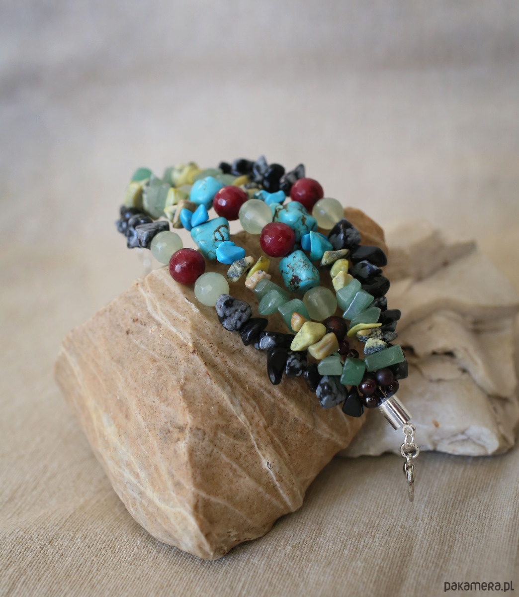 Bransoletka w stylu boho, wykonana z różnobarwnych koralików półszlachetnych, w tonacji wielobarwnej. Zapięcie ze stali w kolorze srebra. Pasuje na nadgarstek o obwodzie 15-16 cm.