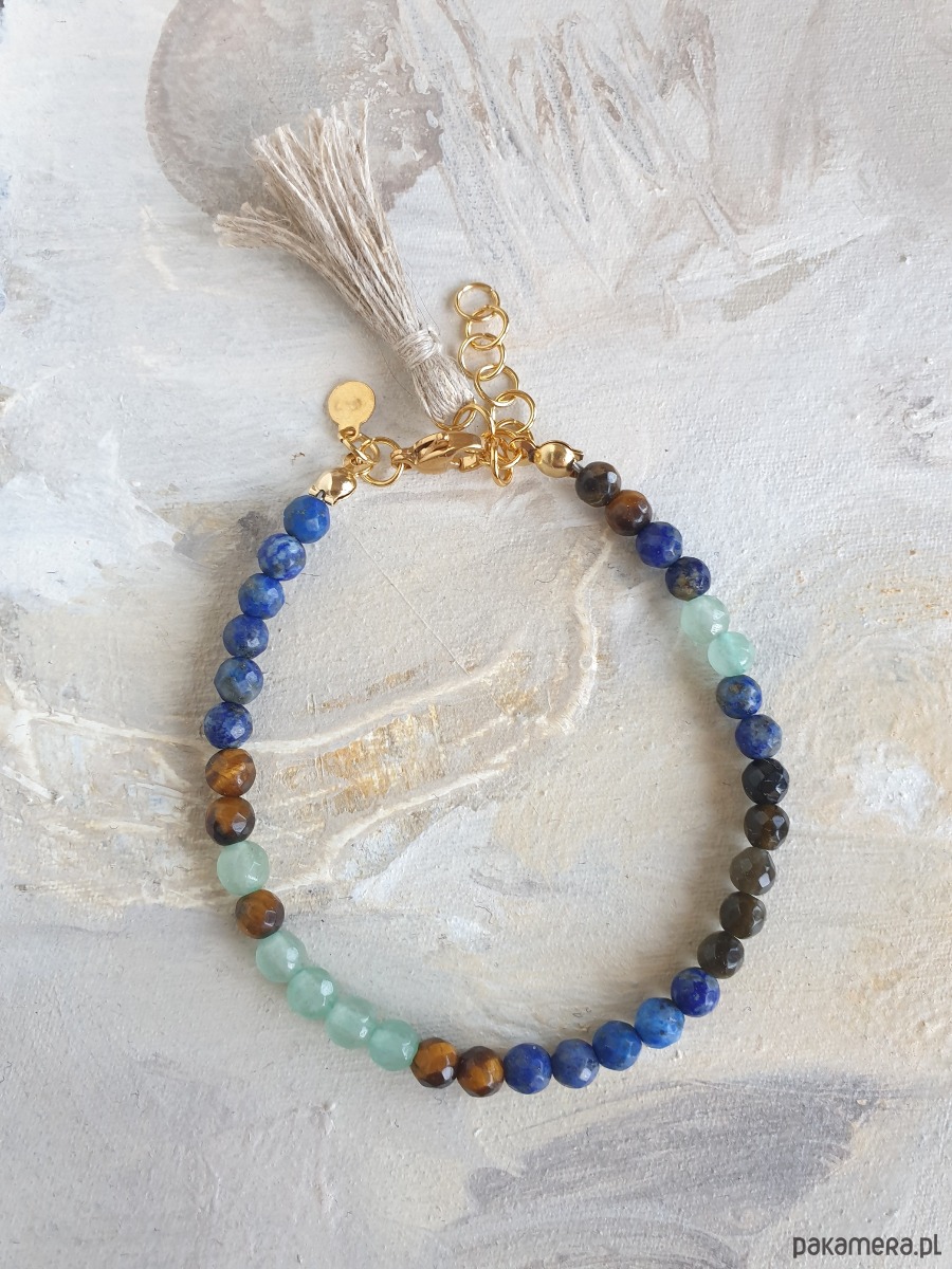 Minimalistyczna delikatna bransoletka BOHO. Tworzona ręcznie z kamieni naturalnych, elementów ze stali szlachetnej złoconej (antyalergicznej) i lnianego chwosta. W tej - fasetowana kulka lapis lazuli, tygrysie oko, jadeit zielony, obsydian złocisty