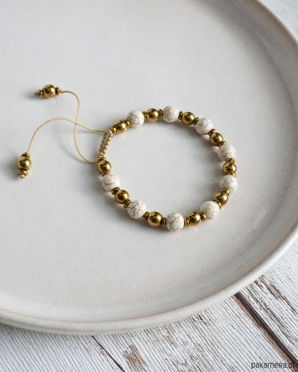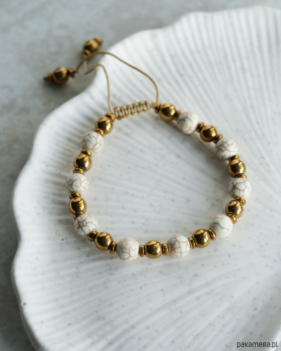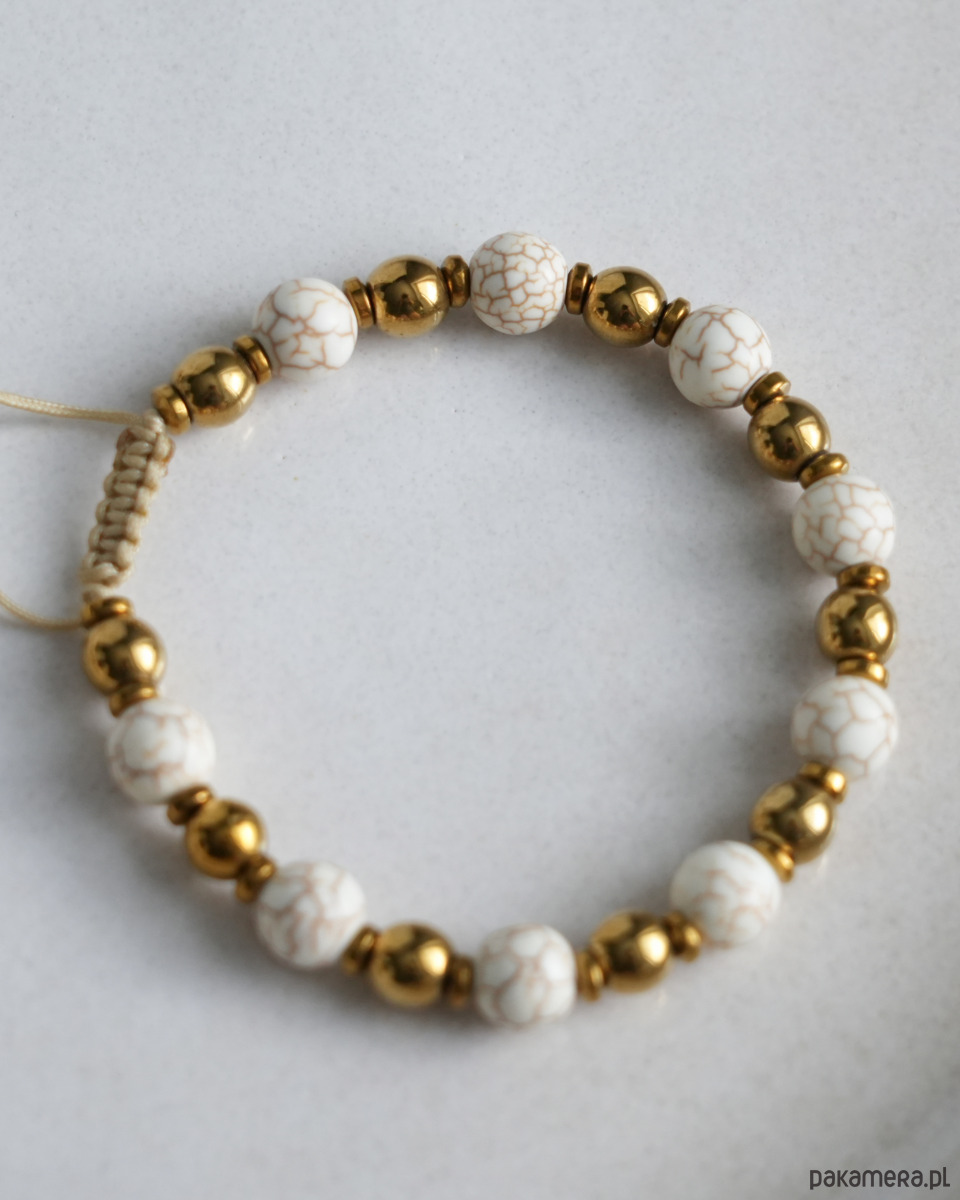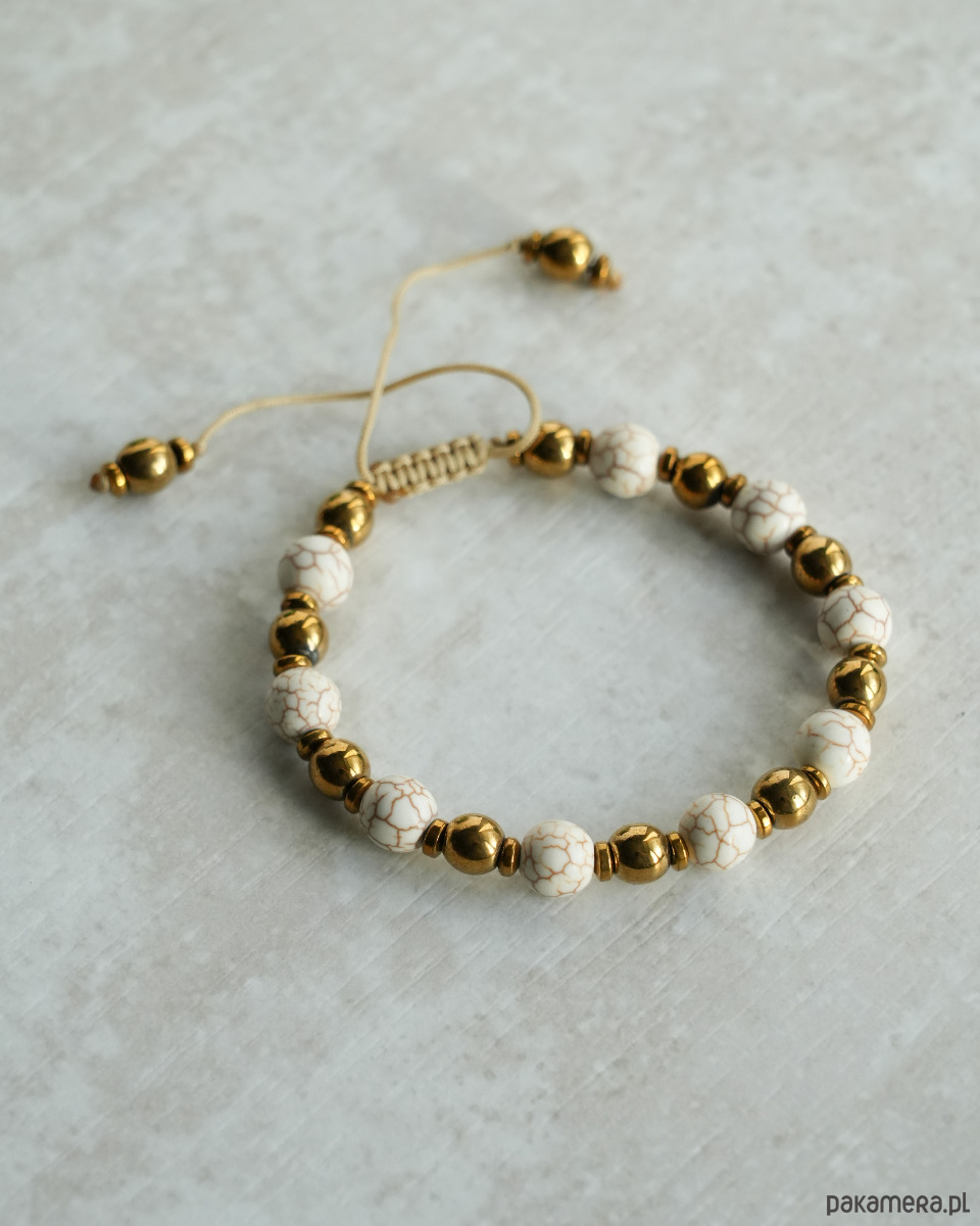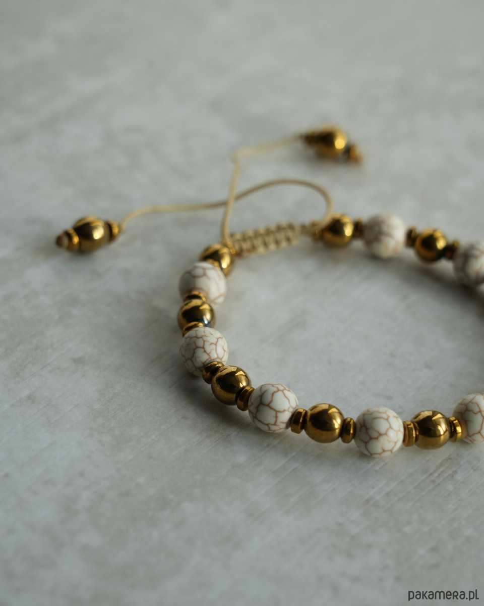Dość masywna bransoletka w stylu boho wykonana z kremowego HOWLITU i złotego HEMATYTU na beżowym, mocnym sznureczku. Bransoletka posiada przesuwane "zapięcie" wykonane w technice makramy, dzięki czemu jest regulowana i ma uniwersalny rozmiar. Będzie się super prezentować w połączeniu z innymi bransoletkami ze złotem i kamieniami w różnych kolorach.