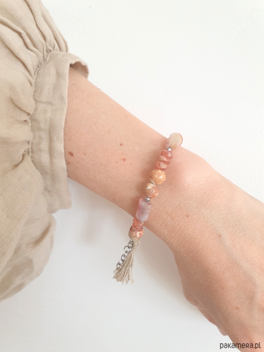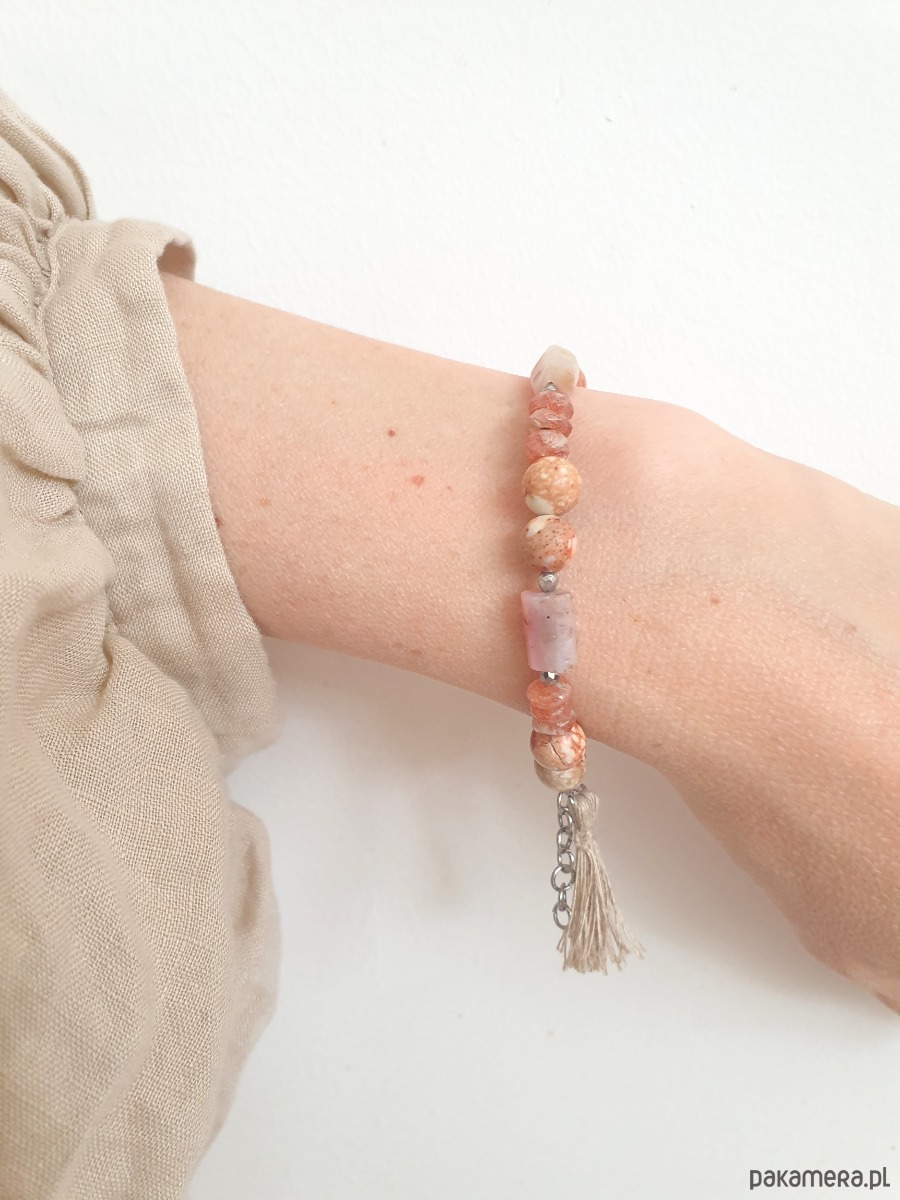 Boho bransoletka tworzona ręcznie z kamieni naturalnych, elementów ze stali szlachetnej (antyalergicznej) W tej bransoletce kamień: opal indyjski różowy, jaspis cesarski, kamień słoneczny. Super wygląda z innymi bransoletkami w zestawie.