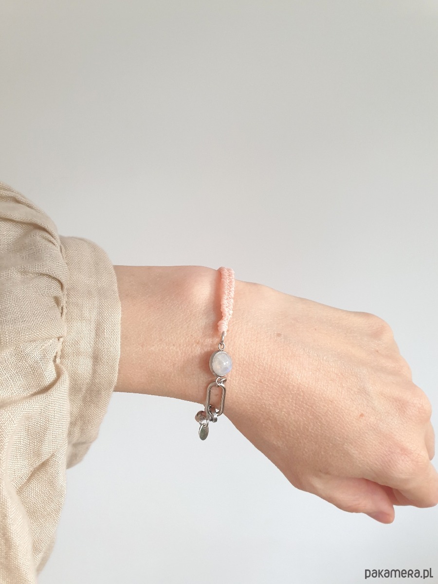 Bransoletka BOHO ręcznie tkana, jasny róż z kamieniem księżycowym
