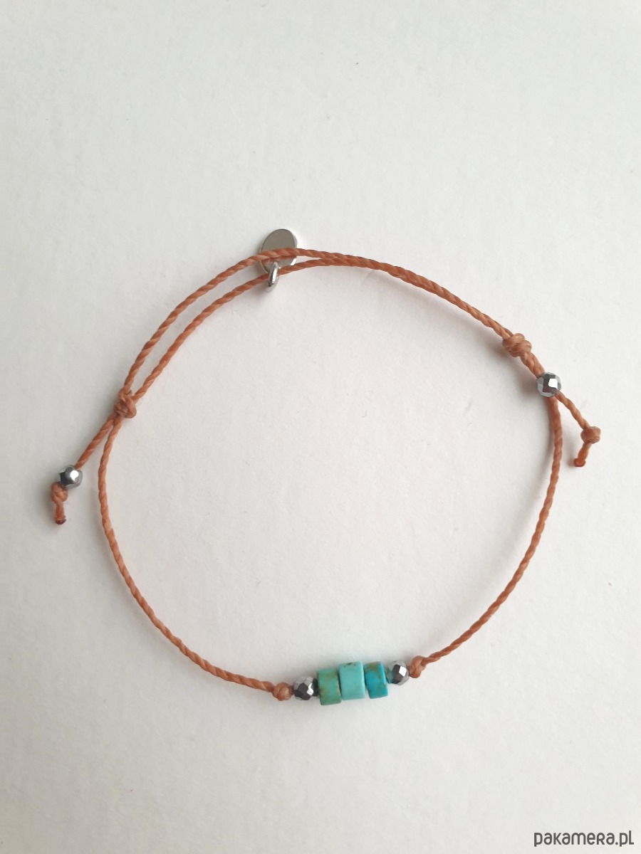 Delikatna bransoletka na beżowym sznurku z kamieniami naturalnymi i elementami ze stali szlachetnej. W tej - fasetowany hematyt, turkusy. Bransoletkę można dopasować rozmiarem do dłoni. Sznurek polyestrowy woskowany marki Linhasita którego cechuje wysoka odporność na rozciąganie i zadarcia, jest wodoodporny. Bransoletka tworzona na zamówienie, z tych samych elementów i w tych samych kolorach jednak może się minimalnie różnić bo każdy kamień jest wyjątkowy. Bransoletka do samodzielnego zawiązania na zwykły supełek, lub na zdjęciu masz dwie dodatkowe propozycje zawiązania 1. dwa węzełki przesuwne 2. węzeł marynarski
