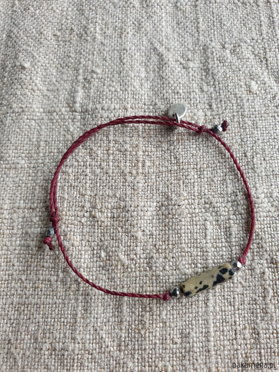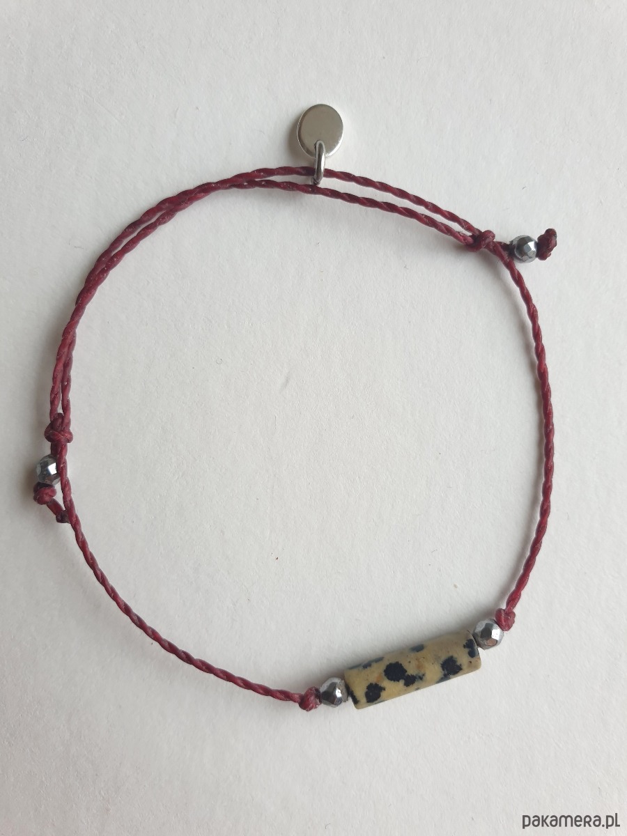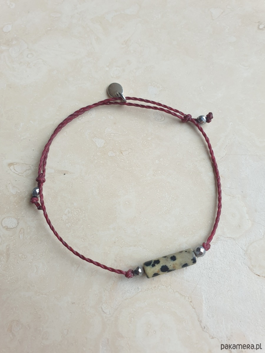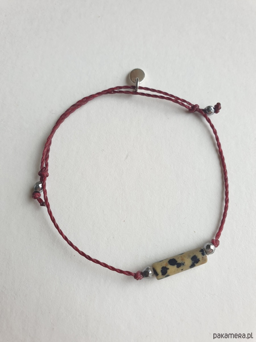 Delikatna bransoletka na bordowym sznurku z kamieniami naturalnymi i elementami ze stali szlachetnej. W tej - fasetowany srebrny hematyt, walec jaspis dalmatyński. Bransoletkę można dopasować rozmiarem do dłoni. Sznurek polyestrowy woskowany marki Linhasita którego cechuje wysoka odporność na rozciąganie i zadarcia, jest wodoodporny. Bransoletka tworzona na zamówienie, z tych samych elementów i w tych samych kolorach jednak może się minimalnie różnić bo każdy kamień jest wyjątkowy.