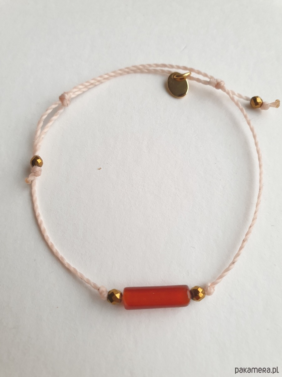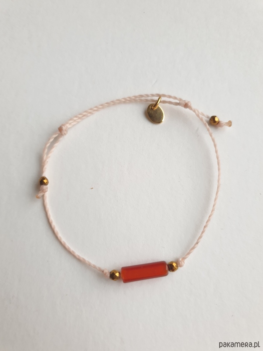 Delikatna bransoletka na cielistym sznurku z kamieniami naturalnymi i elementami ze stali szlachetnej złoconej. W tej - fasetowany hematyt, walec karneol. Bransoletkę można dopasować rozmiarem do dłoni. Sznurek polyestrowy woskowany marki Linhasita którego cechuje wysoka odporność na rozciąganie i zadarcia, jest wodoodporny. Bransoletka tworzona na zamówienie, z tych samych elementów i w tych samych kolorach jednak może się minimalnie różnić bo każdy kamień jest wyjątkowy.