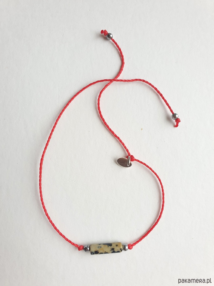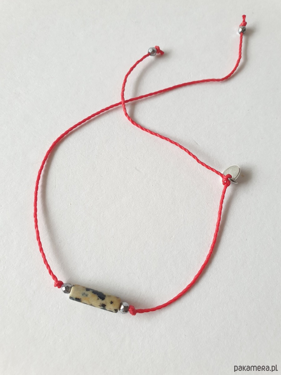 Delikatna bransoletka na czerwonym sznurku z kamieniami naturalnymi i elementami ze stali szlachetnej. W tej - fasetowany hematyt, walec jaspis dalmatyński. Bransoletkę można dopasować rozmiarem do dłoni. Sznurek polyestrowy woskowany marki Linhasita którego cechuje wysoka odporność na rozciąganie i zadarcia, jest wodoodporny. Bransoletka tworzona na zamówienie, z tych samych elementów i w tych samych kolorach jednak może się minimalnie różnić bo każdy kamień jest wyjątkowy. Bransoletka do samodzielnego zawiązania na zwykły supełek, lub na zdjęciu masz dwie dodatkowe propozycje zawiązania 1. dwa węzełki przesuwne 2. węzeł marynarski