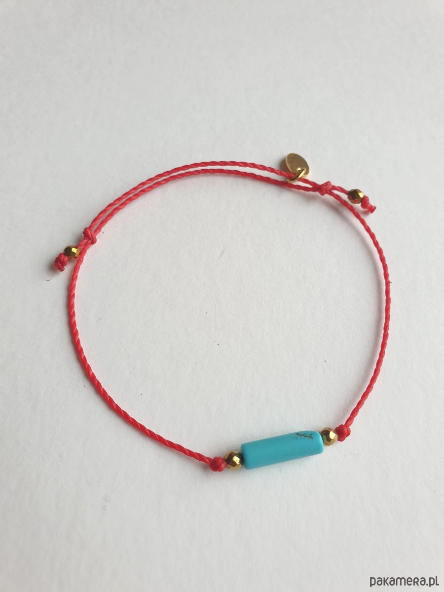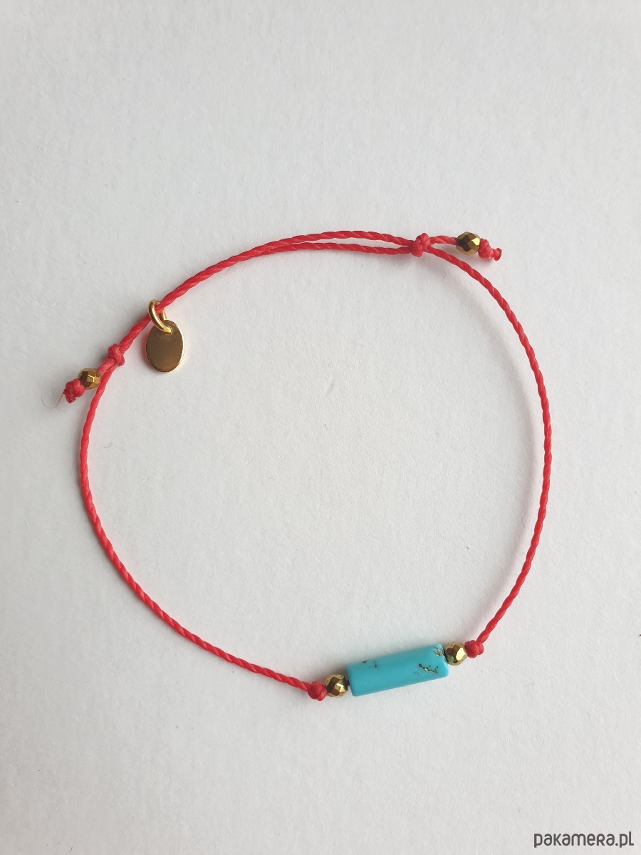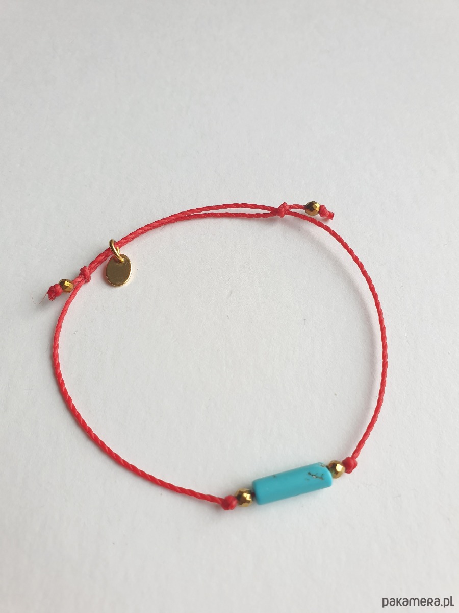 Delikatna bransoletka na czerwonym sznurku z kamieniami naturalnymi i elementami ze stali szlachetnej złoconej. W tej - fasetowany złoty hematyt, walec morganit turkusowy. Bransoletkę można dopasować rozmiarem do dłoni. Sznurek polyestrowy woskowany marki Linhasita którego cechuje wysoka odporność na rozciąganie i zadarcia, jest wodoodporny. Bransoletka tworzona na zamówienie, z tych samych elementów i w tych samych kolorach jednak może się minimalnie różnić bo każdy kamień jest wyjątkowy.