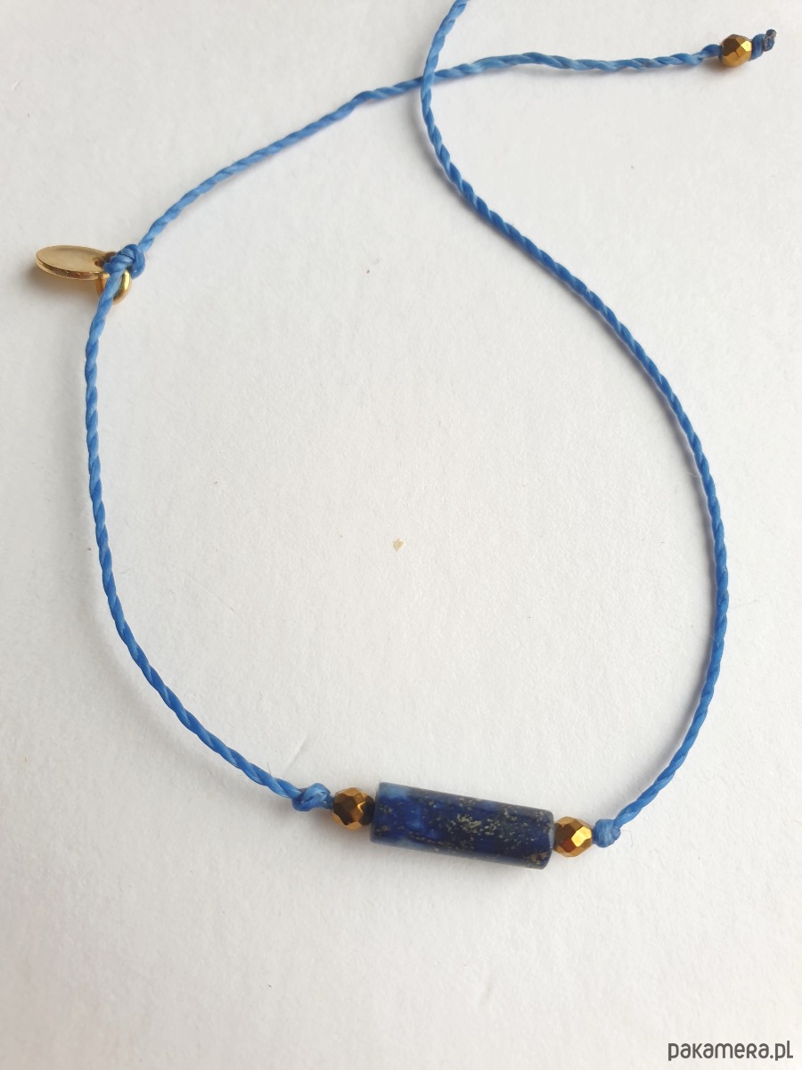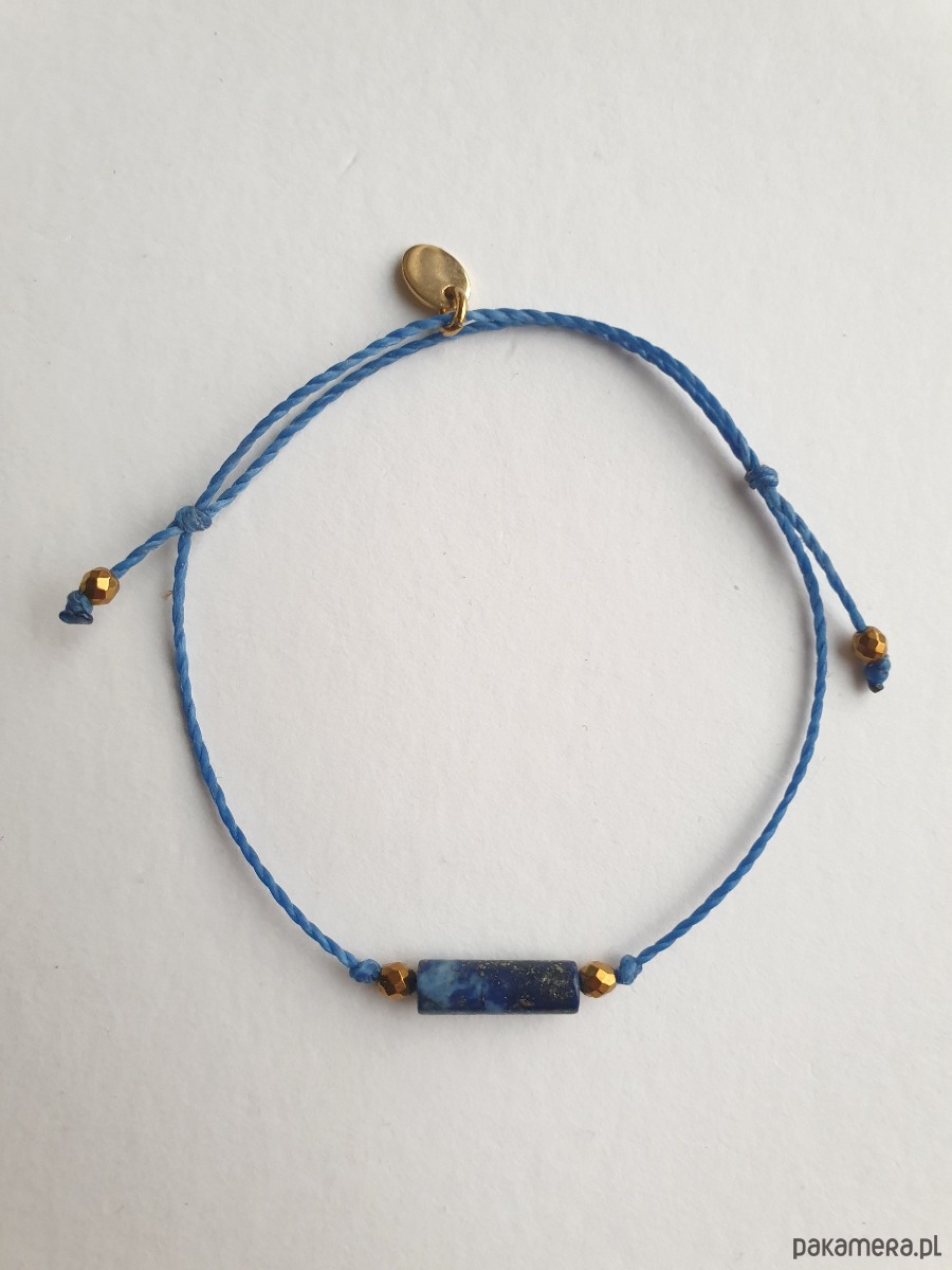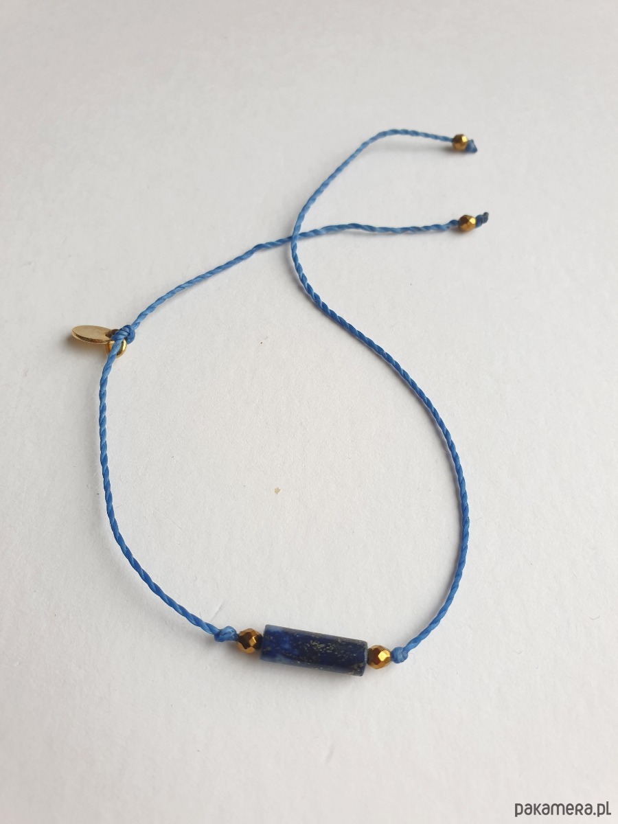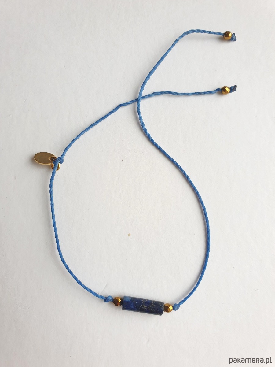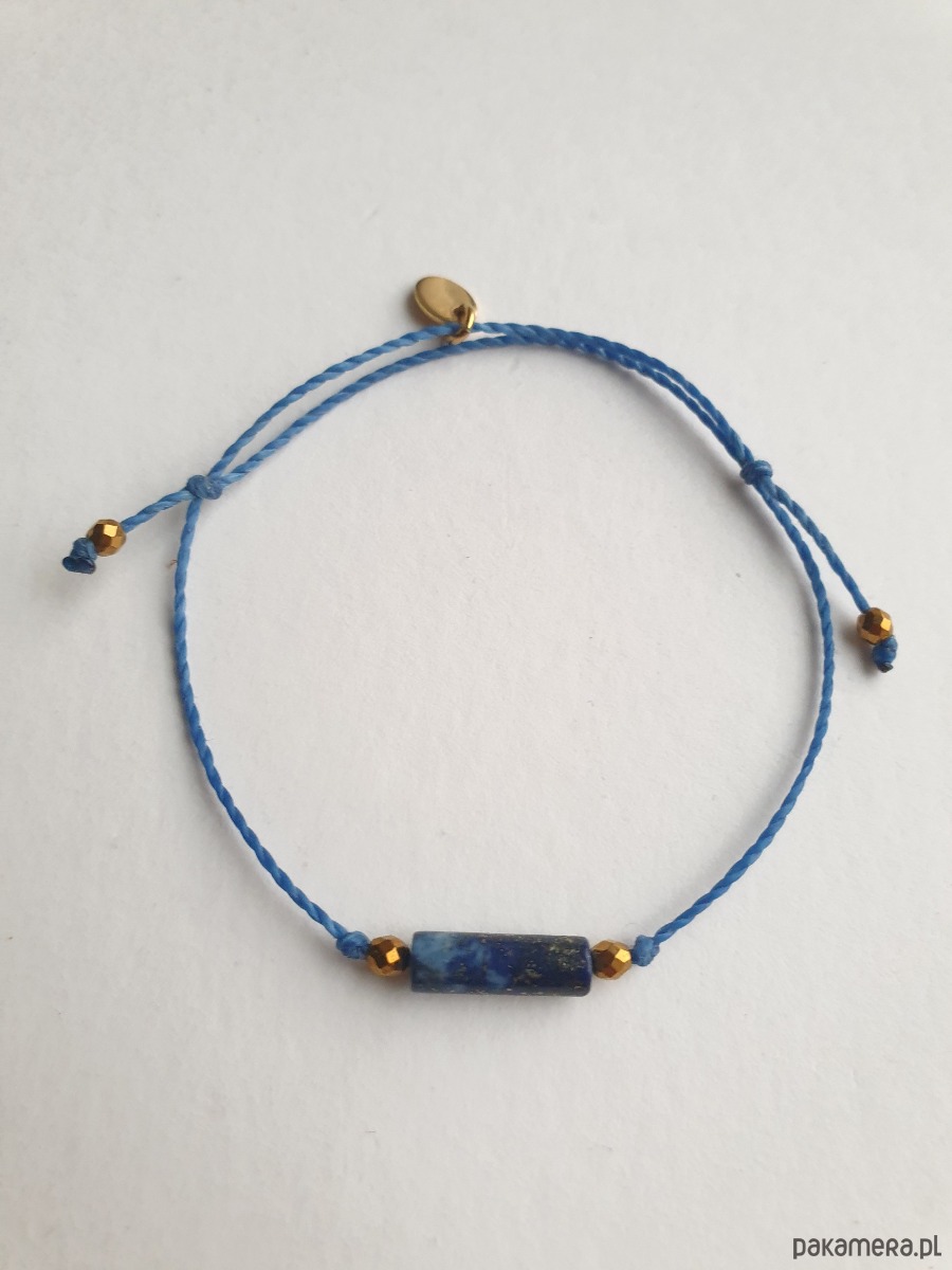 Delikatna bransoletka na granatowym (szafirowym, ultramaryna niebieski) sznurku z kamieniami naturalnymi i elementami ze stali szlachetnej złoconej. W tej - fasetowany złoty hematyt, walec lapis lazuli. Bransoletkę można dopasować rozmiarem do dłoni. Sznurek polyestrowy woskowany marki Linhasita którego cechuje wysoka odporność na rozciąganie i zadarcia, jest wodoodporny. Bransoletka tworzona na zamówienie, z tych samych elementów i w tych samych kolorach jednak może się minimalnie różnić bo każdy kamień jest wyjątkowy. Bransoletka do samodzielnego zawiązania na zwykły supełek, lub na zdjęciu masz dwie dodatkowe propozycje zawiązania 1. dwa węzełki przesuwne 2. węzeł marynarski