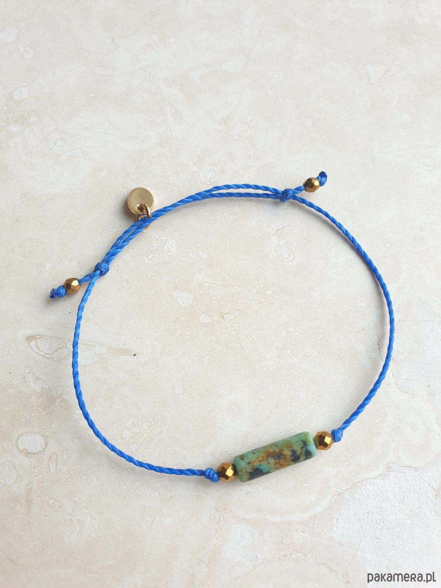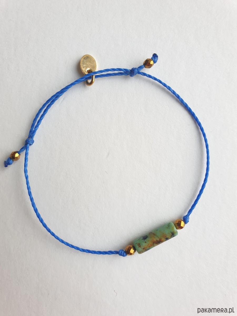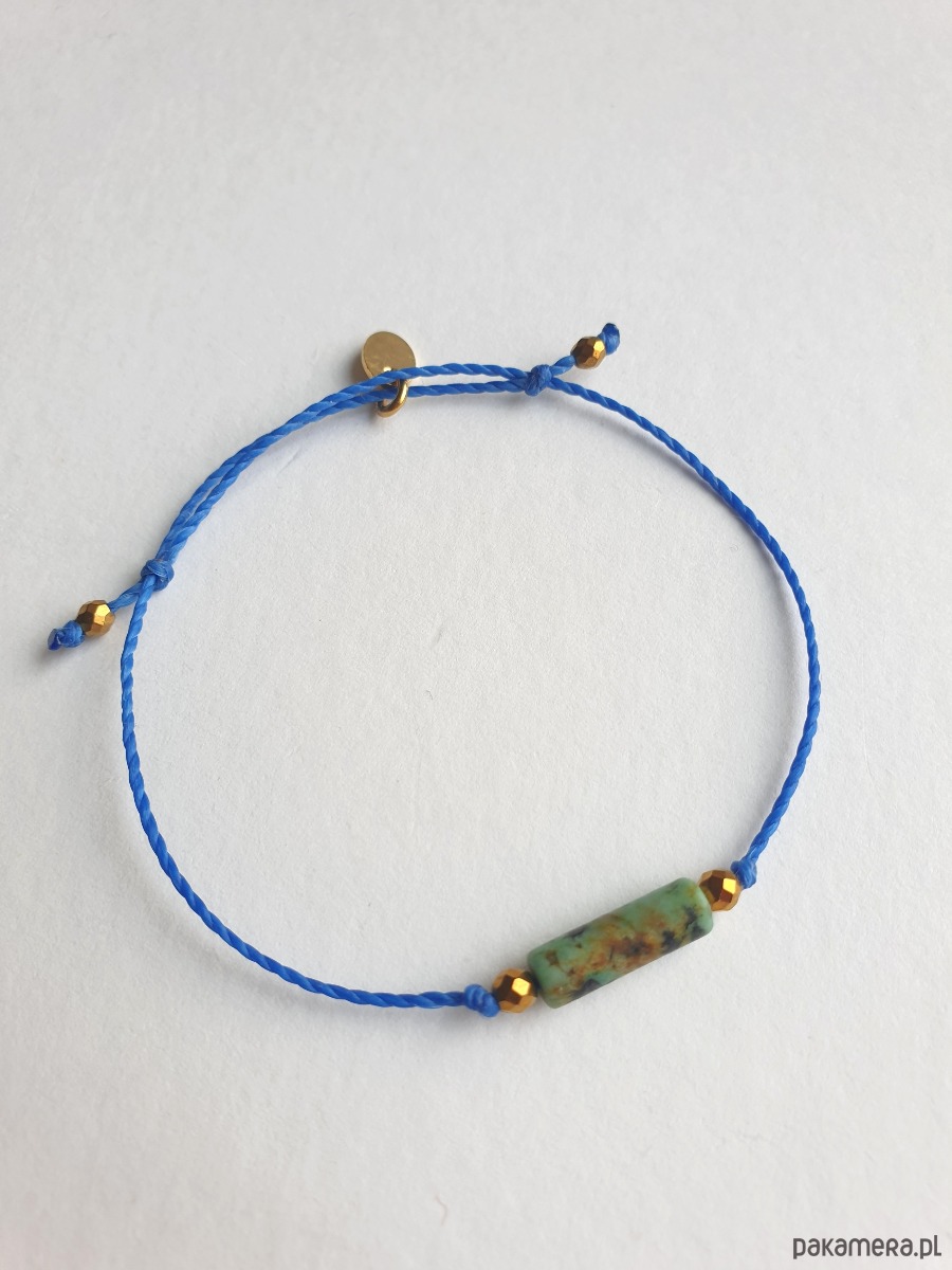 Delikatna bransoletka na granatowym (szafirowym, ultramaryna niebieski) sznurku z kamieniami naturalnymi i elementami ze stali szlachetnej złoconej. W tej - fasetowany złoty hematyt, walec z naturalnego turkusu afrykańskiego. Bransoletkę można dopasować rozmiarem do dłoni. Sznurek polyestrowy woskowany marki Linhasita którego cechuje wysoka odporność na rozciąganie i zadarcia, jest wodoodporny. Bransoletka tworzona na zamówienie, z tych samych elementów i w tych samych kolorach jednak może się minimalnie różnić bo każdy kamień jest wyjątkowy.