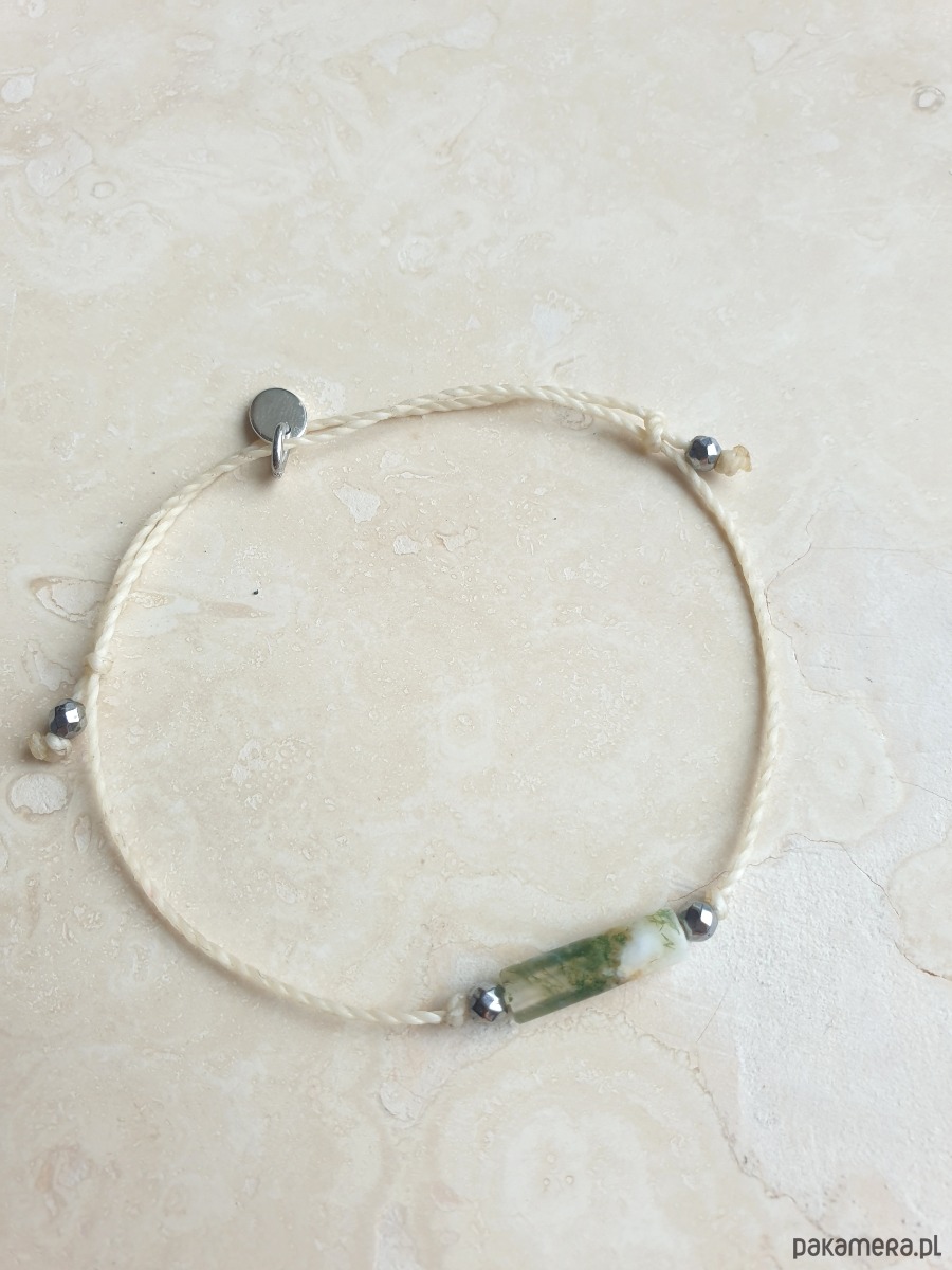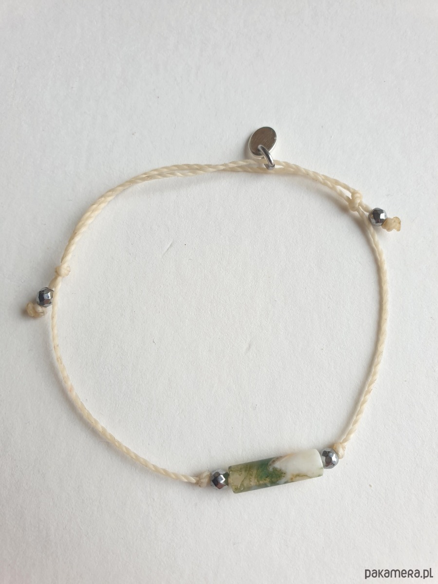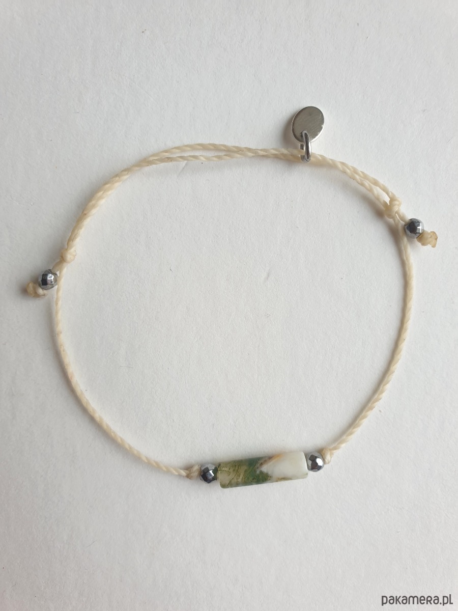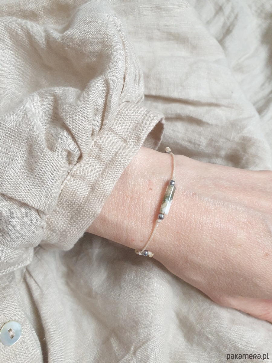 Delikatna bransoletka na kremowym sznurku z kamieniami naturalnymi i elementami ze stali szlachetnej. W tej - fasetowany srebrny hematyt, walec agat mszysty. Bransoletkę można dopasować rozmiarem do dłoni. Sznurek polyestrowy woskowany marki Linhasita którego cechuje wysoka odporność na rozciąganie i zadarcia, jest wodoodporny. Bransoletka tworzona na zamówienie, z tych samych elementów i w tych samych kolorach jednak może się minimalnie różnić bo każdy kamień jest wyjątkowy.