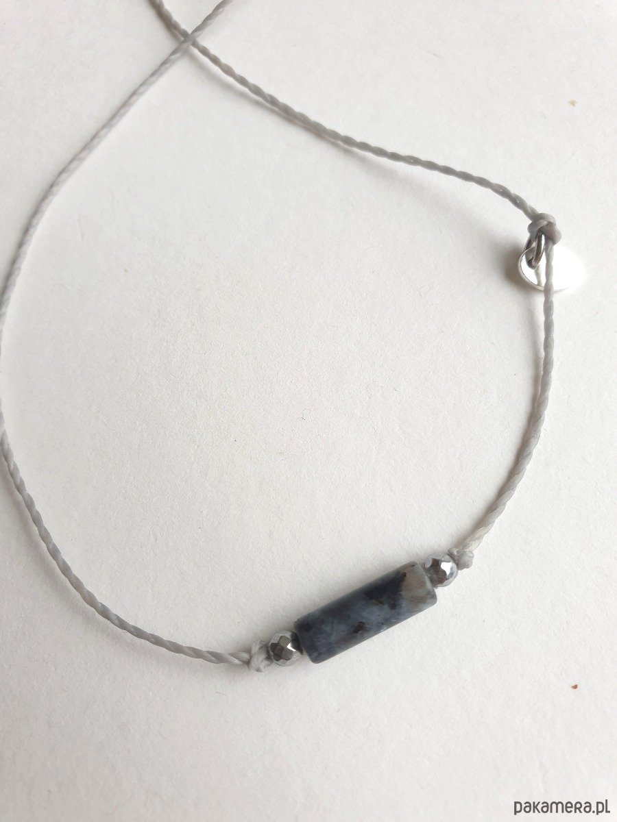 Delikatna bransoletka na szarym sznurku z kamieniami naturalnymi i elementami ze stali szlachetnej. W tej - fasetowany hematyt, walec larvikit (czarny labradoryt). Bransoletkę można dopasować rozmiarem do dłoni. Sznurek polyestrowy woskowany marki Linhasita którego cechuje wysoka odporność na rozciąganie i zadarcia, jest wodoodporny. Bransoletka tworzona na zamówienie, z tych samych elementów i w tych samych kolorach jednak może się minimalnie różnić bo każdy kamień jest wyjątkowy. Bransoletka do samodzielnego zawiązania na zwykły supełek, lub na zdjęciu masz dwie dodatkowe propozycje zawiązania 1. dwa węzełki przesuwne 2. węzeł marynarski