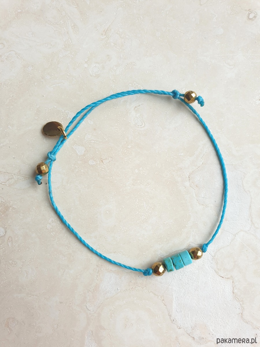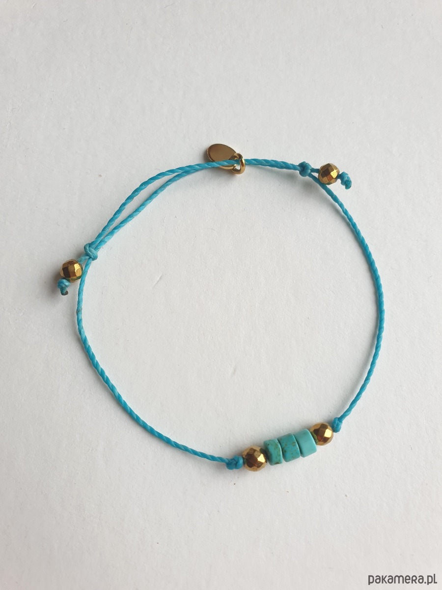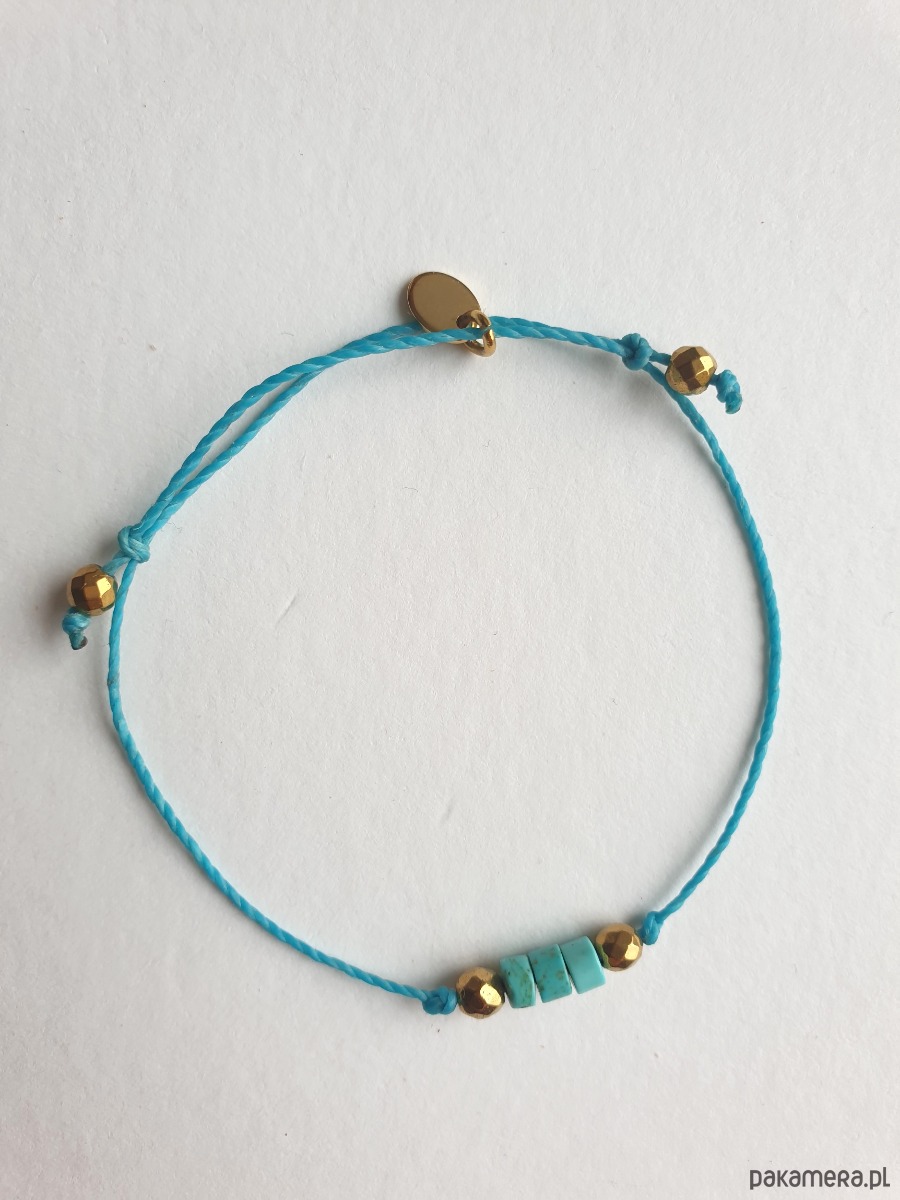 Delikatna bransoletka na turkusowym sznurku z kamieniami naturalnymi i elementami ze stali szlachetnej złoconej. W tej - fasetowany złoty hematyt, talarki naturalnego turkusu. Bransoletkę można dopasować rozmiarem do dłoni. Sznurek polyestrowy woskowany marki Linhasita którego cechuje wysoka odporność na rozciąganie i zadarcia, jest wodoodporny. Bransoletka tworzona na zamówienie, z tych samych elementów i w tych samych kolorach jednak może się minimalnie różnić bo każdy kamień jest wyjątkowy.