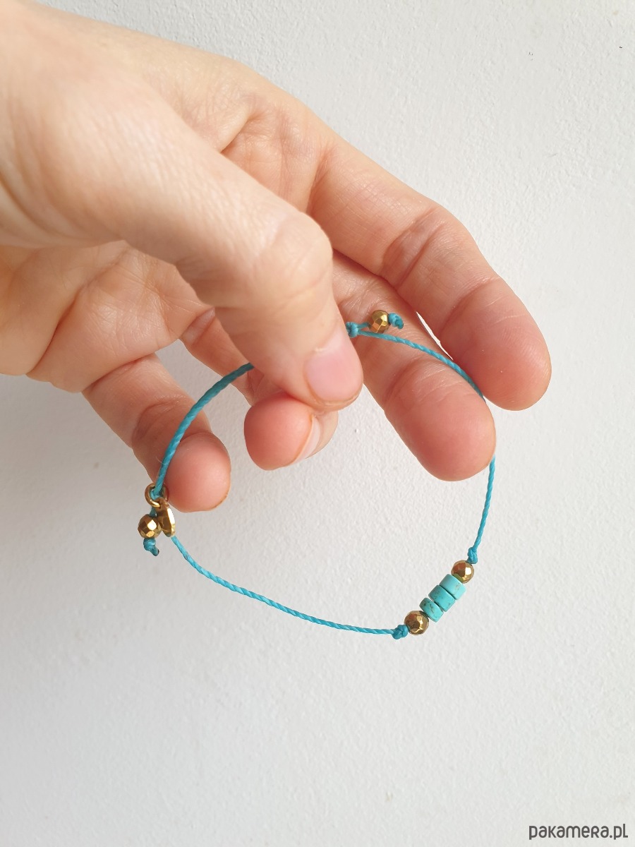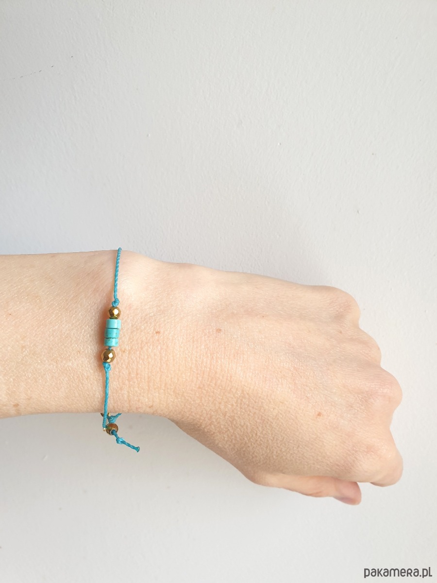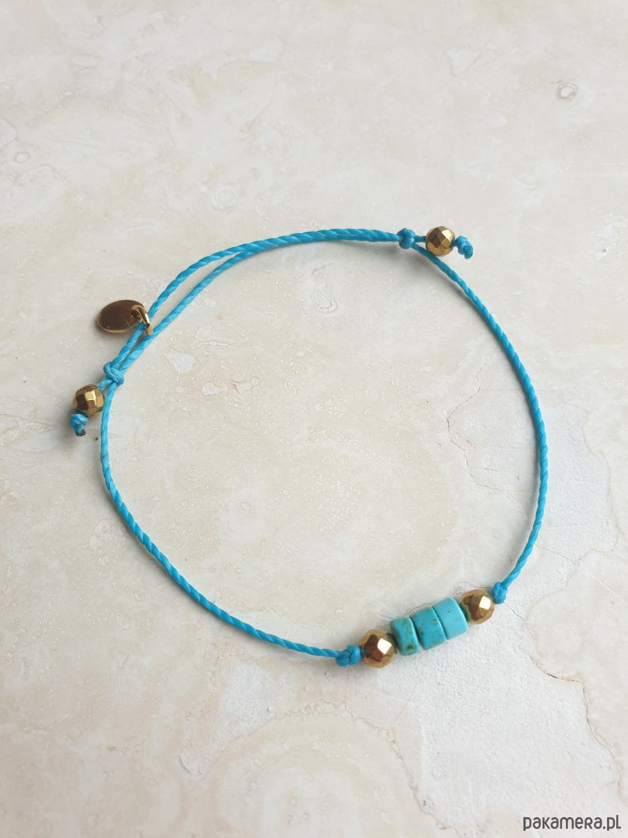Delikatna bransoletka na turkusowym sznurku z kamieniami naturalnymi i elementami ze stali szlachetnej złoconej. W tej - fasetowany złoty hematyt, talarki naturalnego turkusu. Bransoletkę można dopasować rozmiarem do dłoni. Sznurek polyestrowy woskowany marki Linhasita którego cechuje wysoka odporność na rozciąganie i zadarcia, jest wodoodporny. Bransoletka tworzona na zamówienie, z tych samych elementów i w tych samych kolorach jednak może się minimalnie różnić bo każdy kamień jest wyjątkowy.