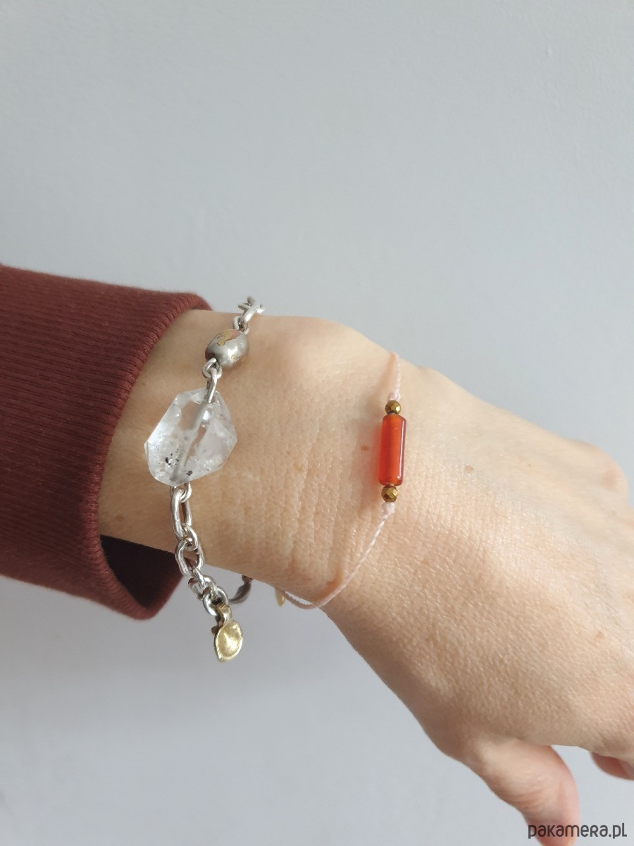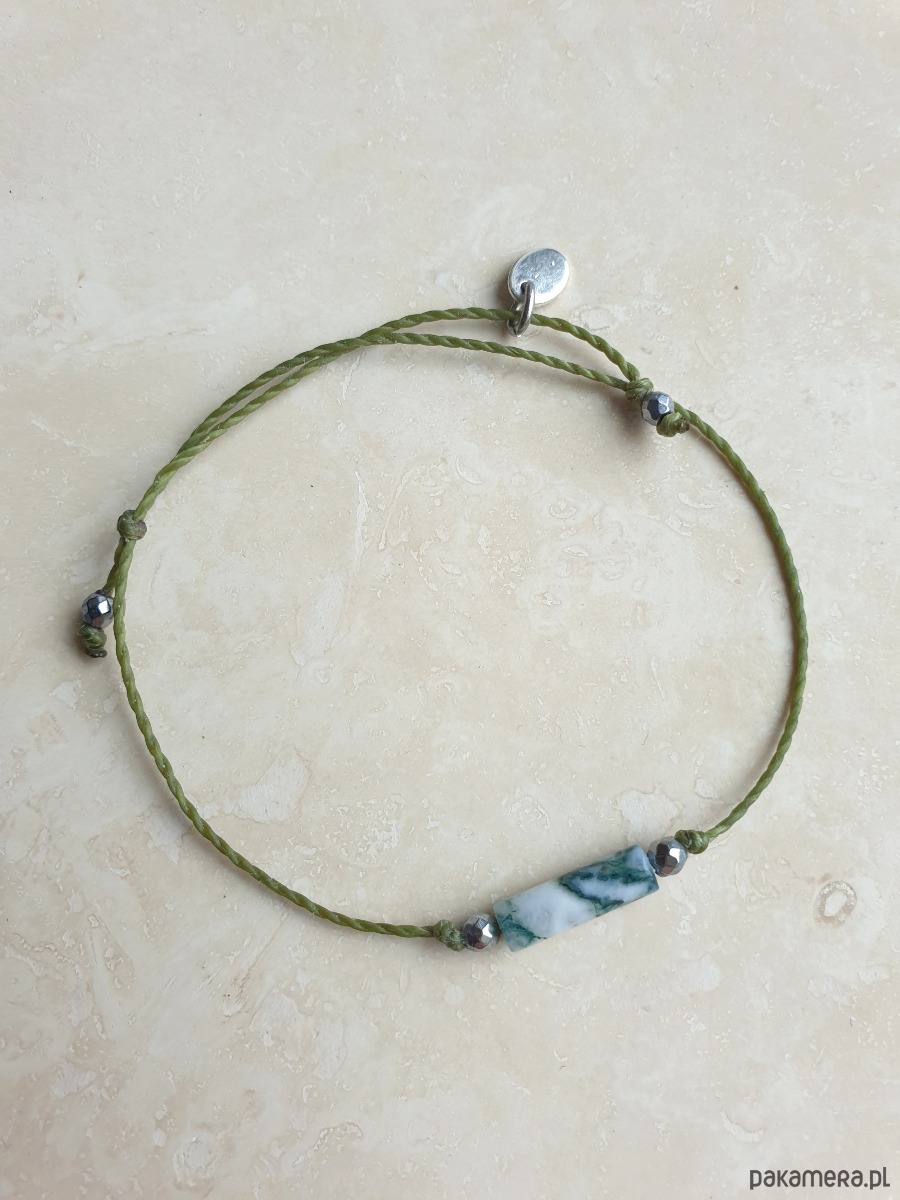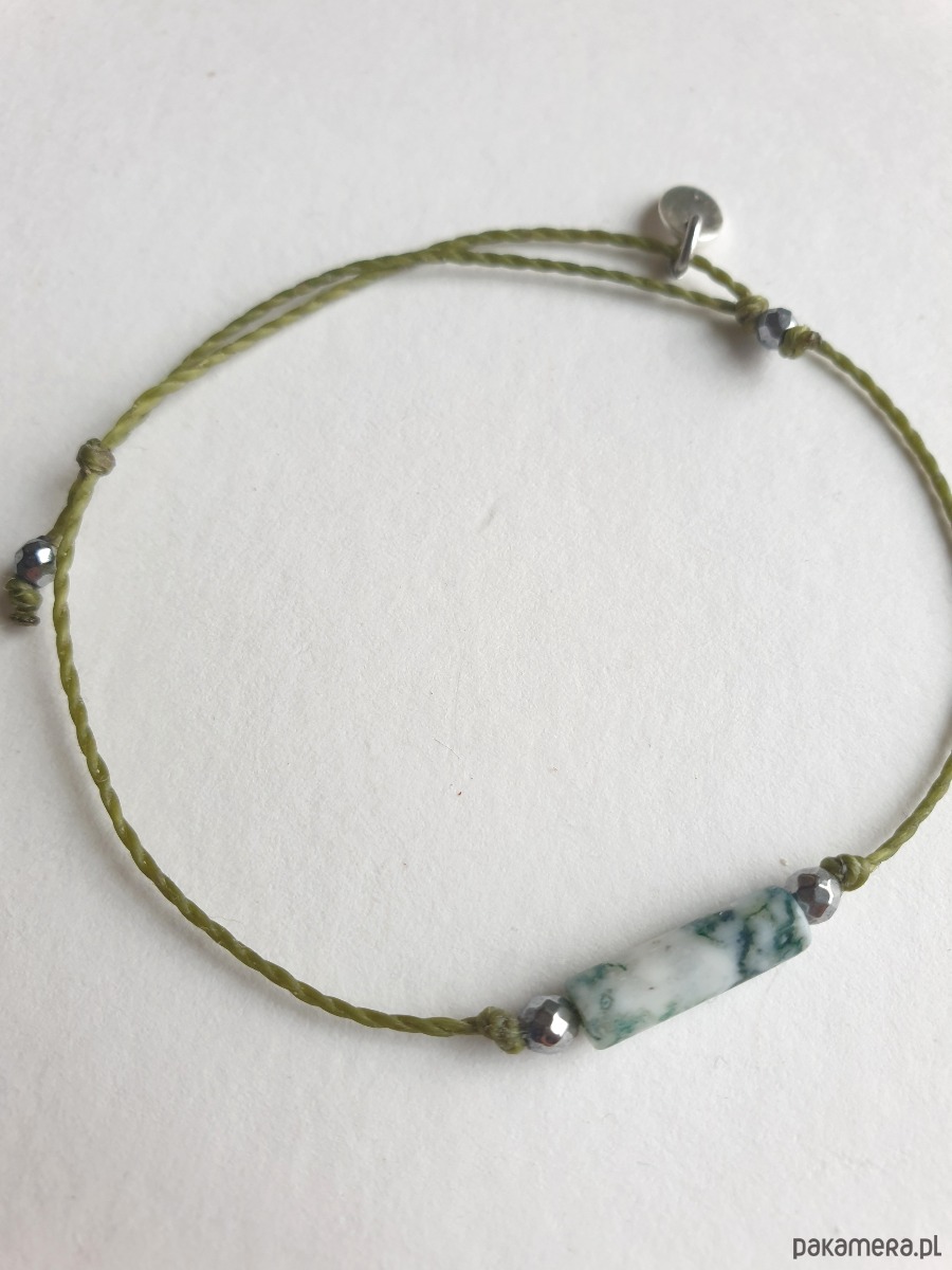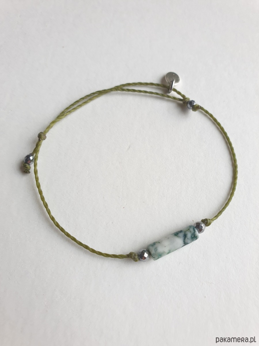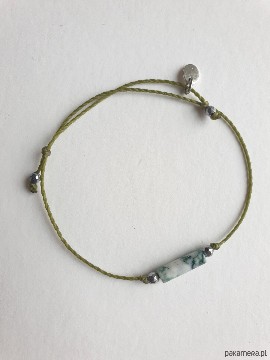 Delikatna bransoletka na khaki zielonym sznurku z kamieniami naturalnymi i elementami ze stali szlachetnej. W tej - fasetowany srebrny hematyt, walec agat mszysty. Bransoletkę można dopasować rozmiarem do dłoni. Sznurek polyestrowy woskowany marki Linhasita którego cechuje wysoka odporność na rozciąganie i zadarcia, jest wodoodporny. Bransoletka tworzona na zamówienie, z tych samych elementów i w tych samych kolorach jednak może się minimalnie różnić bo każdy kamień jest wyjątkowy.