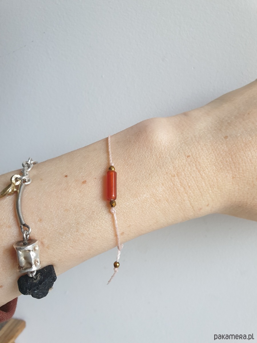 Długość maksymalna bransoletki 22 cm, uniwersalny, powinna bez problemu przejść przez dłoń, a potem można ja dopasować przesuwając węzełki. Wielkość walca 12 mm /4 mm, wielkość małych kulek 3 mm, nić grubość ok 1 mm