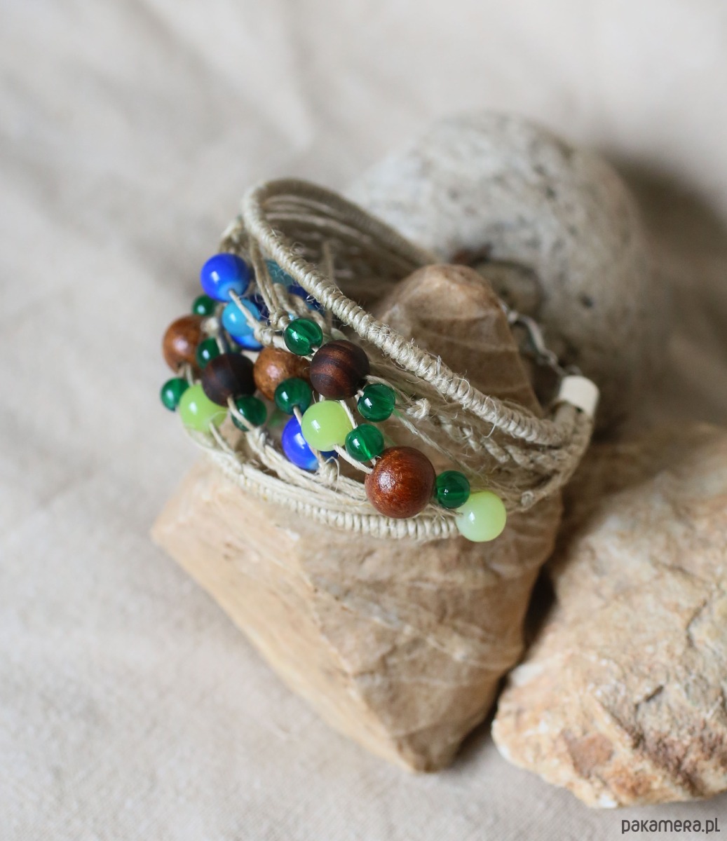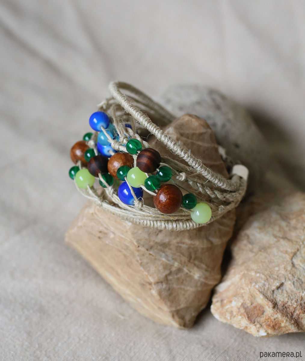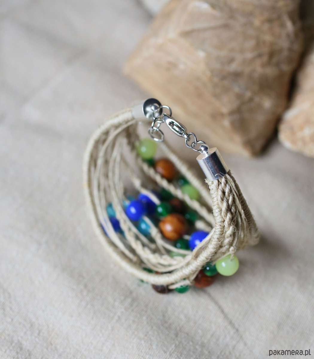 Bransoletka w stylu boho, wykonana z lnianych sznurków plecionych i koralików. Zapięcie stalowe w kolorze srebra. Pasuje na nadgarstek o obwodzie 15-16 cm.