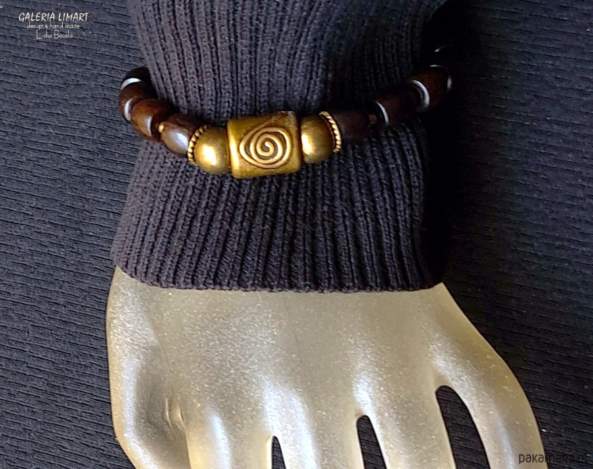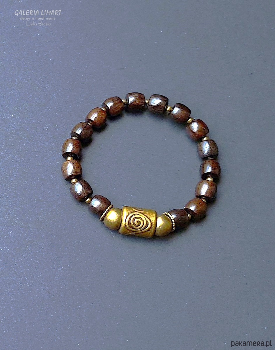Efektowna kompozycja bransoletki z koralików (8 mm) z lekkiego drewna aloesowego ozdobionego przekładkąi z litego mosiądzu w spiralne wzory, co znakomicie uatrakcyjnia tę bransoletkę. Wzór spirali symbolizuje dążenie do doskonałości. Unisex, może być zarówno dla niej jak i dla niego.