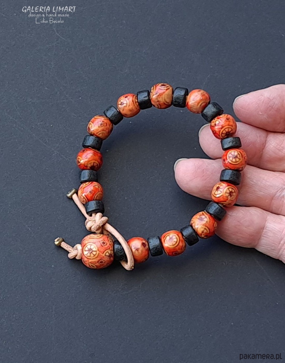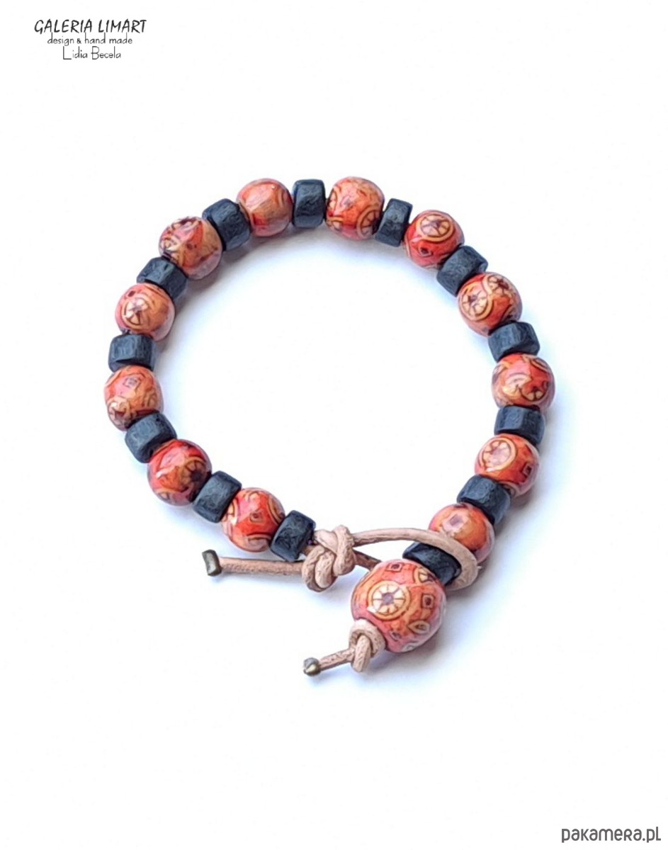 Efektowna kompozycja bransoletki z korali z lekkiego drewna egzotycznego ozdobionego etnicznym wzorem metodą decoupage na skórzanym rzemieniu. Unisex, może być zarówno dla niej jak i dla niego. Długość ok. 20 cm.