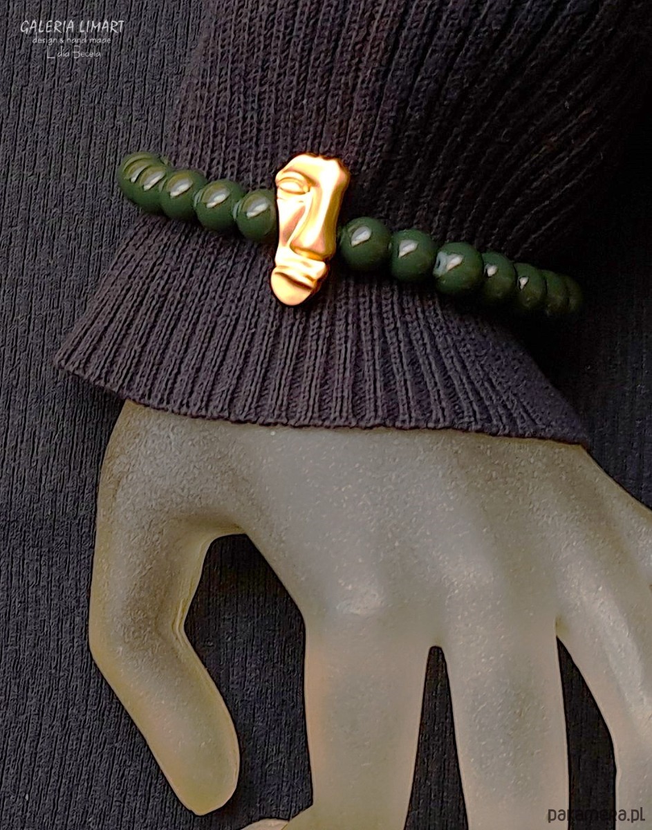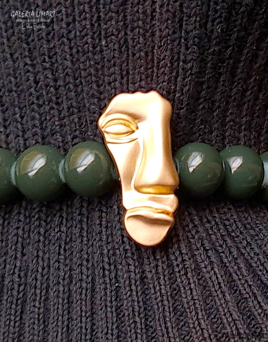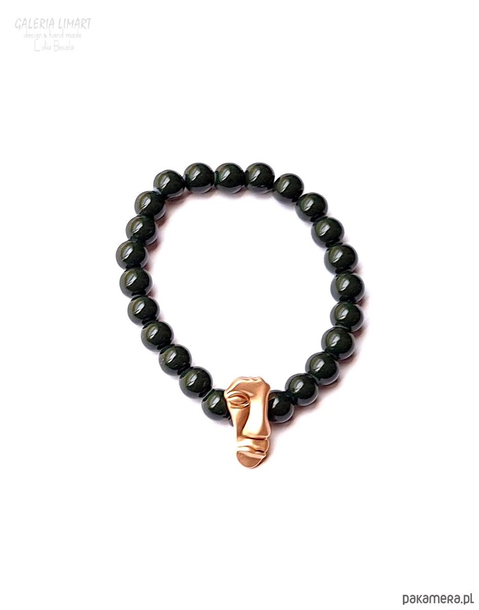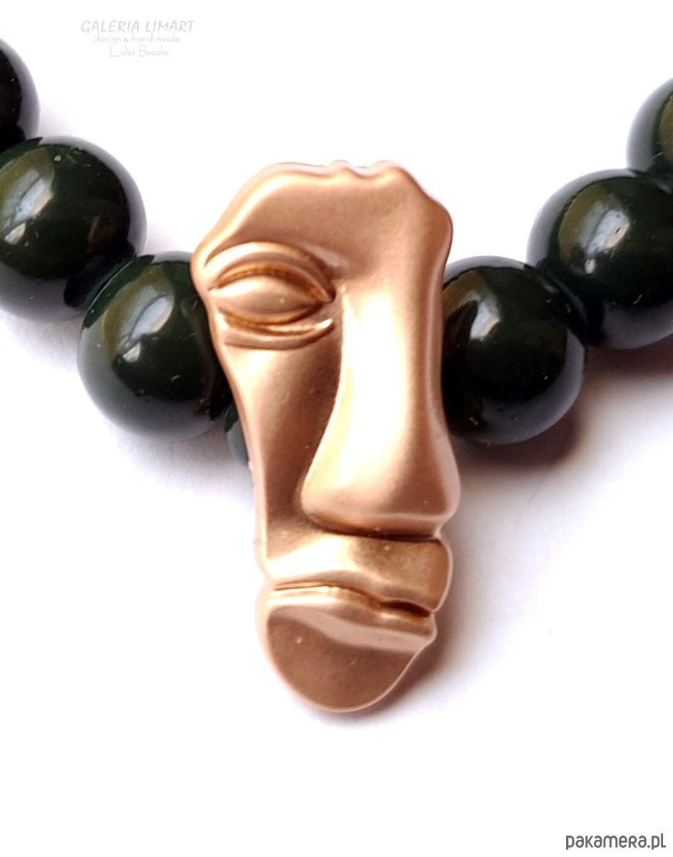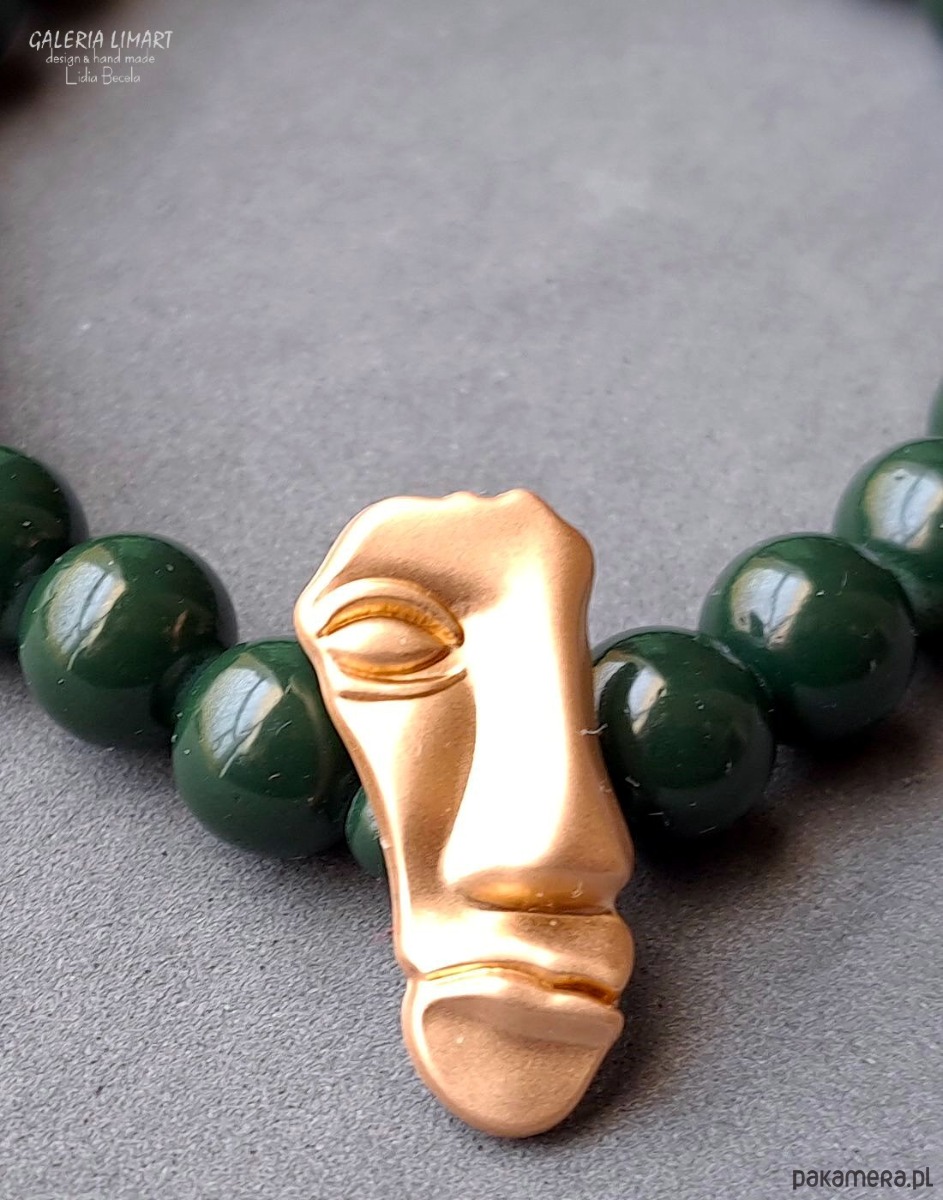 Niezwykła kompozycja bransoletki z koralików (8 mm) ze szkła w ciemnozielonym pięknym kolorze centralnie ozdobiona nieco niesamowitym wizerunkiem wycinka ludzkiej twarzy wykonanym z metalu. "W wielu kulturach stylizowane twarze lub maski umieszczane w biżuterii (np. w wisiorach) miały za zadanie odpędzać zło, chronić noszącego oraz przywoływać opiekę przodków" (dane z netu, można wierzyć, albo nie).