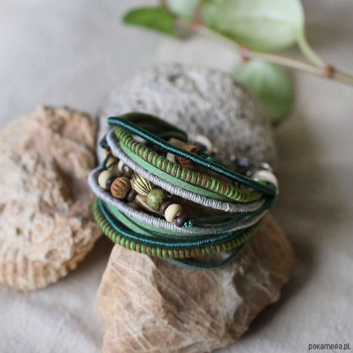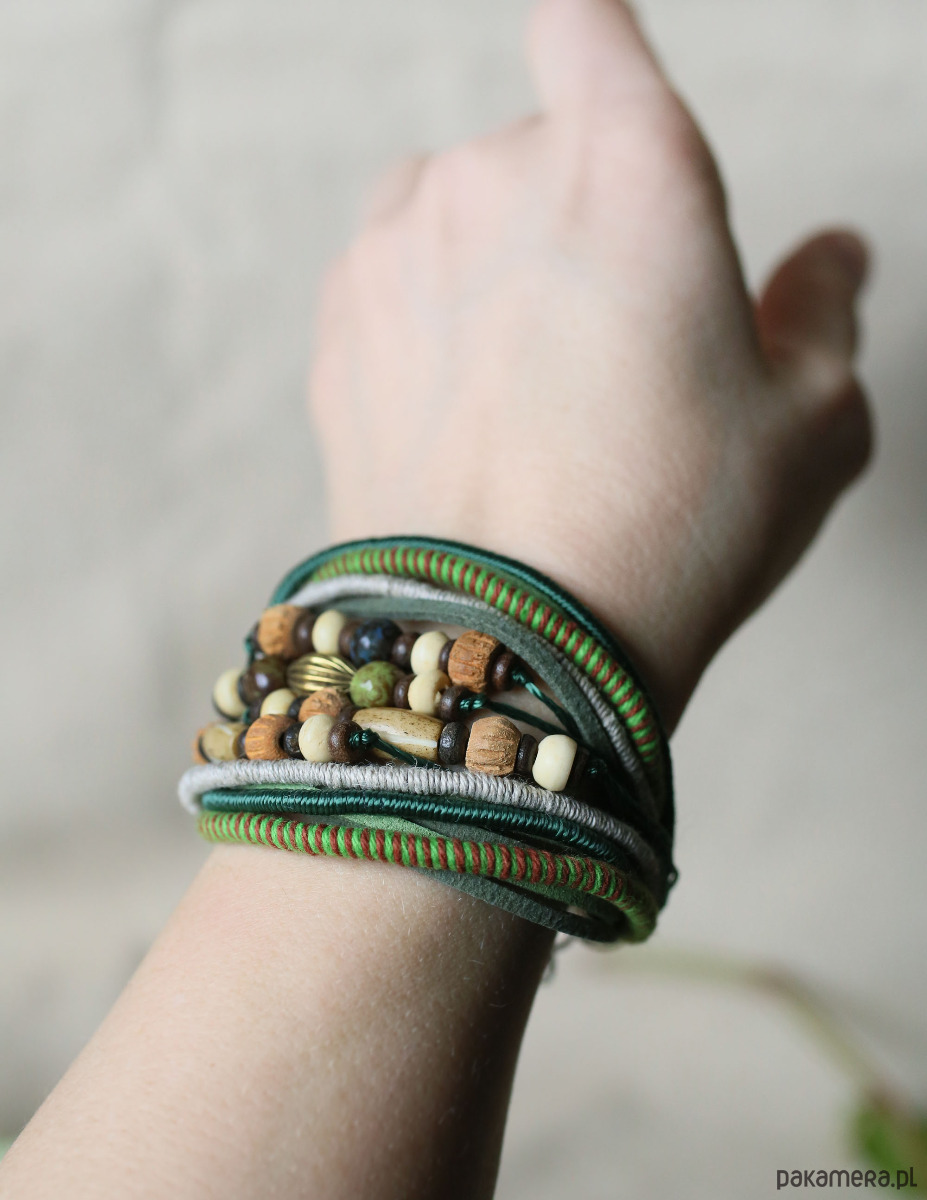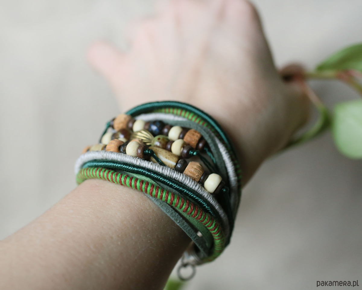 Bransoletka w stylu boho, wykonana z różnobarwnych koralików i rzemieni, w tonacji zielono-brązowej. Zapięcie ze stali w kolorze srebra. Pasuje na nadgarstek o obwodzie 15-16 cm.