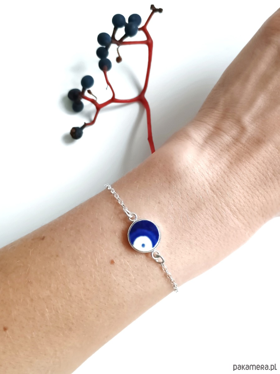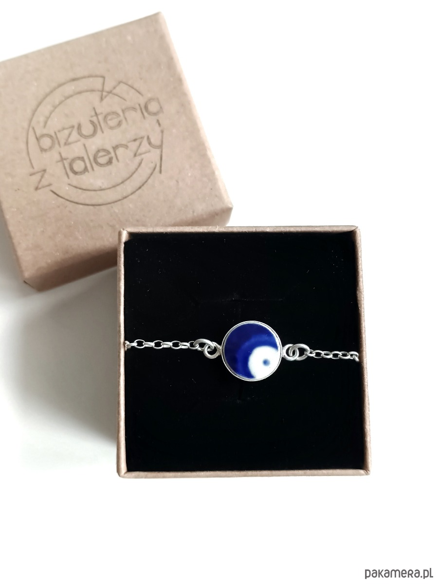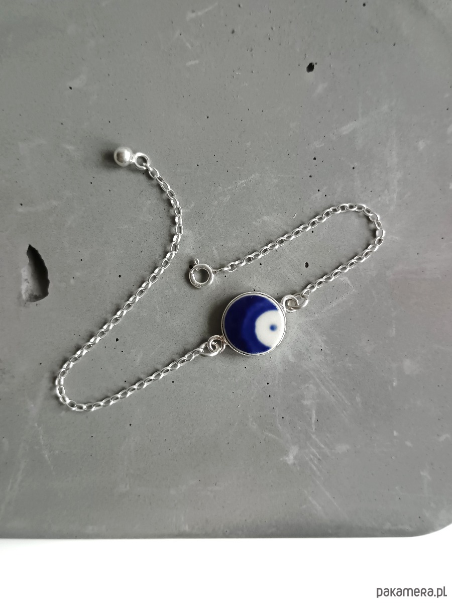 Ceramika w Bolesławcu i jego okolicach produkowana była już w XIV wieku. Do dziś najważniejszy surowiec, czyli glina wydobywany jest na miejscu, a tradycja wyrobu naczyń ceramicznych, rozwijana i kultywowana przez wieki - trwa. Bolesławiec jako marka, tworzona przez kilkadziesiąt różnych manufaktur, znana jest na całym świecie, a charakterystycznego wzoru w kobaltowe kropki nie sposób pomylić z żadnym innym. Co najbardziej wyróżnia Bolesławiec, to że szkliwo nakładane jest ręcznie, za pomocą stempelków z gąbki. Oto delikatna bransoletka, którą wykonałam z fragmentu stłuczonego talerza, wykonanego właśnie w Bolesławcu (dekoracja nr 42). Kawałek stłuczki oszlifowałam, osadziłam w srebrnej oprawie i zamocowałam na srebrnym łańcuszku (srebro 925). Długość łańcuszka w całości: 18 cm. Średnica zawieszki: 12 mm. Bransoletkę można zapiąć na dowolne ogniwko, co daje możliwość regulacji rozmiaru. Na końcu łańcuszka zamocowałam zawieszkę w kształcie kuli, również ze srebra. Unikat - każdy z moich wyrobów występuje w jednym egzemplarzu. Upcykling - nie reprodukuję wykorzystywanych wzorów, niczego nie domalowuję - wykorzystuję wyłącznie oryginalne naczynia i motywy, które się na nich znajdują. Tym samym, stłuczce z odzysku nadaję nowe życie.