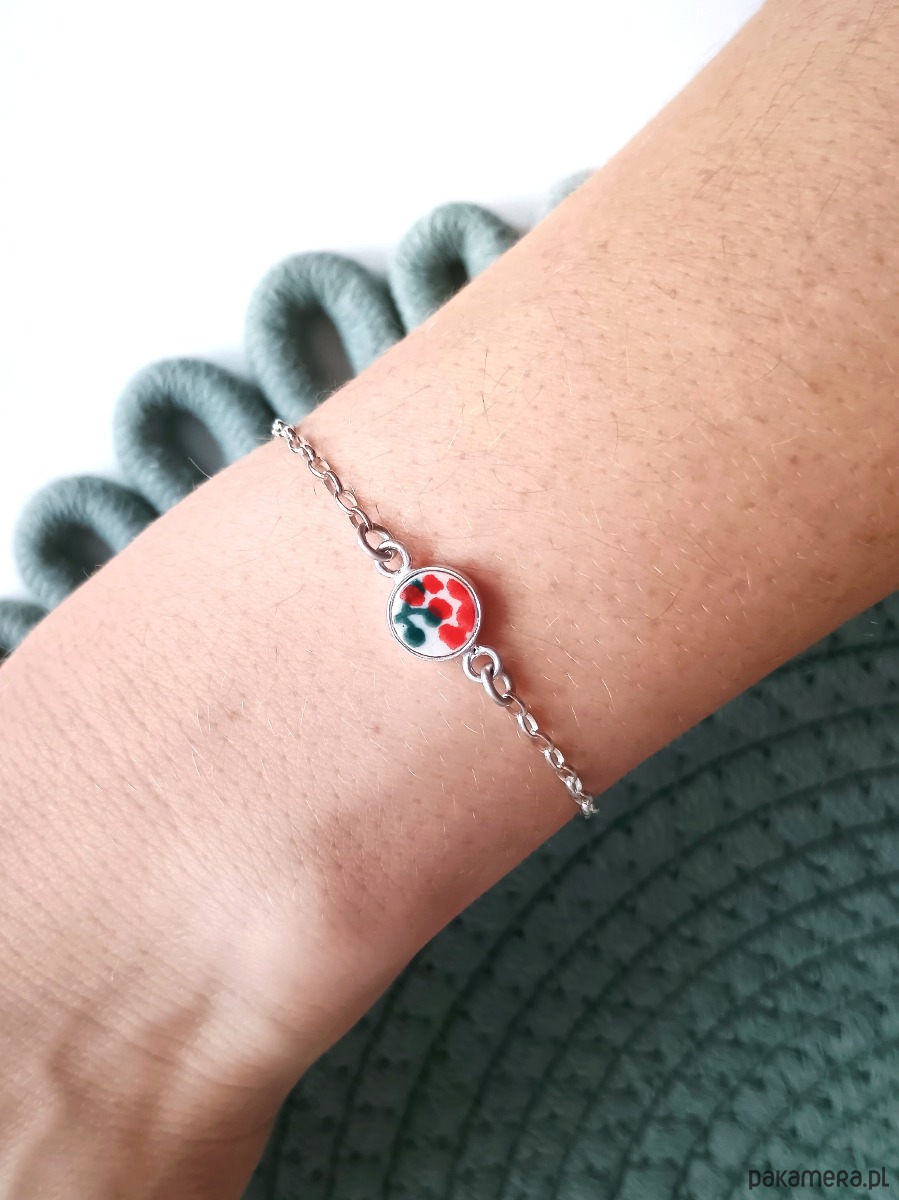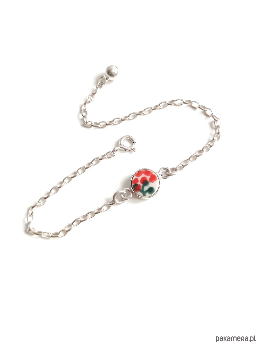 Ceramika w Bolesławcu i jego okolicach produkowana była już w XIV wieku. Do dziś najważniejszy surowiec, czyli glina wydobywany jest na miejscu, a tradycja wyrobu naczyń ceramicznych, rozwijana i kultywowana przez wieki - trwa. Bolesławiec jako marka, tworzona przez kilkadziesiąt różnych manufaktur, znana jest na całym świecie, a charakterystycznego wzoru w kobaltowe kropki nie sposób pomylić z żadnym innym. Co najbardziej wyróżnia Bolesławiec, to że szkliwo nakładane jest ręcznie, za pomocą stempelków z gąbki. Oto delikatna bransoletka, którą wykonałam z fragmentu stłuczonego talerza, wykonanego właśnie w Bolesławcu. Kawałek stłuczki oszlifowałam, osadziłam w srebrnej oprawie i zamocowałam na srebrnym łańcuszku (srebro 925). Długość łańcuszka w całości: 18 cm. Średnica zawieszki: 8 mm. Bransoletkę można zapiąć na dowolne ogniwko, co daje możliwość regulacji rozmiaru. Na końcu łańcuszka zamocowałam zawieszkę w kształcie kuli, również ze srebra. Unikat - każdy z moich wyrobów występuje w jednym egzemplarzu. Upcykling - nie reprodukuję wykorzystywanych wzorów, niczego nie domalowuję - wykorzystuję wyłącznie oryginalne naczynia i motywy, które się na nich znajdują. Tym samym, stłuczce z odzysku nadaję nowe życie.