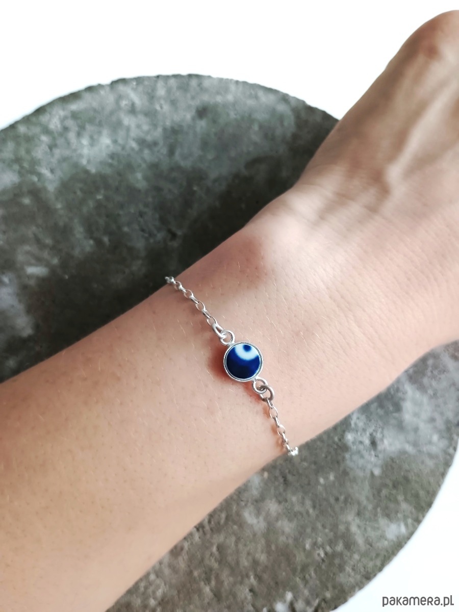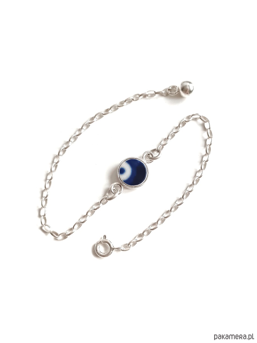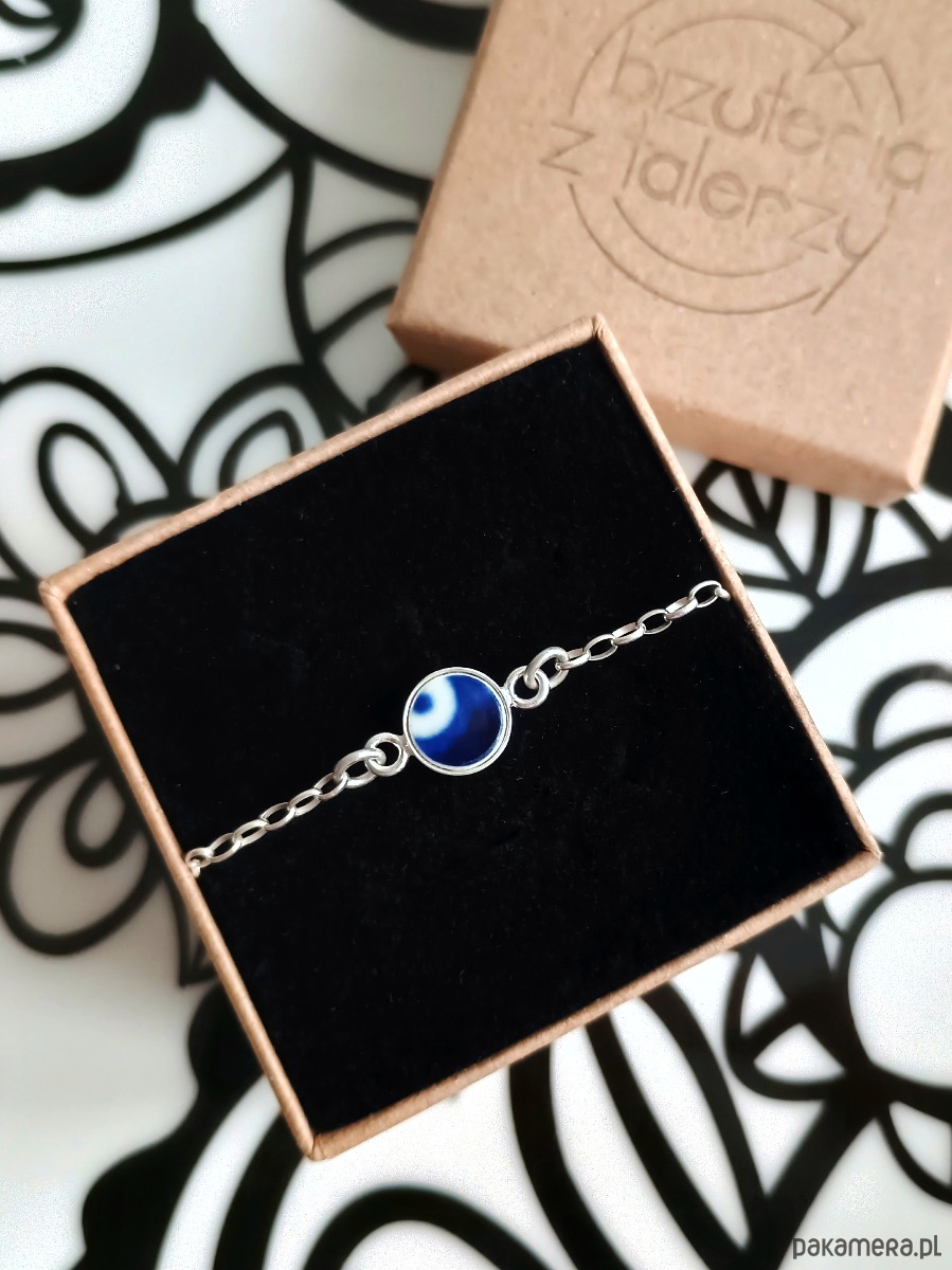 Ceramika w Bolesławcu i jego okolicach produkowana była już w XIV wieku. Do dziś najważniejszy surowiec, czyli glina wydobywany jest na miejscu, a tradycja wyrobu naczyń ceramicznych, rozwijana i kultywowana przez wieki - trwa. Bolesławiec jako marka, tworzona przez kilkadziesiąt różnych manufaktur, znana jest na całym świecie, a charakterystycznego wzoru w kobaltowe kropki nie sposób pomylić z żadnym innym. Co najbardziej wyróżnia Bolesławiec, to że szkliwo nakładane jest ręcznie, za pomocą stempelków z gąbki. Oto delikatna bransoletka, którą wykonałam z fragmentu stłuczonego talerza, wykonanego właśnie w Bolesławcu. Kawałek stłuczki oszlifowałam, osadziłam w srebrnej oprawie i zamocowałam na srebrnym łańcuszku (srebro 925). Długość łańcuszka w całości: 18 cm. Średnica zawieszki: 8 mm. Bransoletkę można zapiąć na dowolne ogniwko, co daje możliwość regulacji rozmiaru. Na końcu łańcuszka zamocowałam zawieszkę w kształcie kuli, również ze srebra. Unikat - każdy z moich wyrobów występuje w jednym egzemplarzu. Upcykling - nie reprodukuję wykorzystywanych wzorów, niczego nie domalowuję - wykorzystuję wyłącznie oryginalne naczynia i motywy, które się na nich znajdują. Tym samym, stłuczce z odzysku nadaję nowe życie.