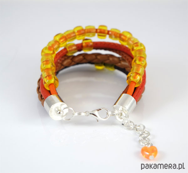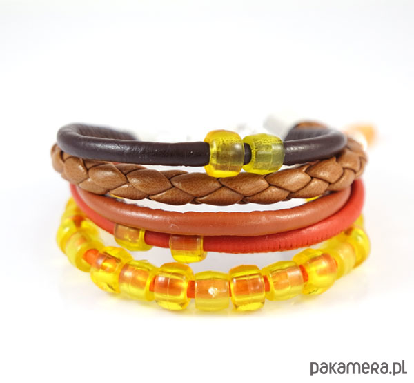 Bransoletka zrobiona jest z rzemieni ze skóry ekologicznej i naturalnej oraz plastikowych koralików.