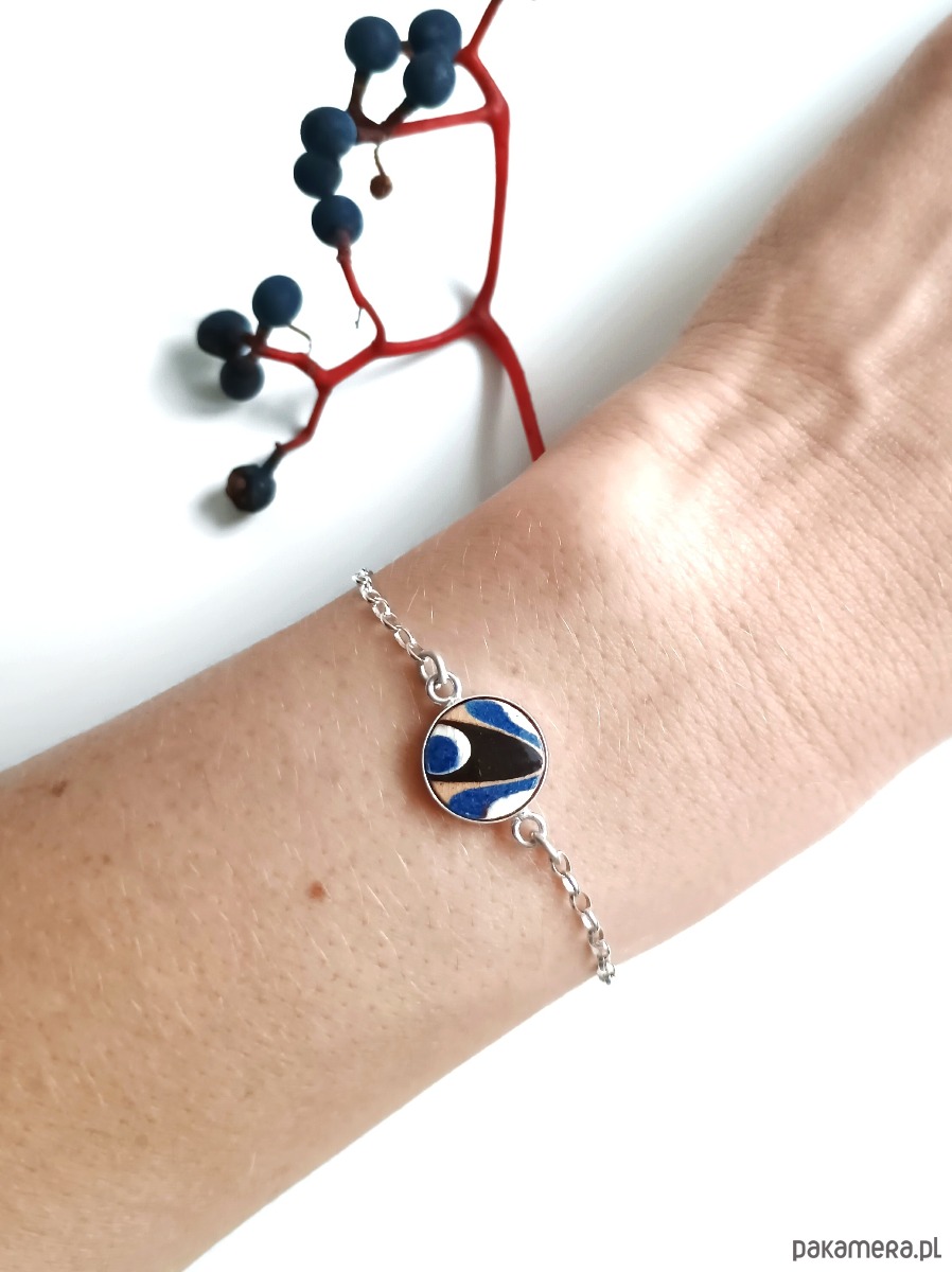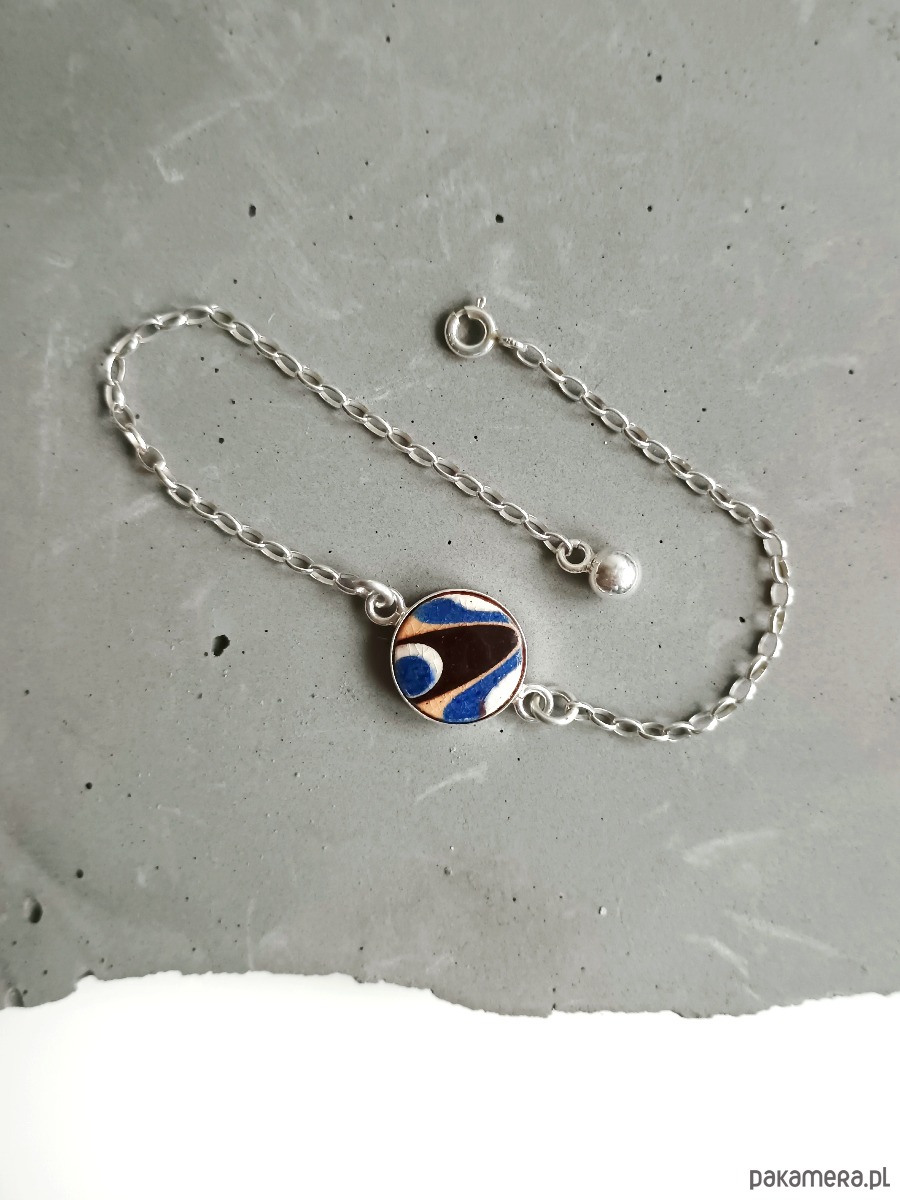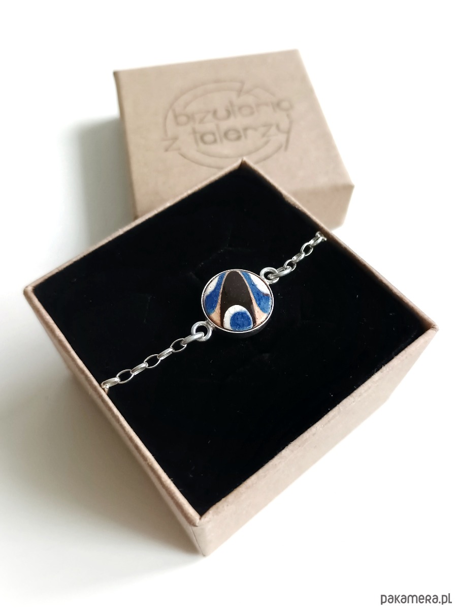 Oto delikatna bransoletka, którą wykonałam z fragmentu stłuczonego dzbanka w tradycyjne bułgarskie wzory. Kawałek stłuczki oszlifowałam, osadziłam w srebrnej oprawie i zamocowałam na srebrnym łańcuszku (srebro 925). Długość łańcuszka w całości: 18 cm. Średnica zawieszki: 12 mm. Bransoletkę można zapiąć na dowolne ogniwko, co daje możliwość regulacji rozmiaru. Na końcu łańcuszka zamocowałam zawieszkę w kształcie kuli, również ze srebra. Unikat - każdy z moich wyrobów występuje w jednym egzemplarzu. Upcykling - nie reprodukuję wykorzystywanych wzorów, niczego nie domalowuję - wykorzystuję wyłącznie oryginalne naczynia i motywy, które się na nich znajdują. Tym samym, stłuczce z odzysku nadaję nowe życie.