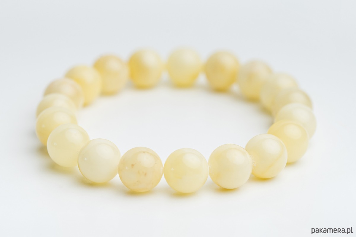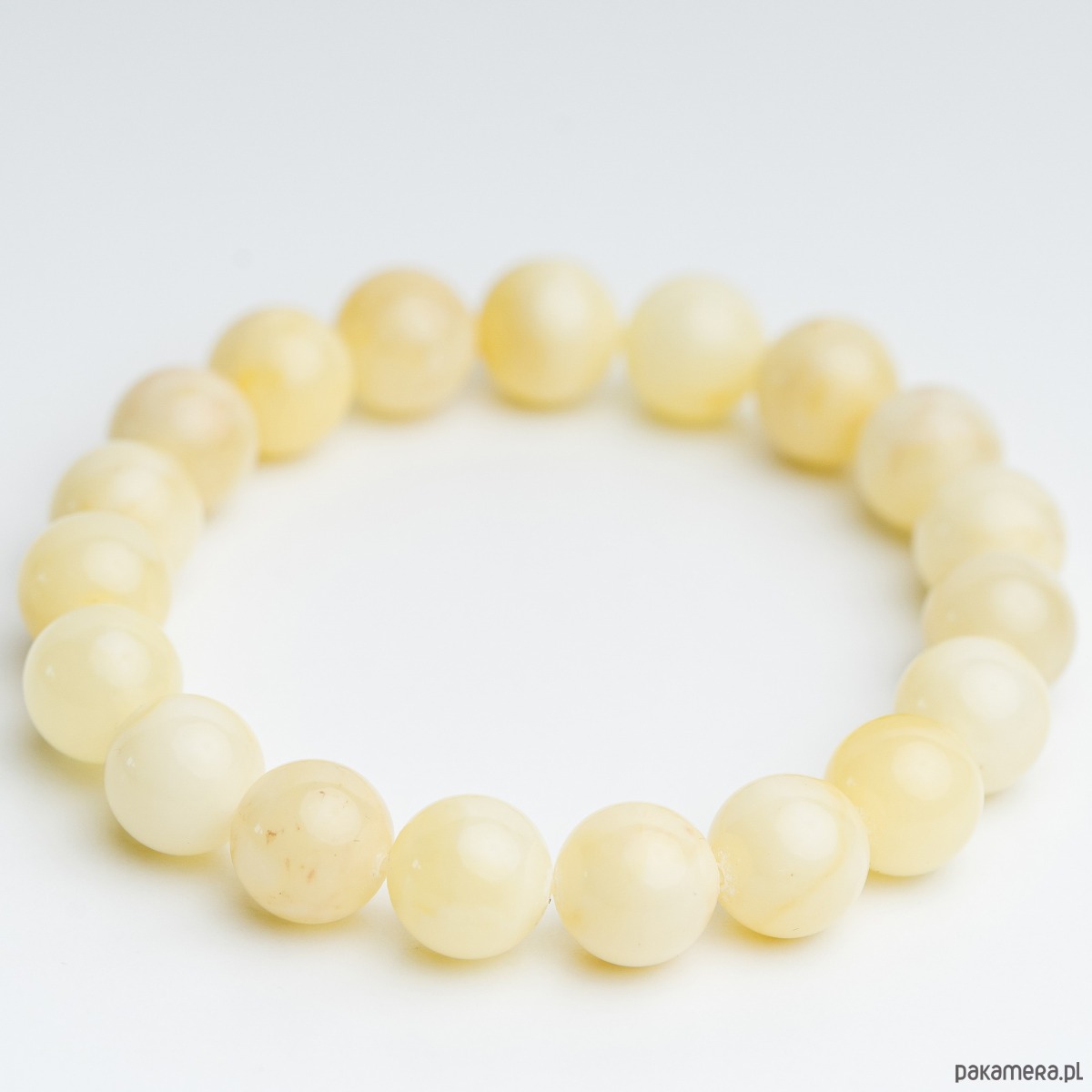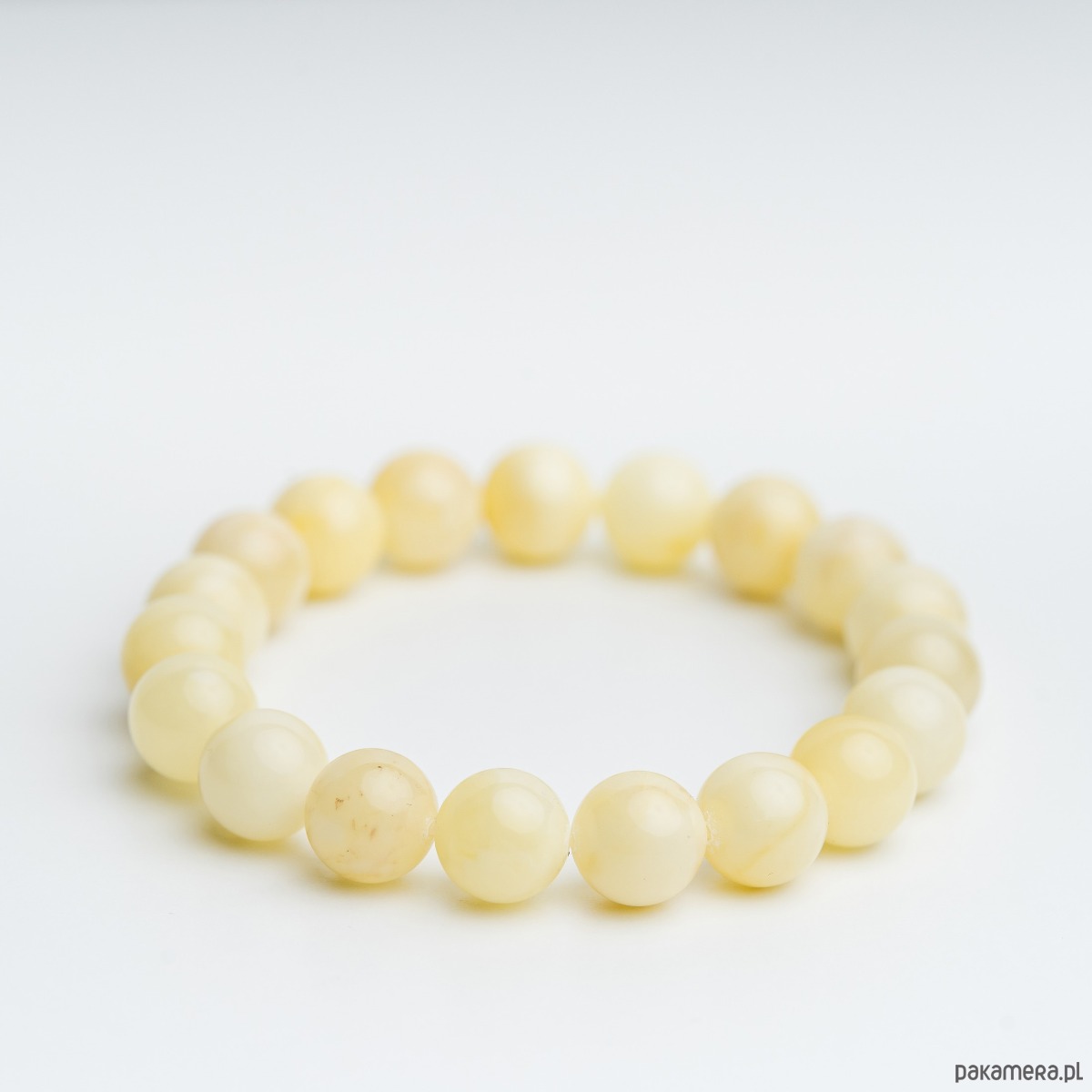 Elegancka bransoletka wykonana z naturalnego bursztynu bałtyckiego o regularnym kształcie kulki 10 mm. Unikatowy mleczny odcień bursztynu pięknie mieni się w świetle, podkreślając naturalne inkluzje i wyjątkowy charakter każdego koralika.