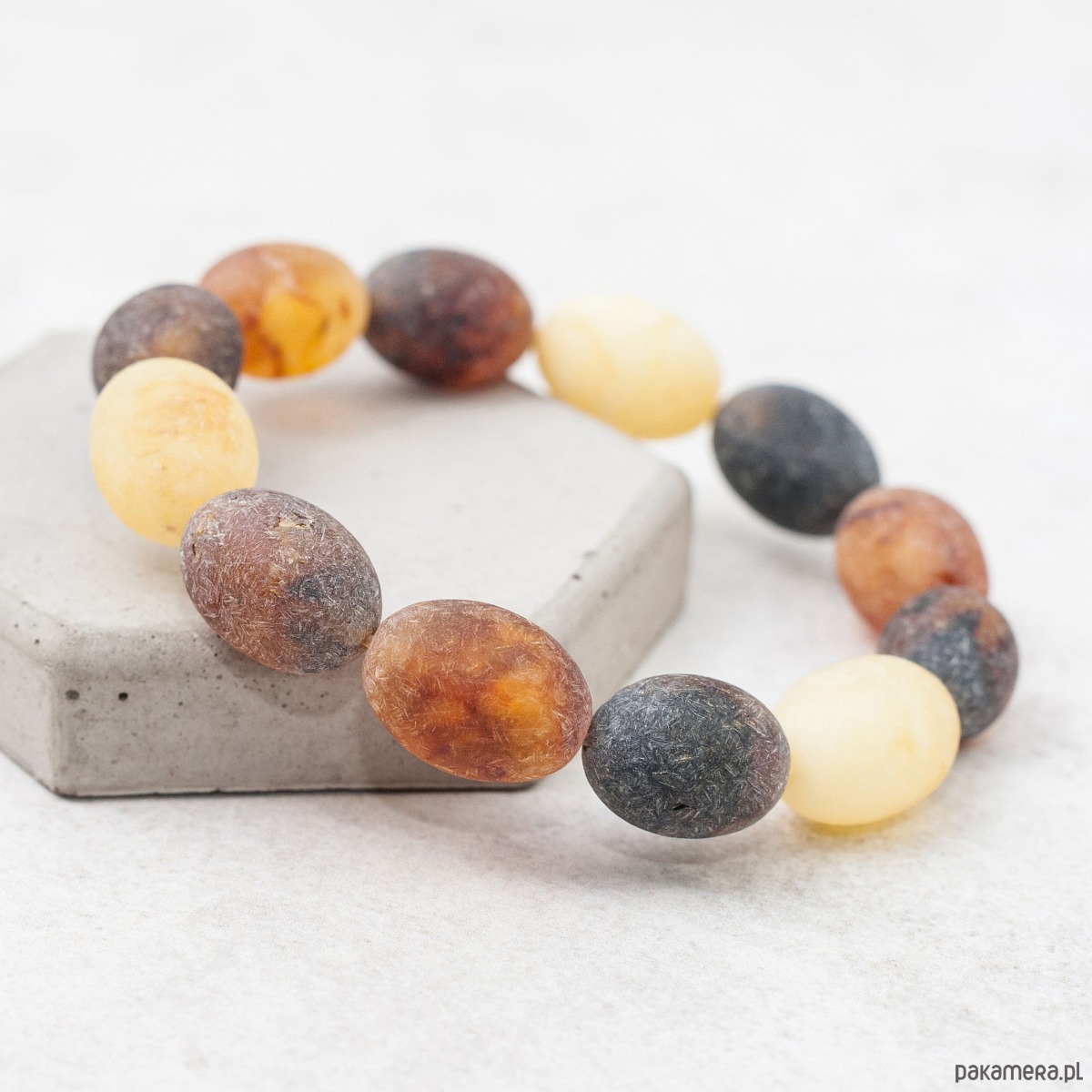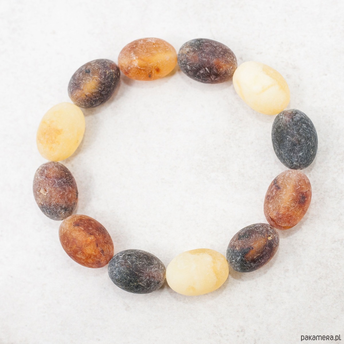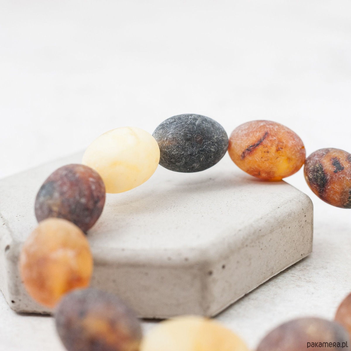 Wyjątkowa bransoletka wykonana z naturalnego, matowanego bursztynu bałtyckiego w klasycznych odcieniach: od mlecznego i miodowego po ciemne, głębokie barwy. Każdy kamien posiada swoją niepowtarzalną strukturę i delikatne inkluzje, dzięki czemu biżuteria jest absolutnie unikatowa.