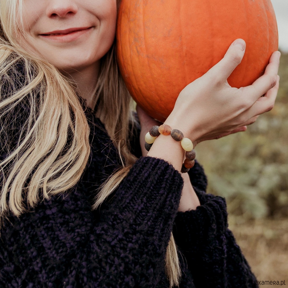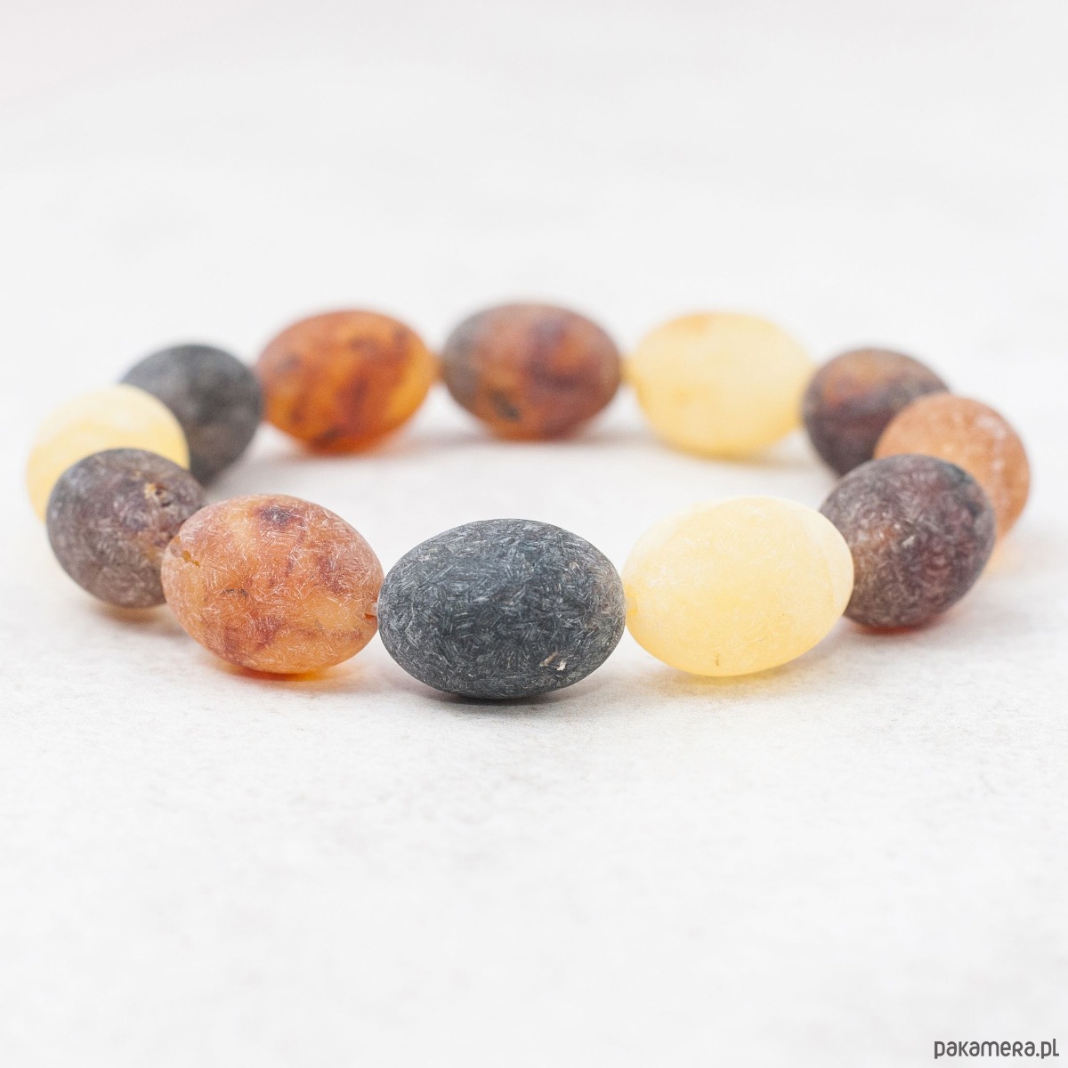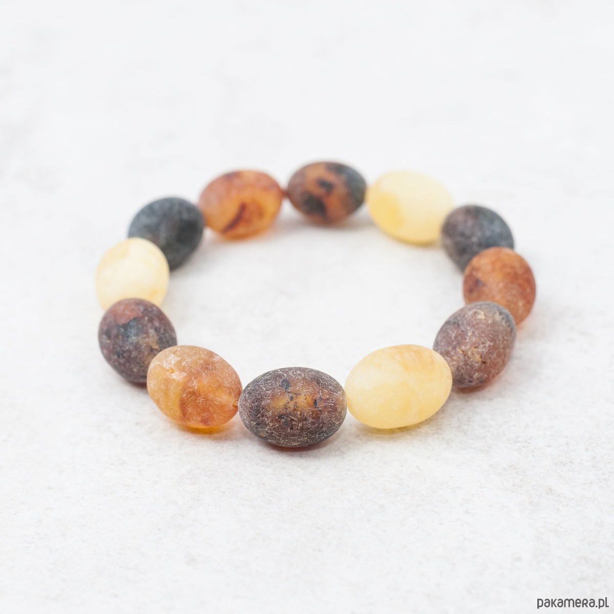 Wyjątkowa bransoletka wykonana z naturalnego, matowanego bursztynu bałtyckiego w klasycznych odcieniach: od mlecznego i miodowego po ciemne, głębokie barwy. Każdy kamien posiada swoją niepowtarzalną strukturę i delikatne inkluzje, dzięki czemu biżuteria jest absolutnie unikatowa.
