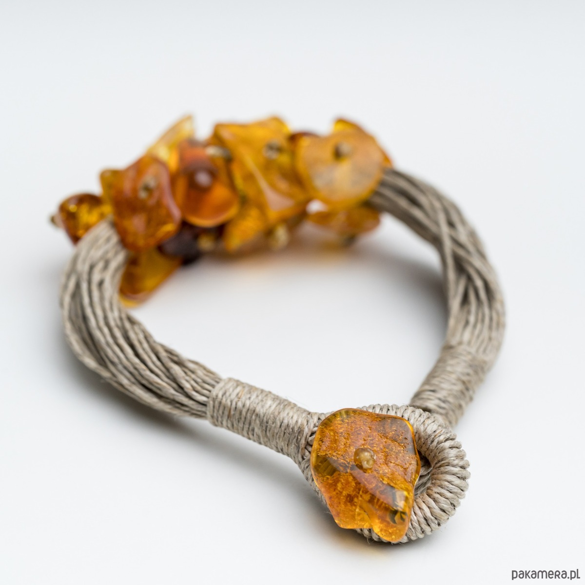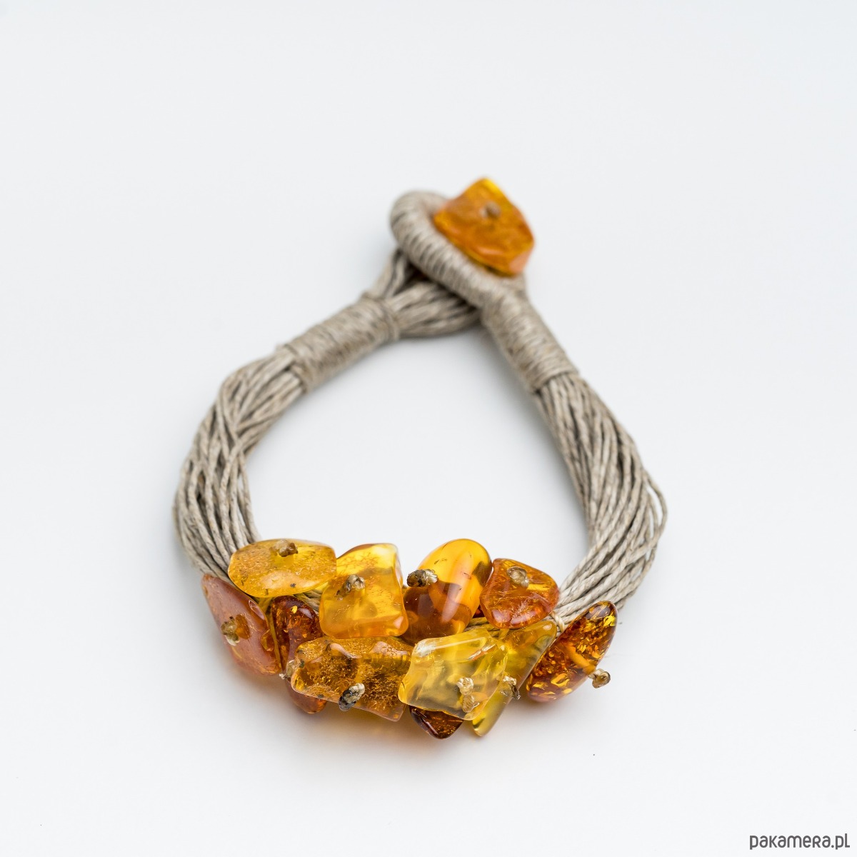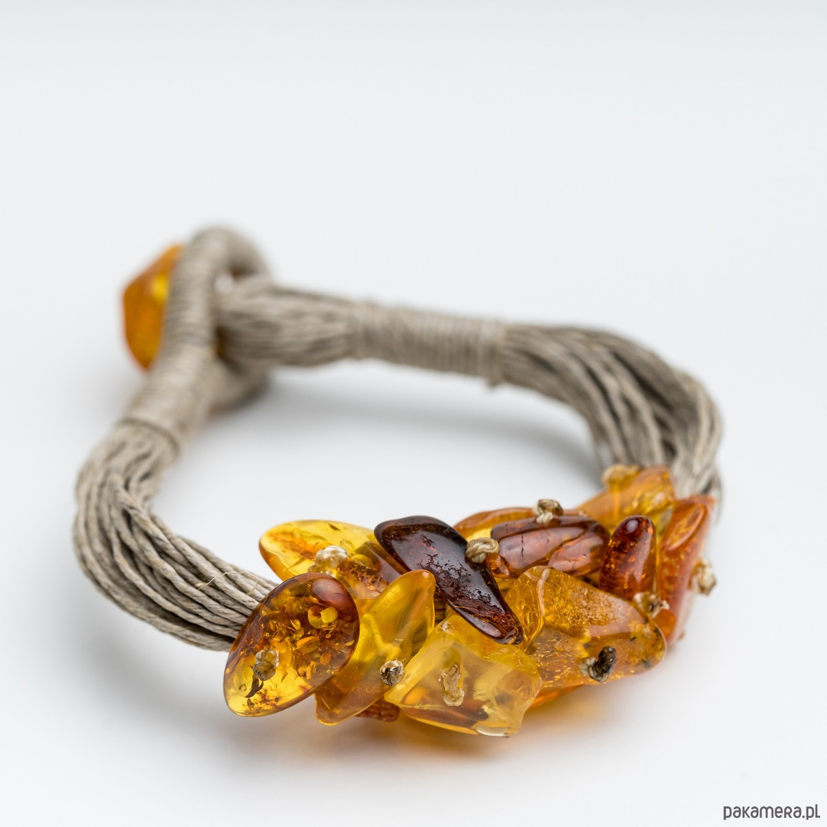 Ta niepowtarzalna bransoletka została wykonana ręcznie z surowego bursztynu bałtyckiego w ciepłych, miodowych i koniakowych odcieniach, elegancko nawleczonego na naturalne lniane sznurki. Zapięcie, również wykonane z bursztynu, podkreśla jej organiczny urok. Zaprojektowana w charakterystycznym kształcie i stylu, ta bransoletka czerpie inspirację z piękna natury i organicznych form.