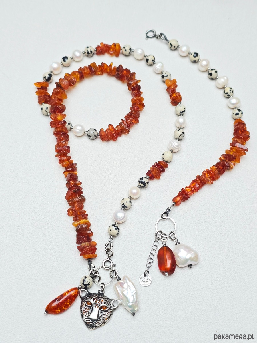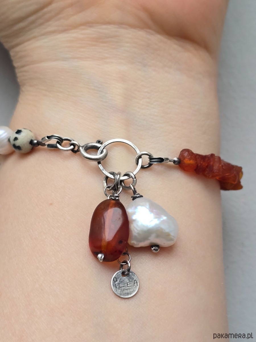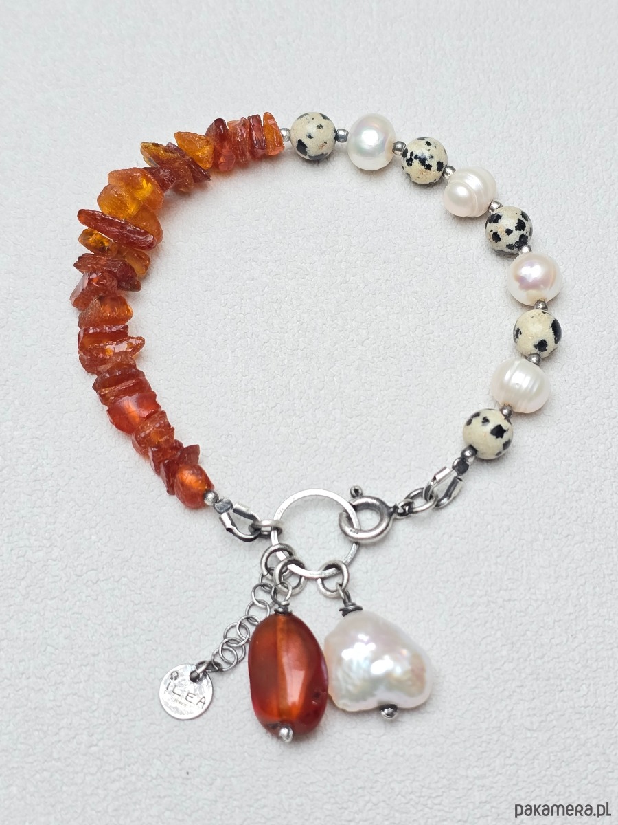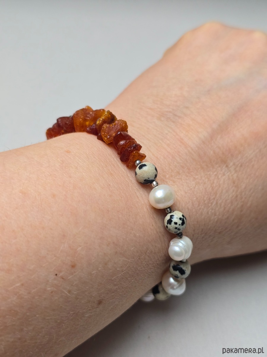 Unikatowa bransoletka z naturalnych pereł, jaspisu dalmatyńskiego i bursztynu o średnicy ok 6-8mm.