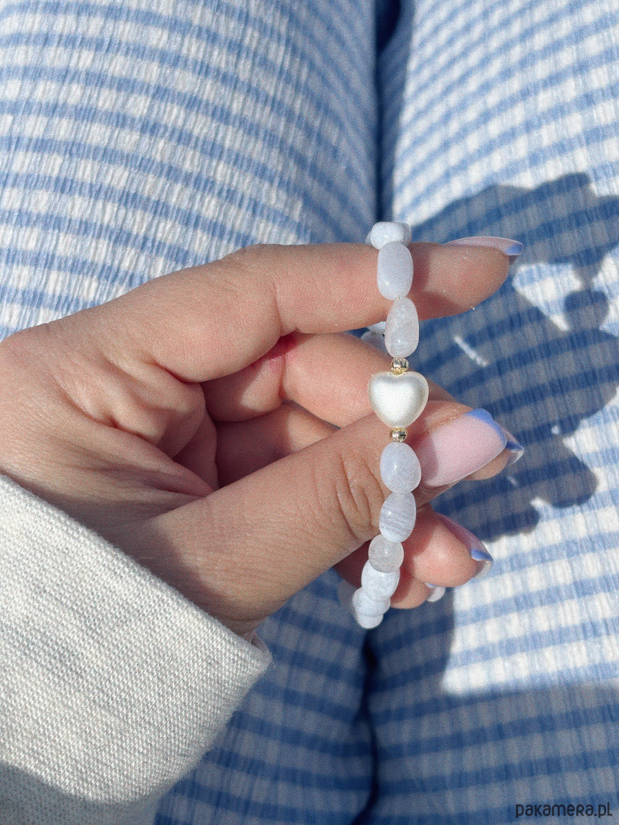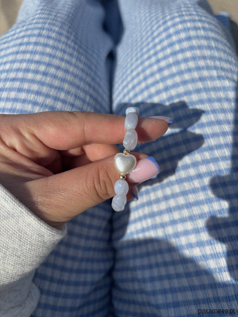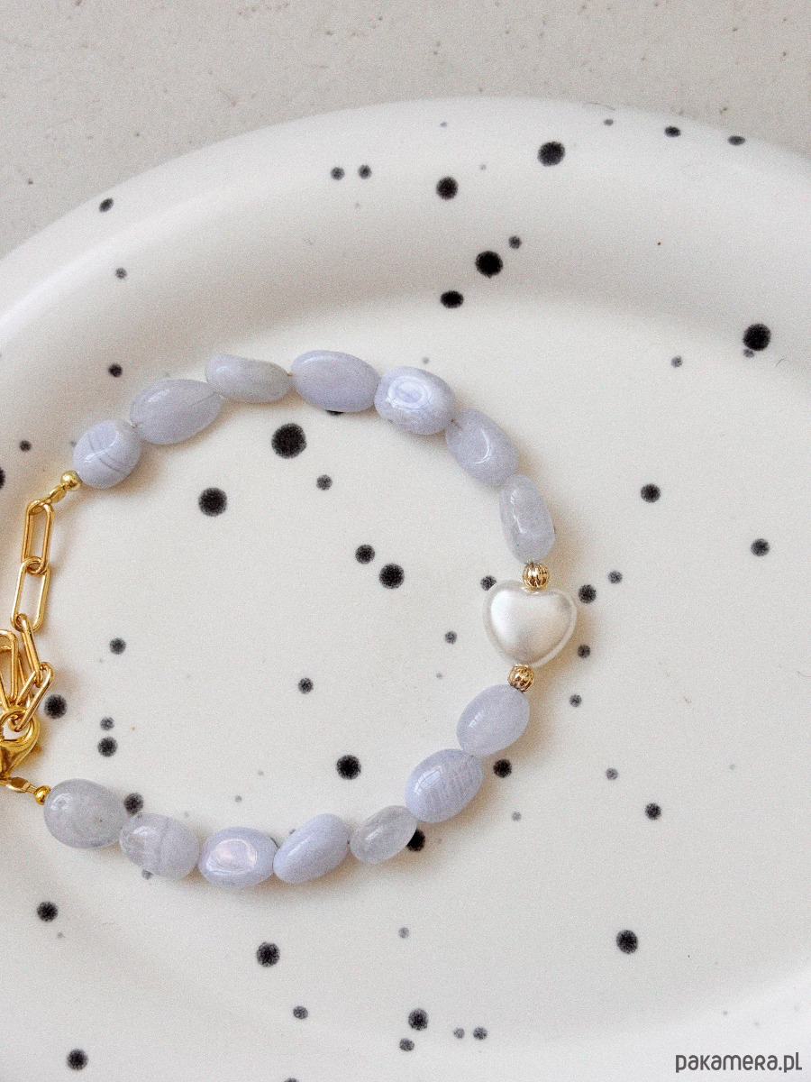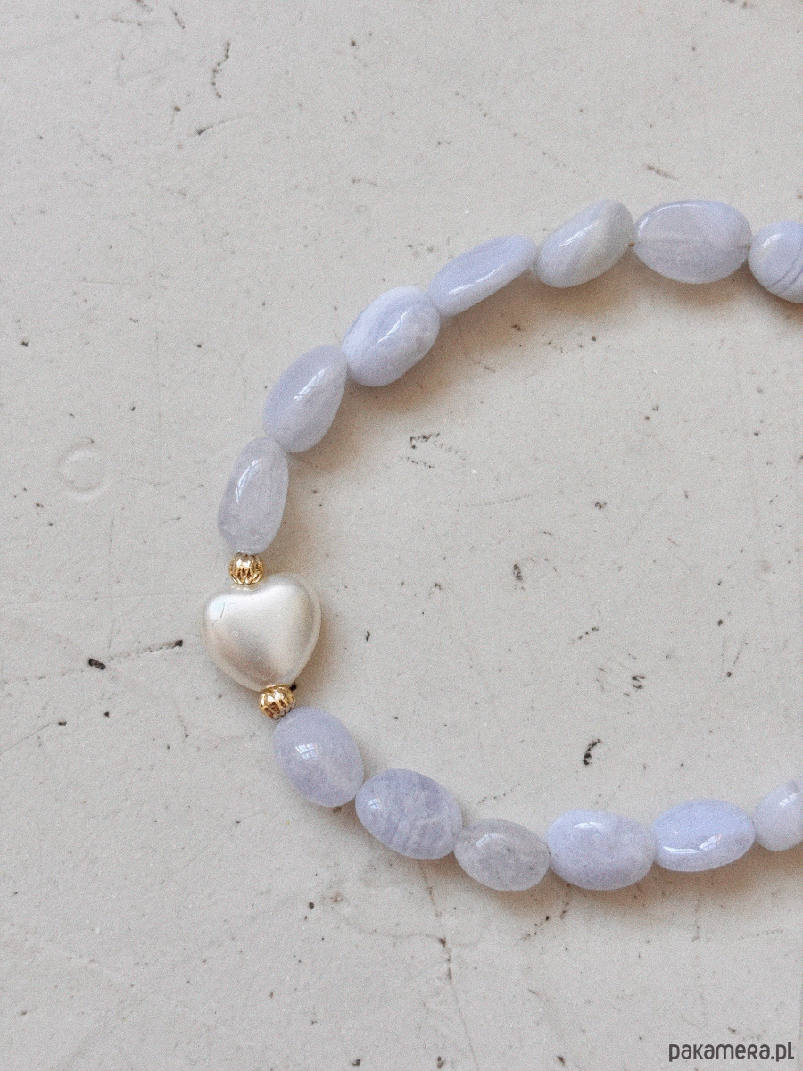 Bransoletka wykonana jest na lince jubilerskiej z chalcedonami i przekładką z kształcie serca, oraz zapięciem i łańcuszkiem ze stali ch.