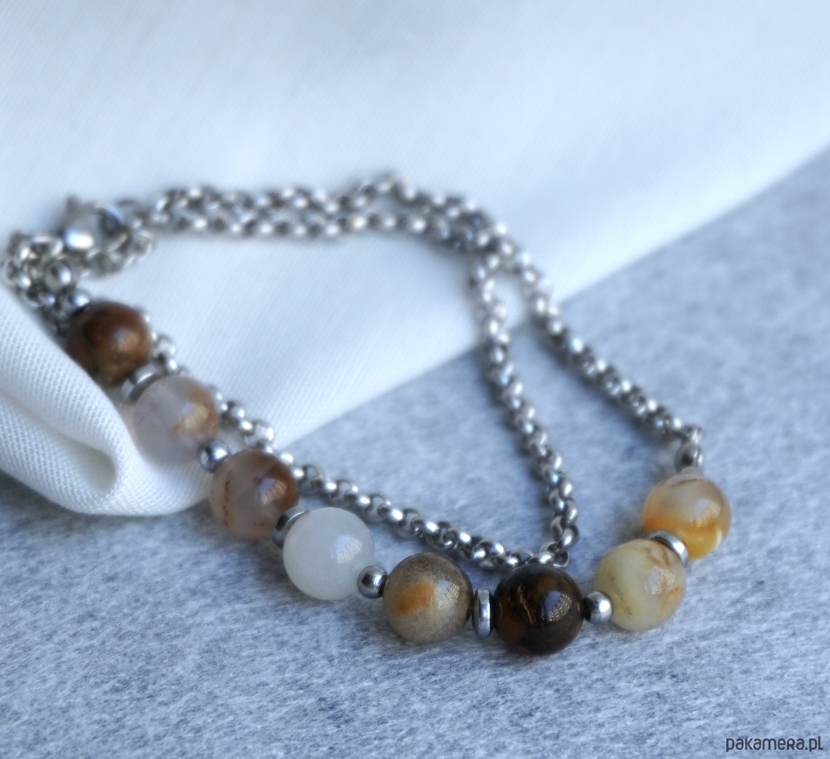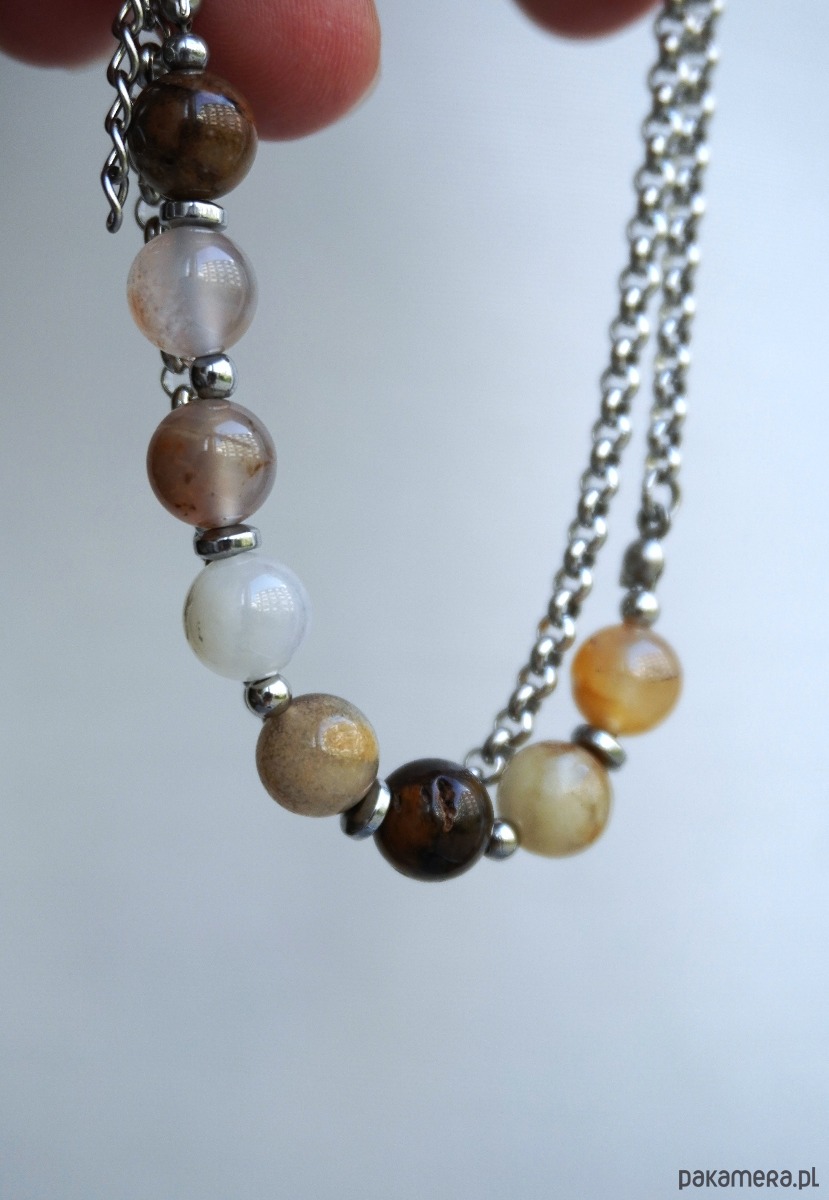 Ta bransoletka łączy w sobie naturalne ciepło kamienia i nowoczesną subtelność metalu. Delikatne, kuliste koraliki chalcedonu — od mlecznobiałych po bursztynowo-brązowe odcienie — harmonijnie współgrają z akcentami z hematytu.