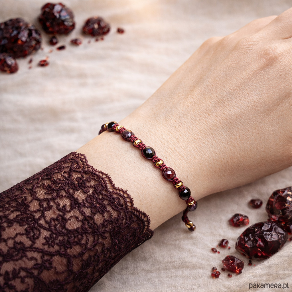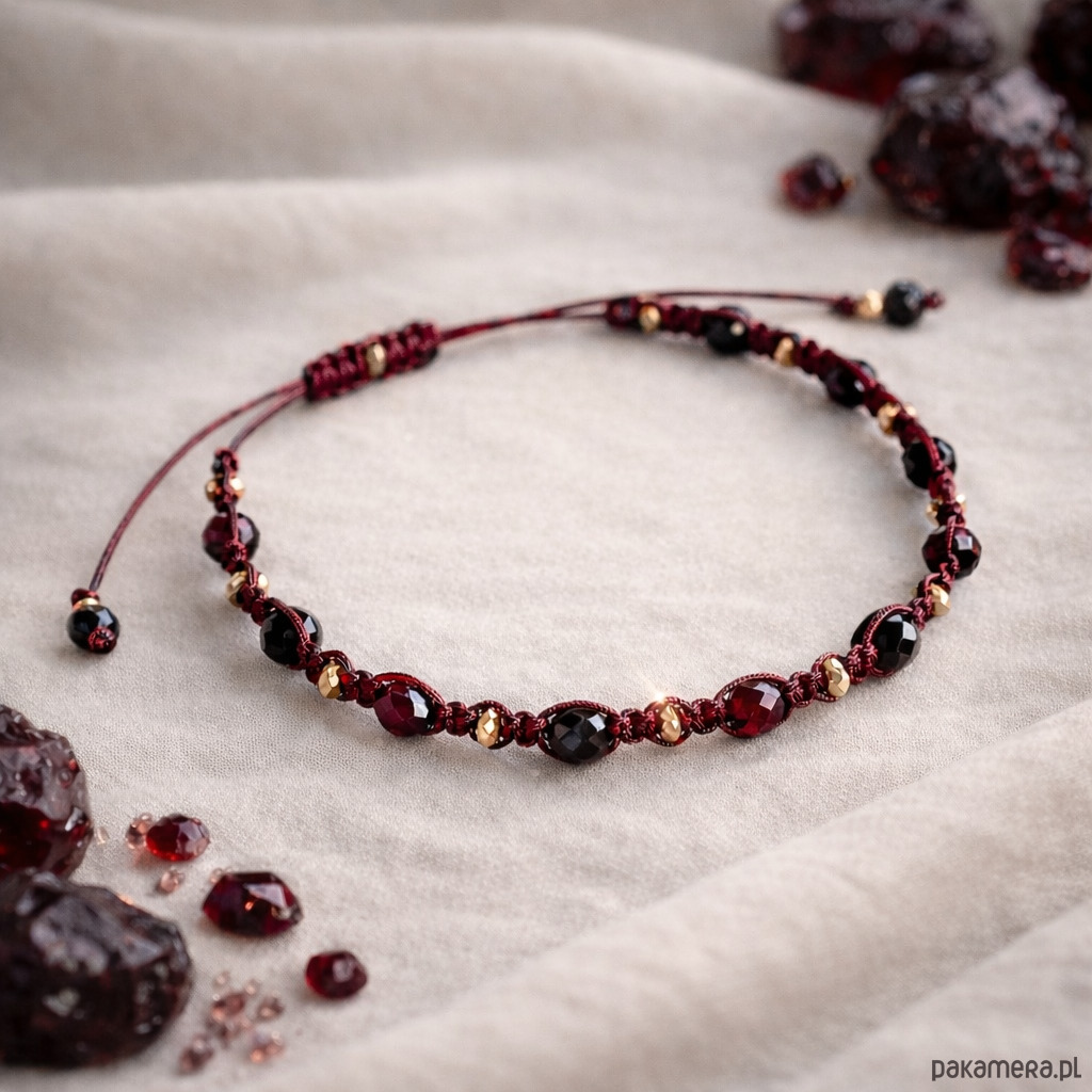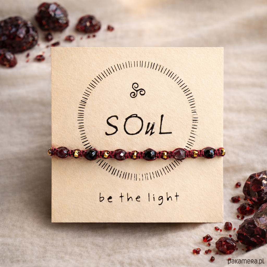 Głęboki odcień burgundowego sznurka pięknie koresponduje z winnym granatem, a czarny błysk onyksu i złoty hematyt podkreślają mistyczny charakter bransoletki.