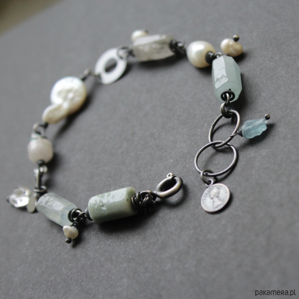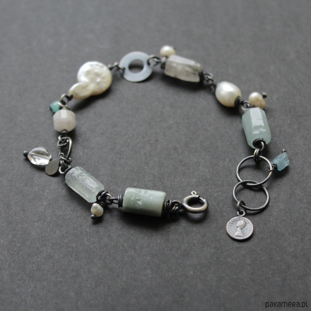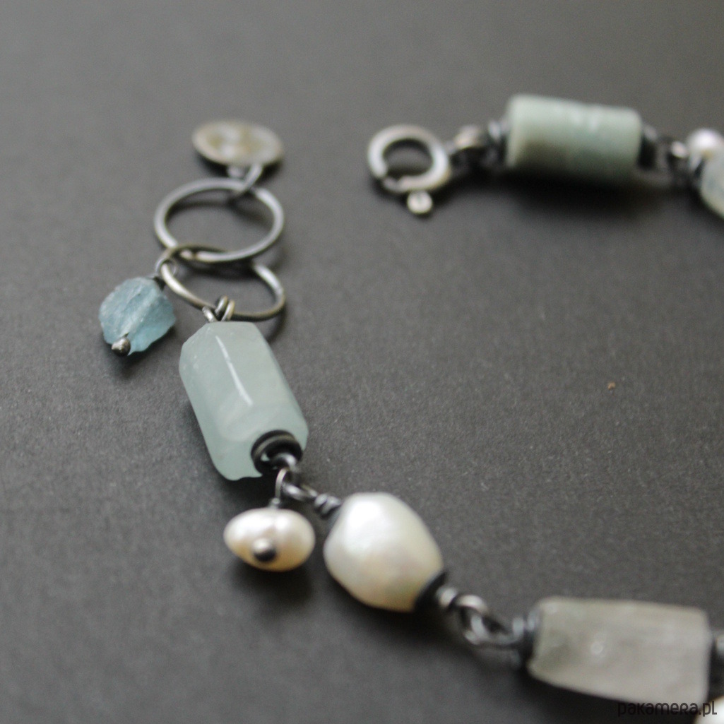 Bransoletka wykonana z minerałów jak amazonity i perły, subtelnie przełamana małymi naturalnymi perełkami, przyciąga spojrzenia swoją harmonią barw i elegancją, obok której nikt nie przejdzie obojętnie.