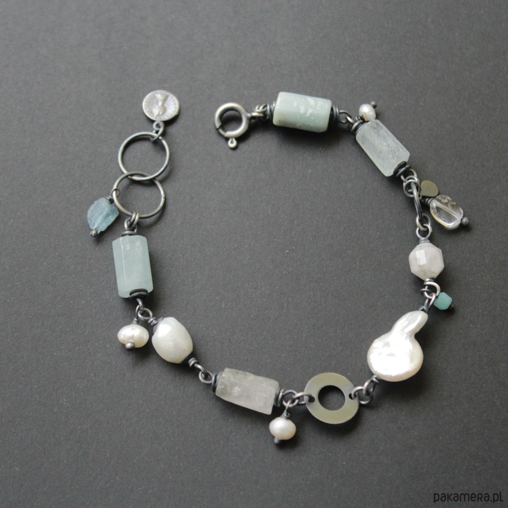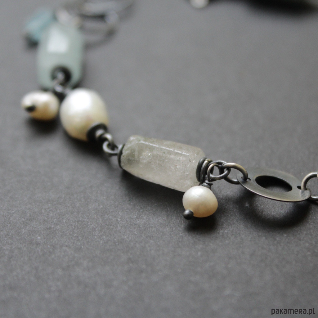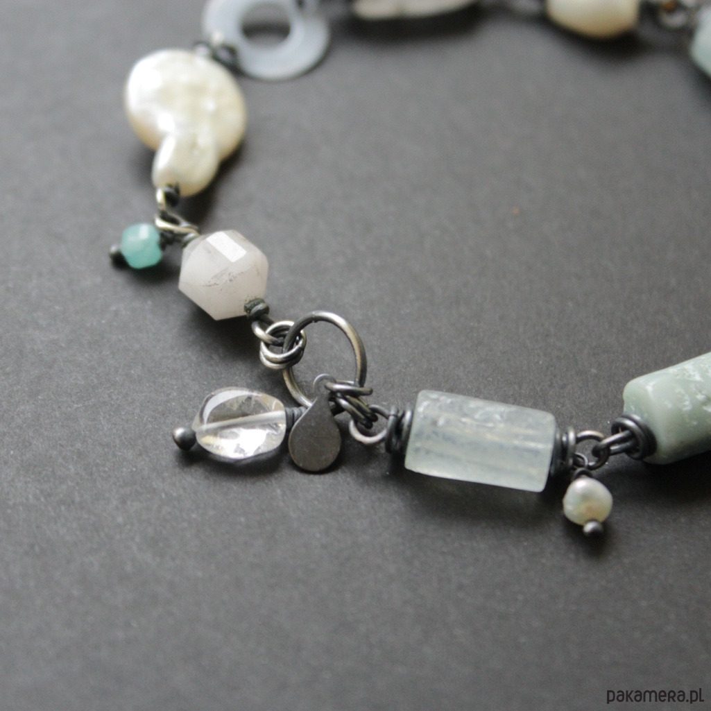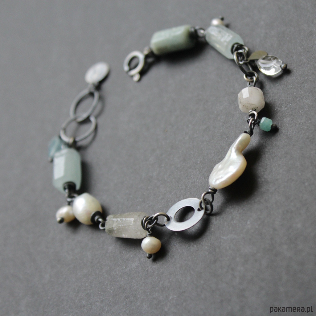 Bransoletka wykonana z minerałów jak amazonity i perły, subtelnie przełamana małymi naturalnymi perełkami, przyciąga spojrzenia swoją harmonią barw i elegancją, obok której nikt nie przejdzie obojętnie.