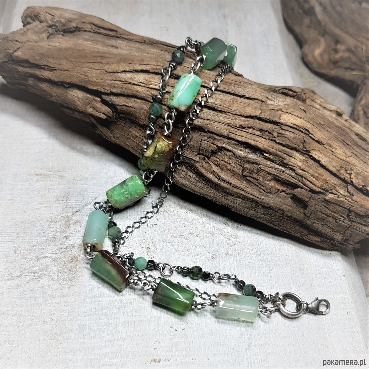Bransoletka wykonana z chryzoprazu w kształcie słupków 12-14 mm, oraz fasetowanych kulek 3mm naturalnych szmaragdów. Całość wykonana w srebrze 999, oraz 925, oksydowanym i wypolerowanym. Długość bransoletki wynosi ok. 20,5 cm, plus łańcuszek regulacyjny 3,5 cm.