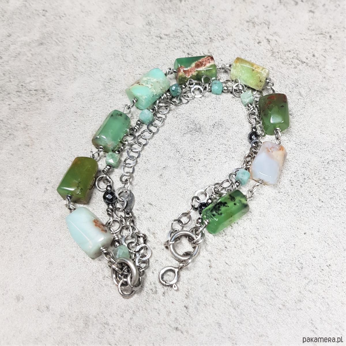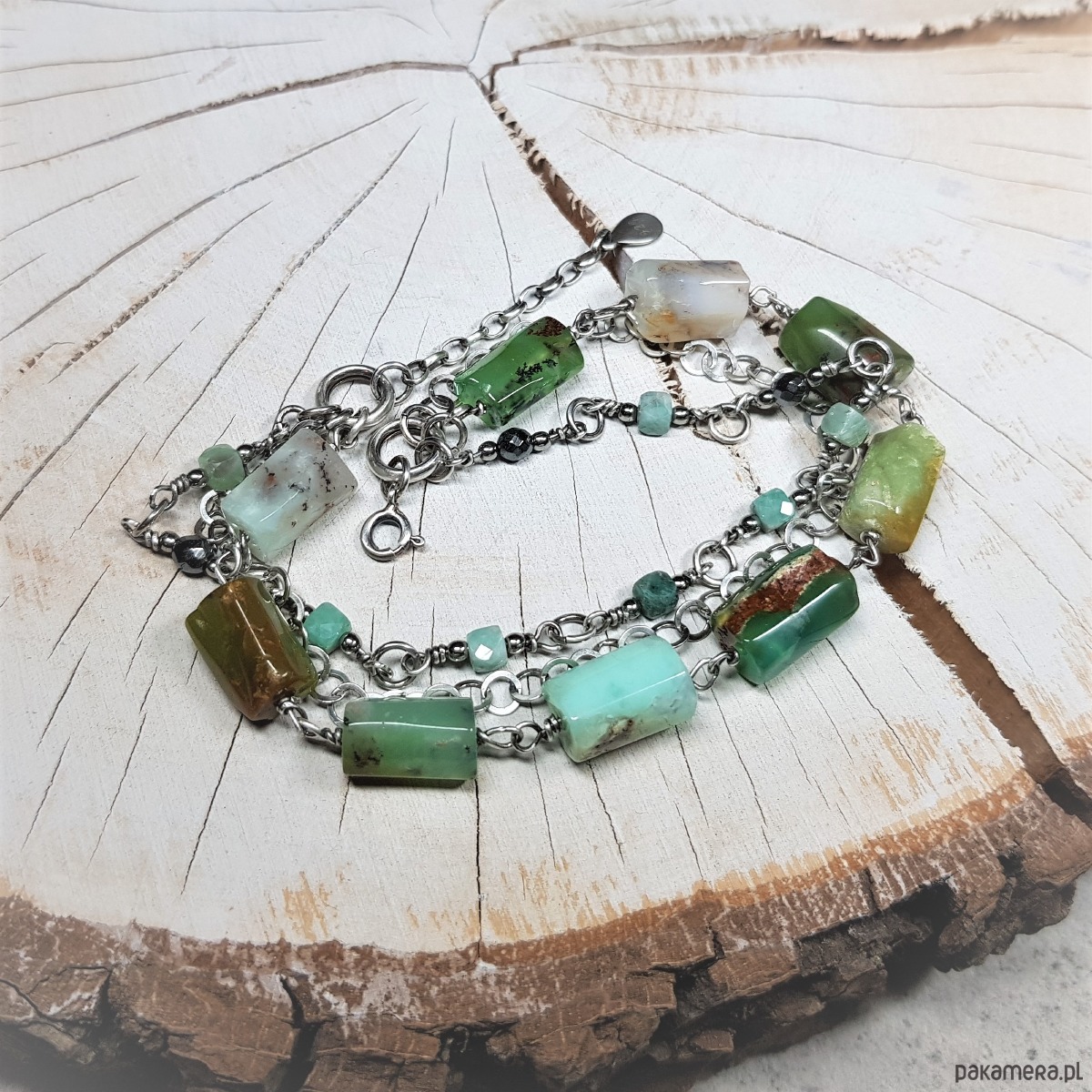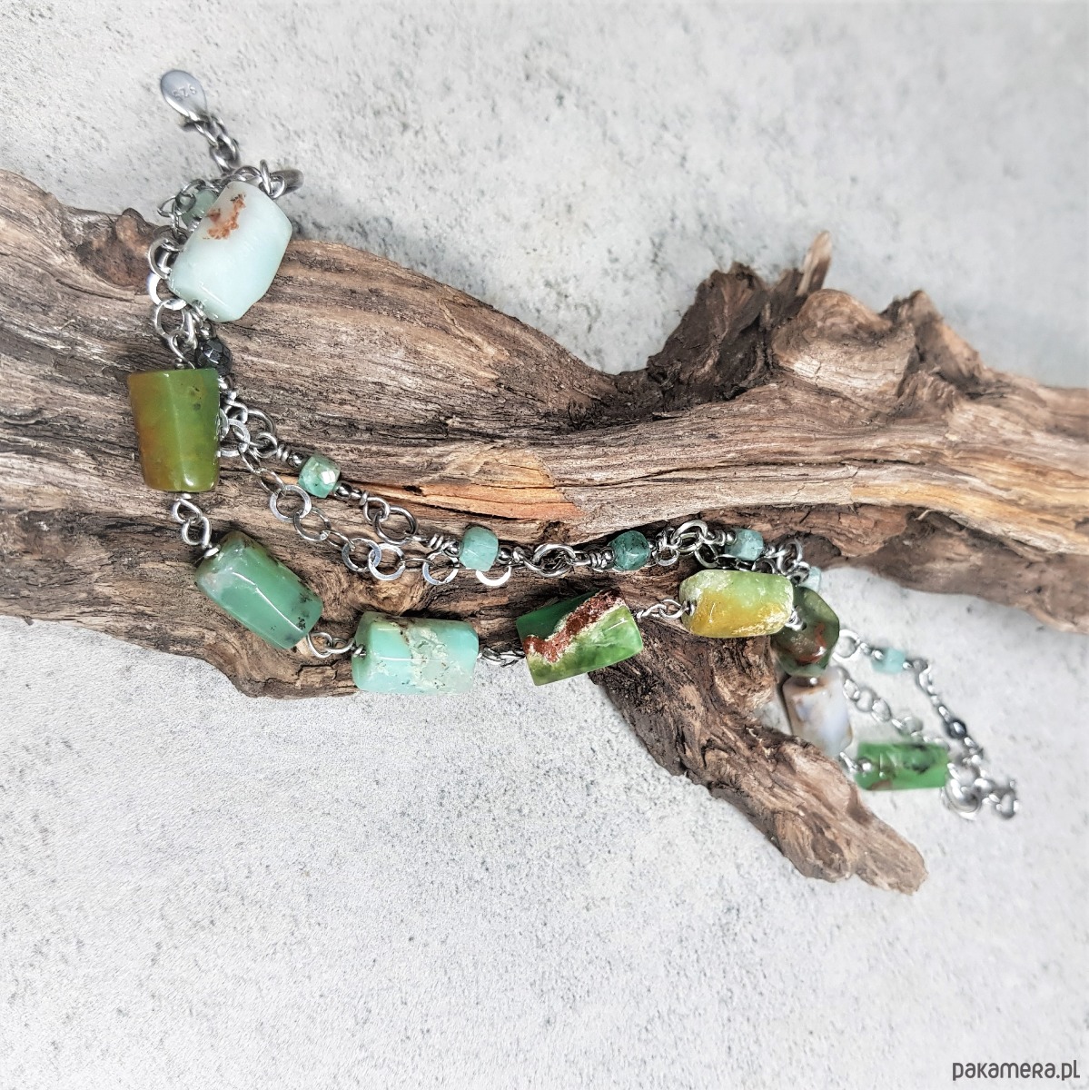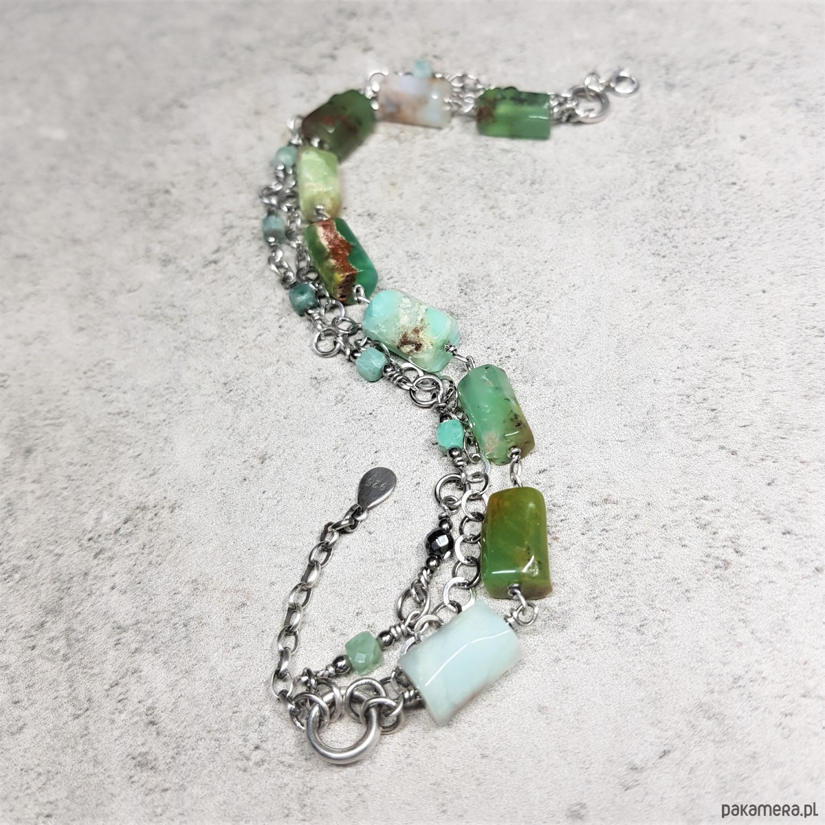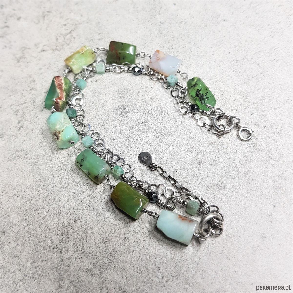 Bransoletka wykonana z chryzoprazu w kształcie słupków 12-14 mm, kostek 4mm naturalnych szmaragdów, oraz fasetowanych kulek hematytu. Całość wykonana w srebrze 999, oraz 925, oksydowanym i wypolerowanym. Długość bransoletki wynosi ok. 20 cm, plus łańcuszek regulacyjny 4,5 cm.