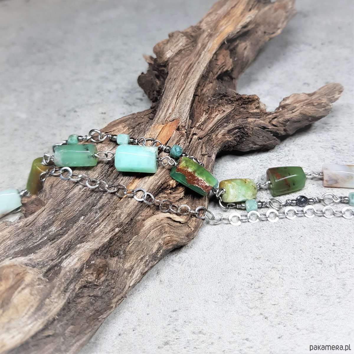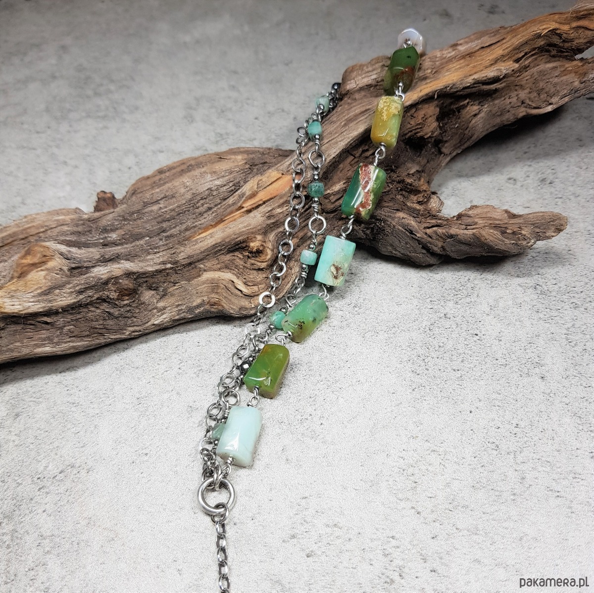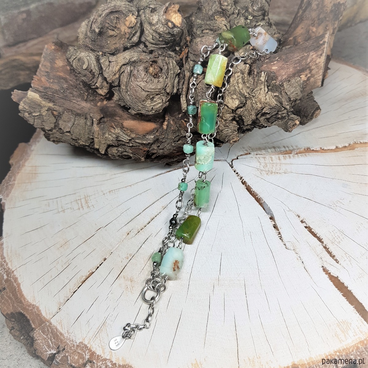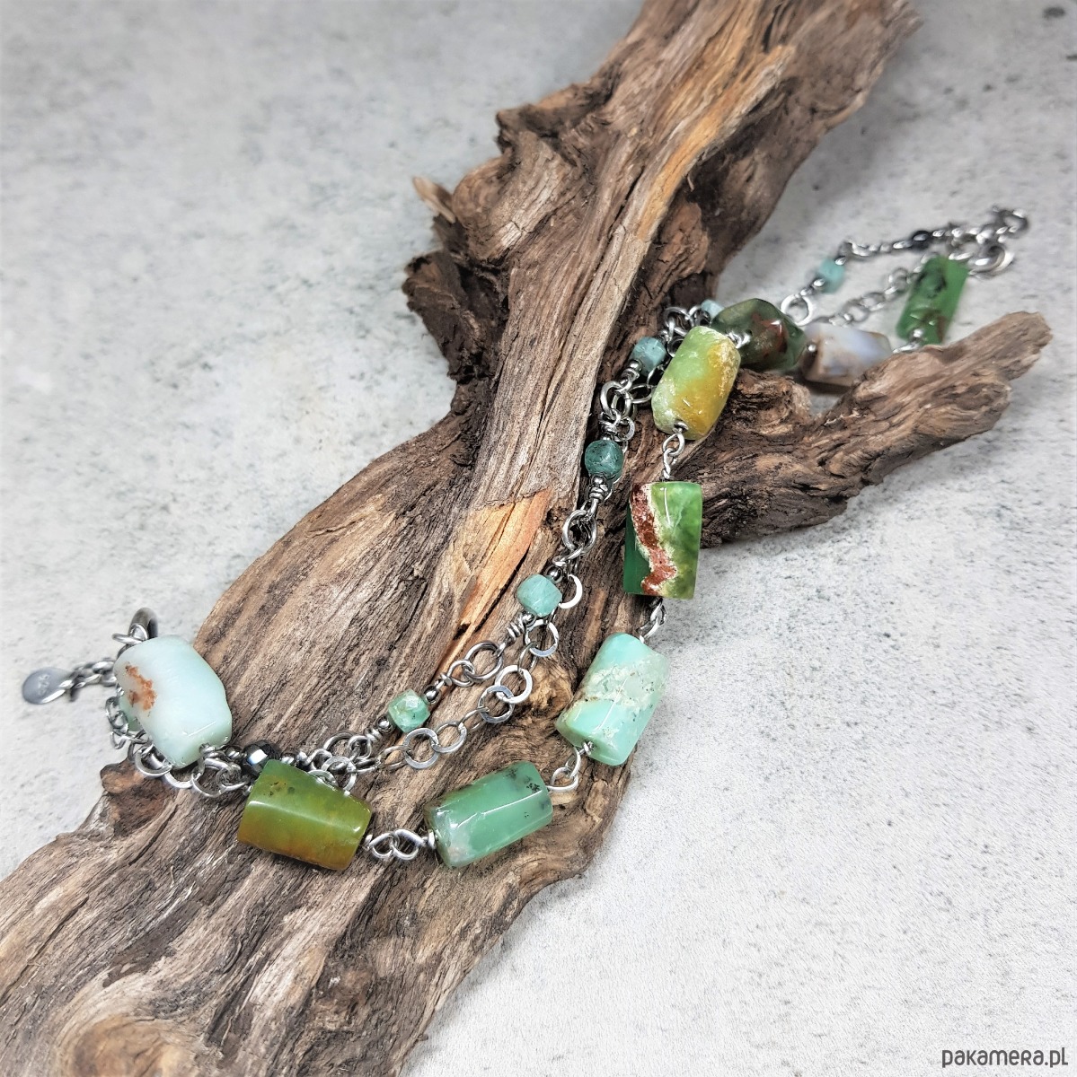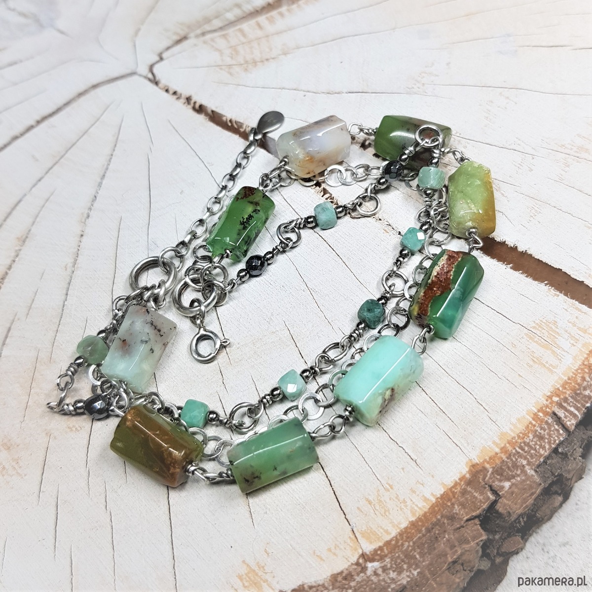 Bransoletka wykonana z chryzoprazu w kształcie słupków 12-14 mm, kostek 4mm naturalnych szmaragdów, oraz fasetowanych kulek hematytu. Całość wykonana w srebrze 999, oraz 925, oksydowanym i wypolerowanym. Długość bransoletki wynosi ok. 20 cm, plus łańcuszek regulacyjny 4,5 cm.