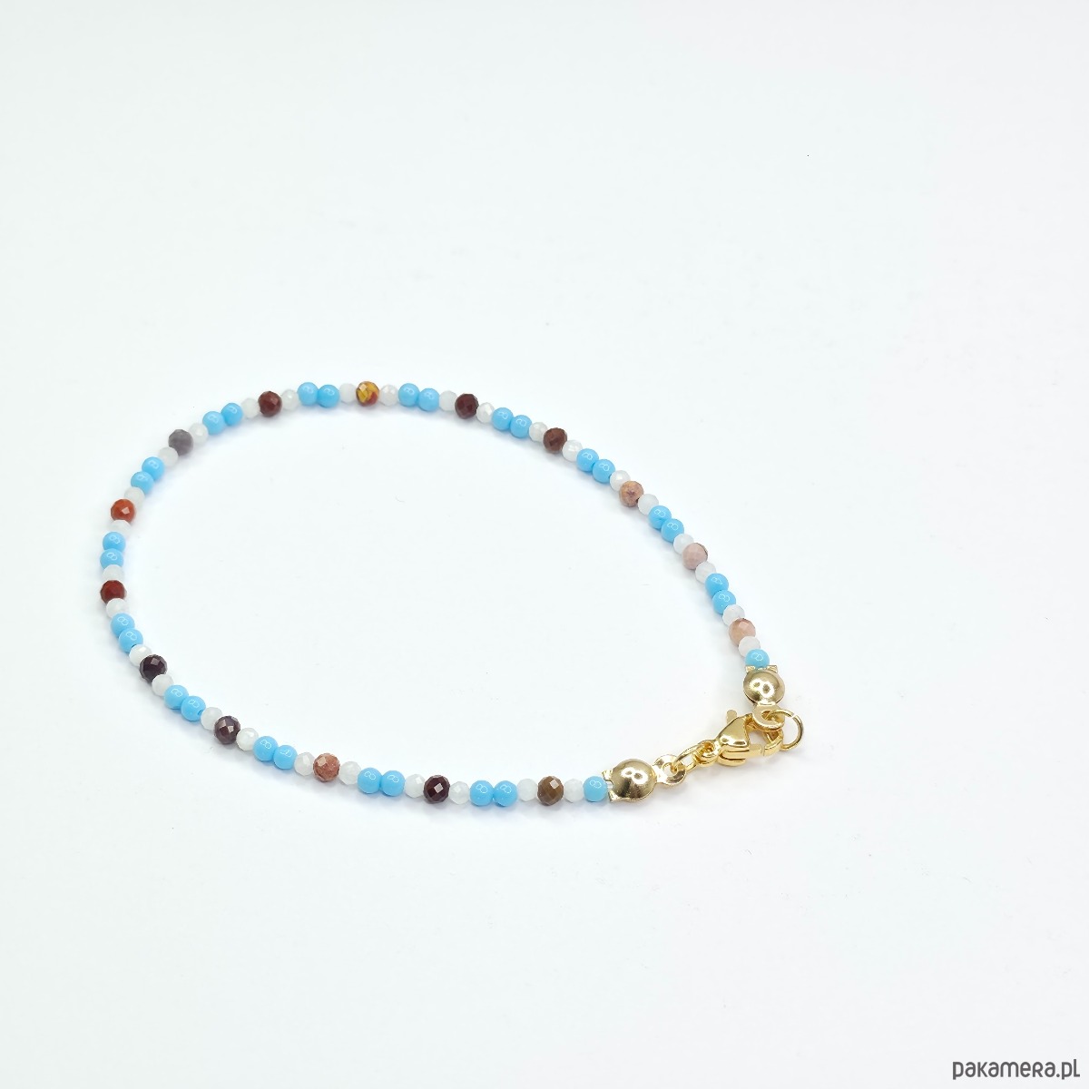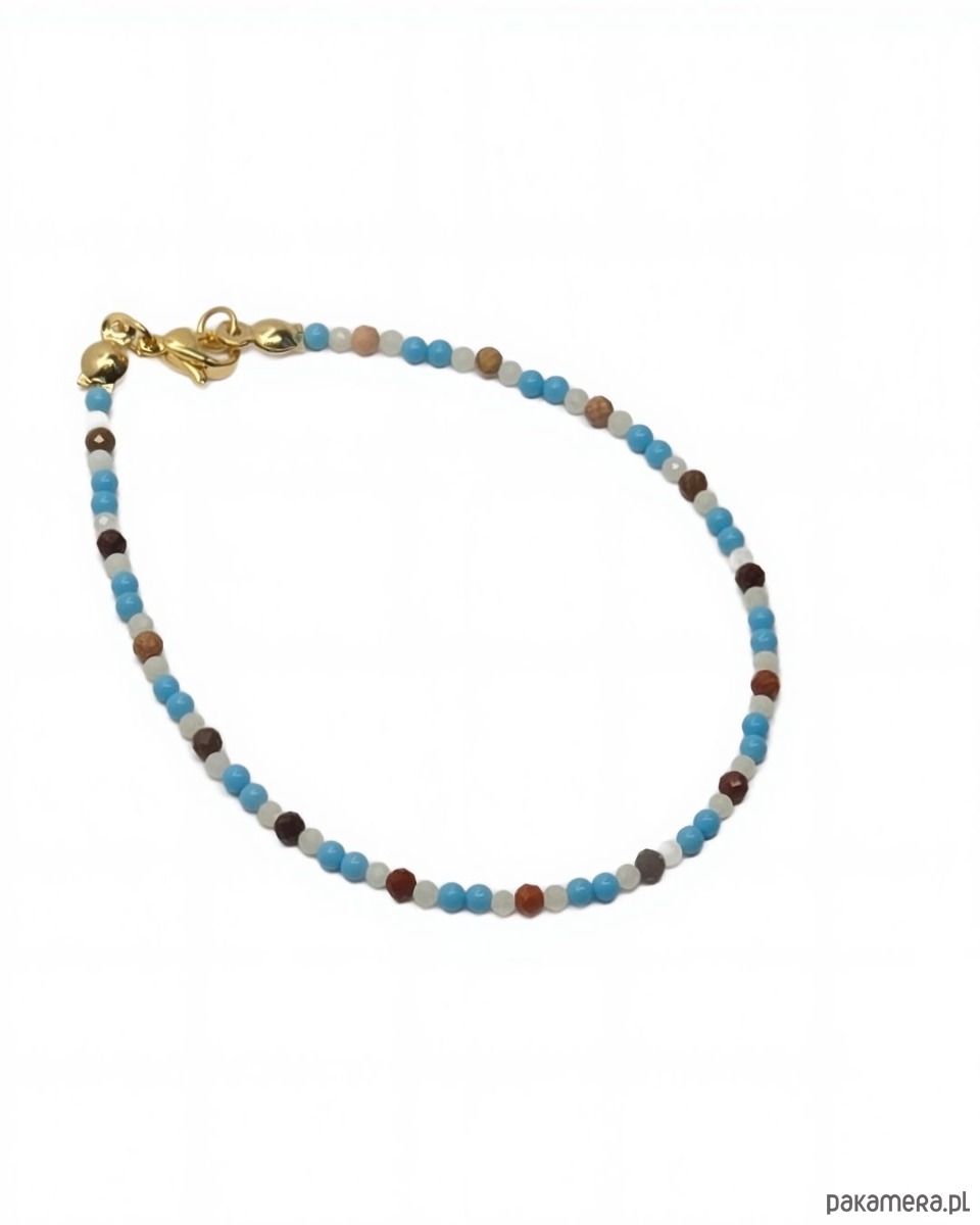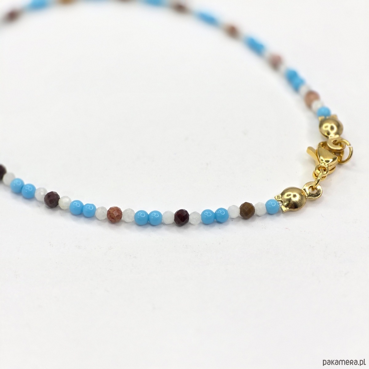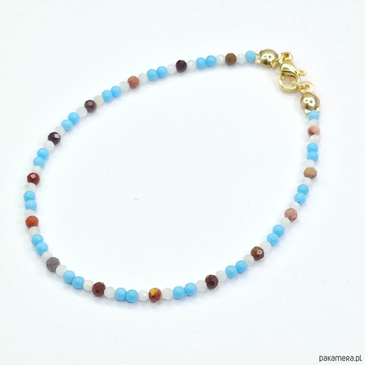 • Materiały: Magnezyt, Jaspis Mokait, Kamień księżycowy, pozłacana stal chirurgiczna, żyłka wędkarska Fluorocarbon.