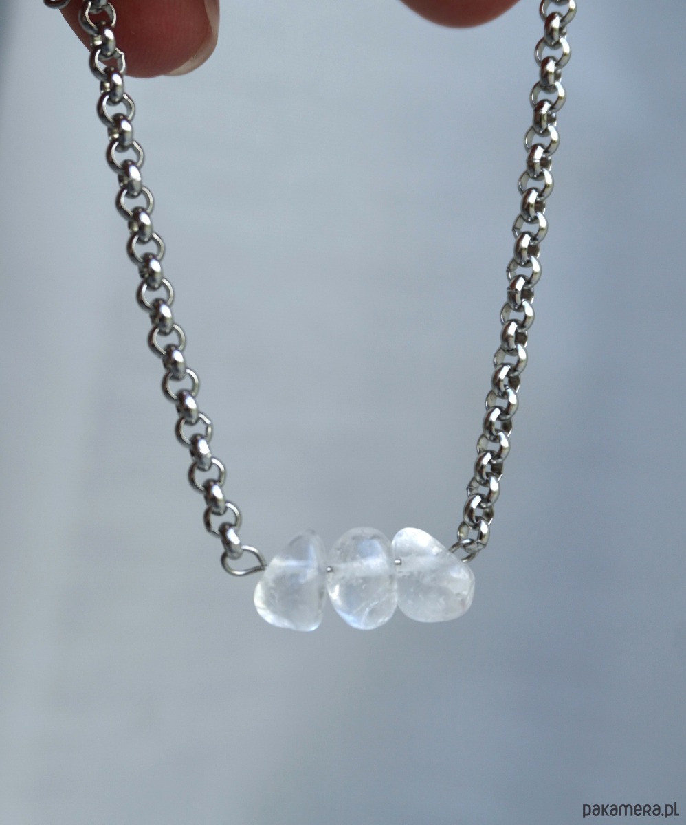 Przezroczysty kamień w swojej naturalnej formie odbija światło subtelnymi refleksami, tworząc wrażenie czystości i harmonii.