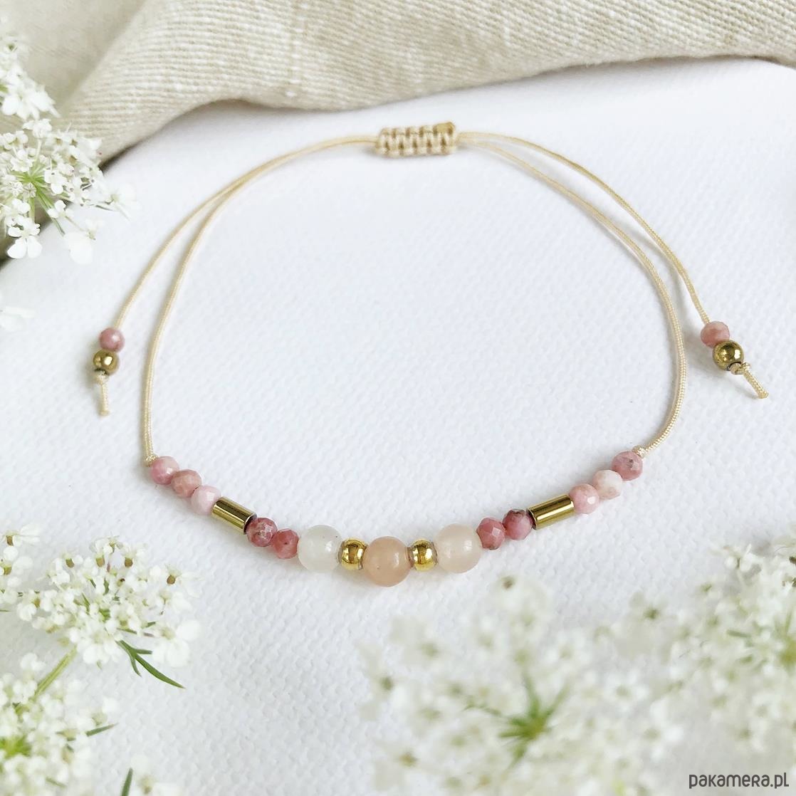 Bardzo kobieca, delikatna bransoletka z kamieni naturalnych na nylonowym sznurku w kolorze beżowym.