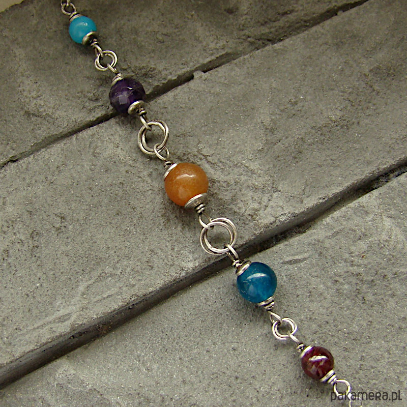 Kolorowa, kobieca, subtelna bransoletka na co dzień. Wykonana w całości ze srebra próby 925 oraz kulek jadeitu, ametystu i granatu wielkosci 6-4 mm. Całkowita długość bransoletki regulowana 18 - 21 cm. W mojej galerii kolczyki do kompletu. Ozdobnie zapakowana.