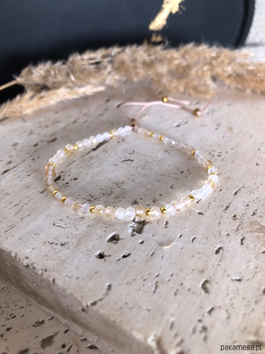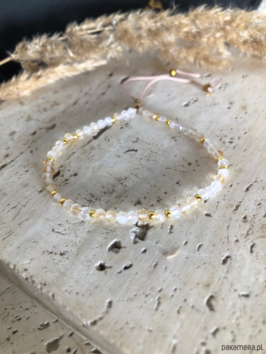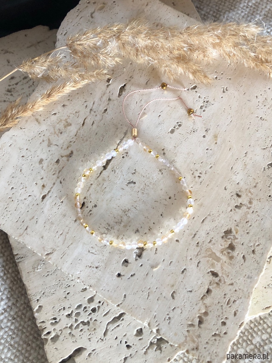 Bransoletka wykonana z kamieni naturalnych. Na nić jedwabną nawleczono cytryn o średnicy 3 mm, kuleczki ze stali chirurgicznej oraz szklane kryształki. Rozmiar można regulować za pomocą przesuwanego stopera z gumką w środku.