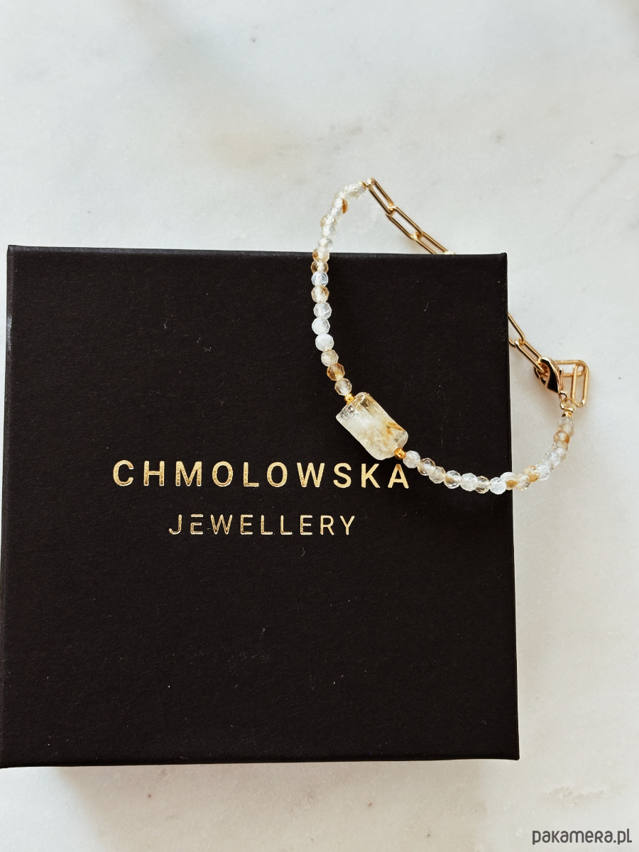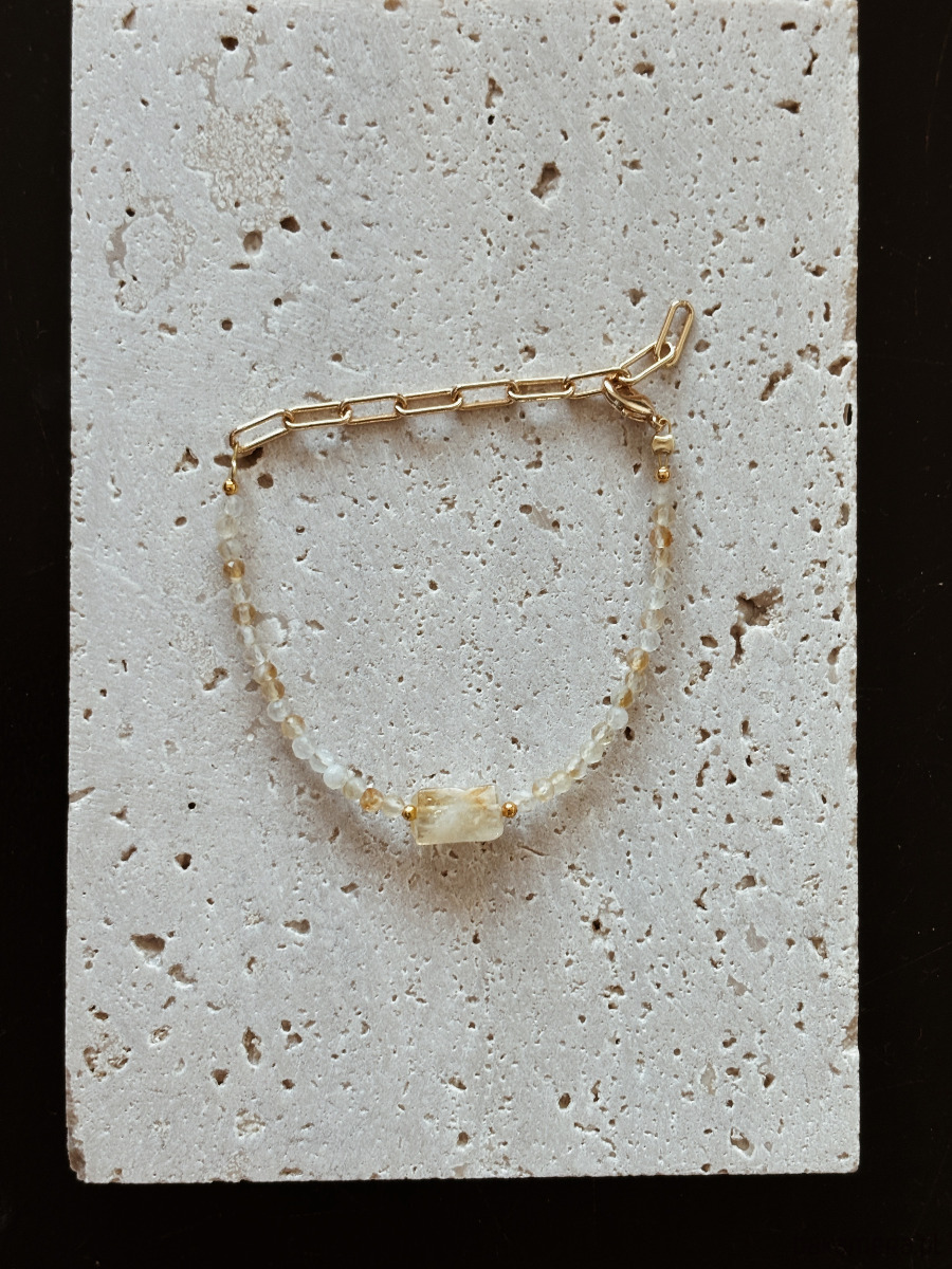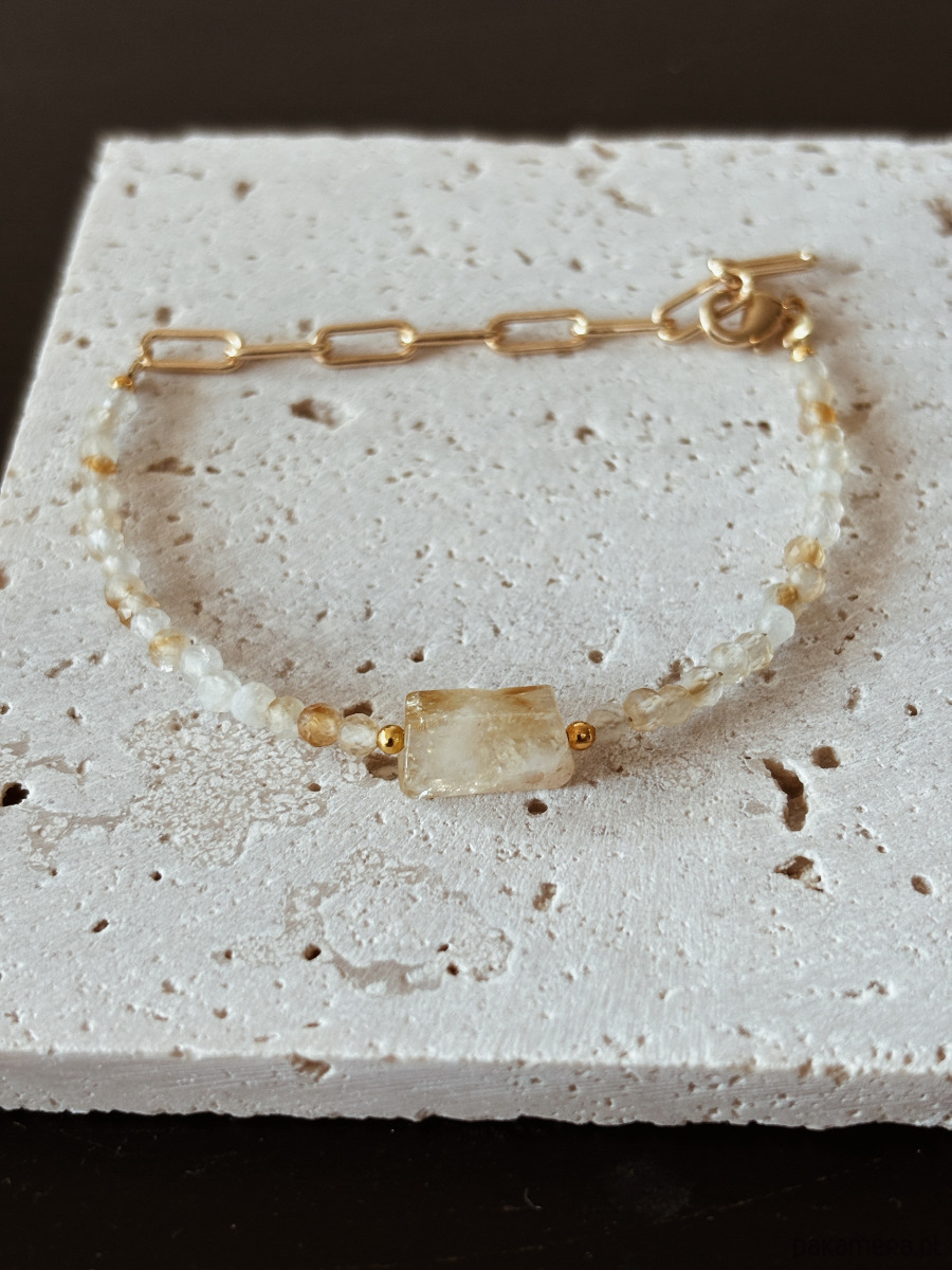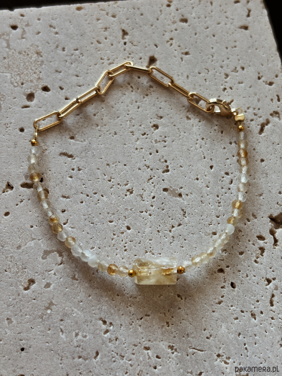 Bransoletka wykonana jest na lince jubilerskiej z użyciem cytrynu fasetowanego i surowego cytrynu, zapięcie i łańcuszek są rodowane złotem.