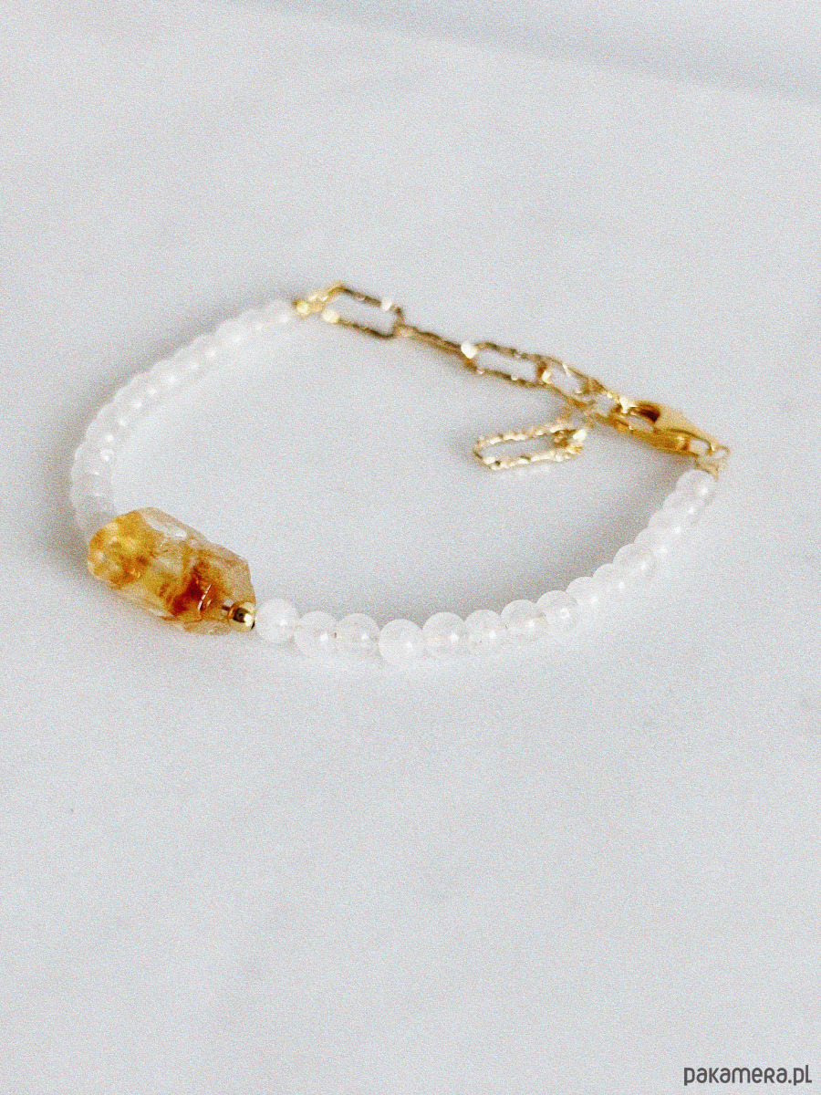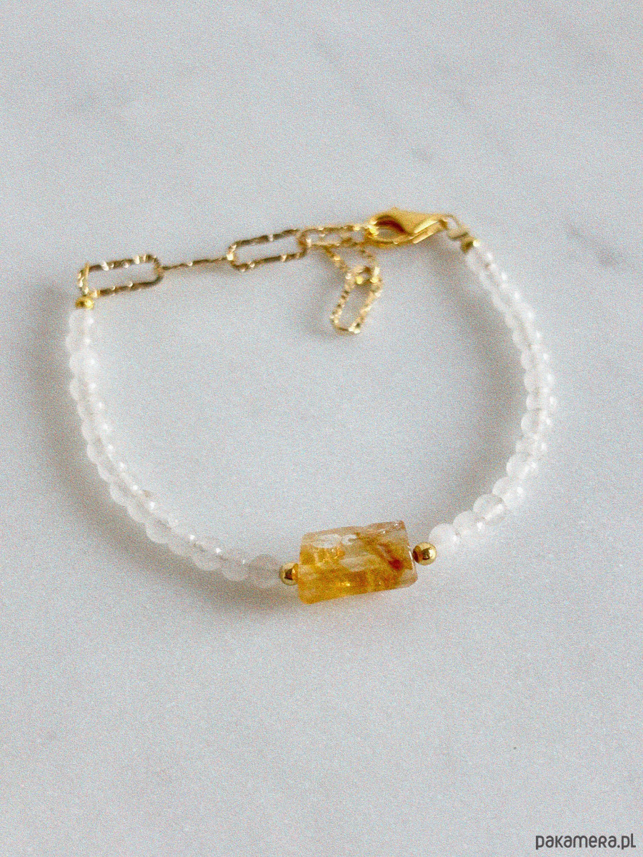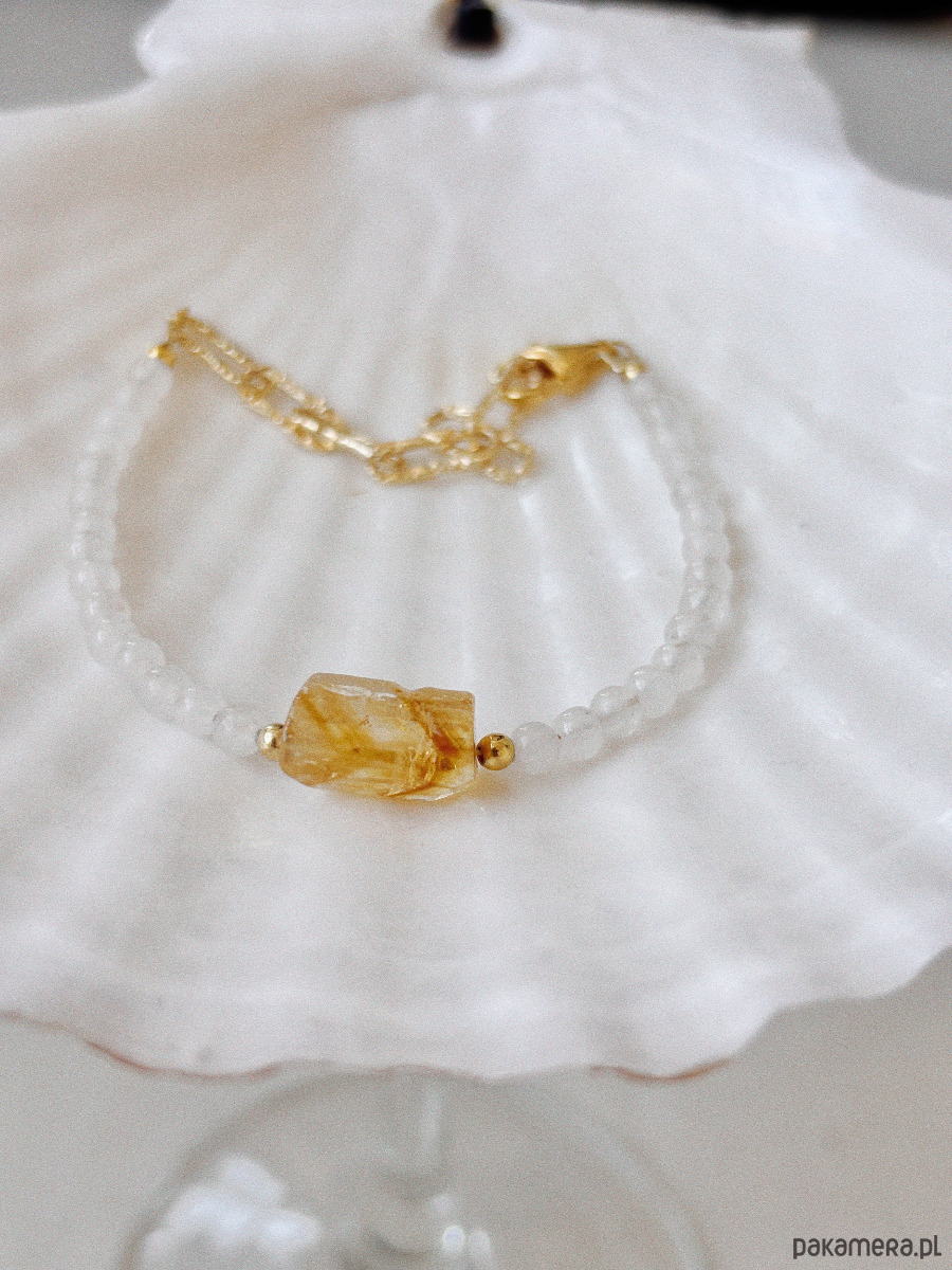 Bransoletka wykonana jest na lince jubilerskiej z użyciem jadeitu i surowego cytrynu, zapięcie i łańcuszek są rodowane złotem.
