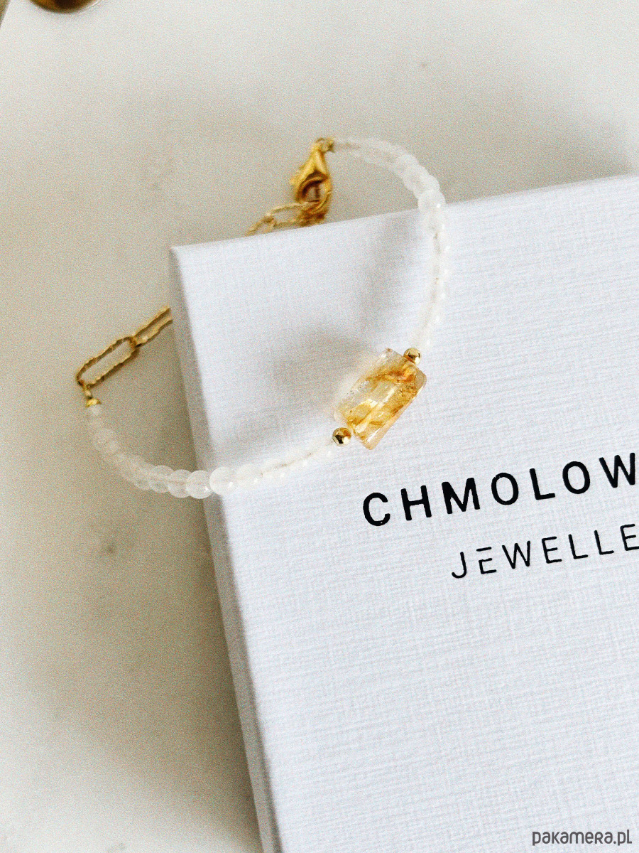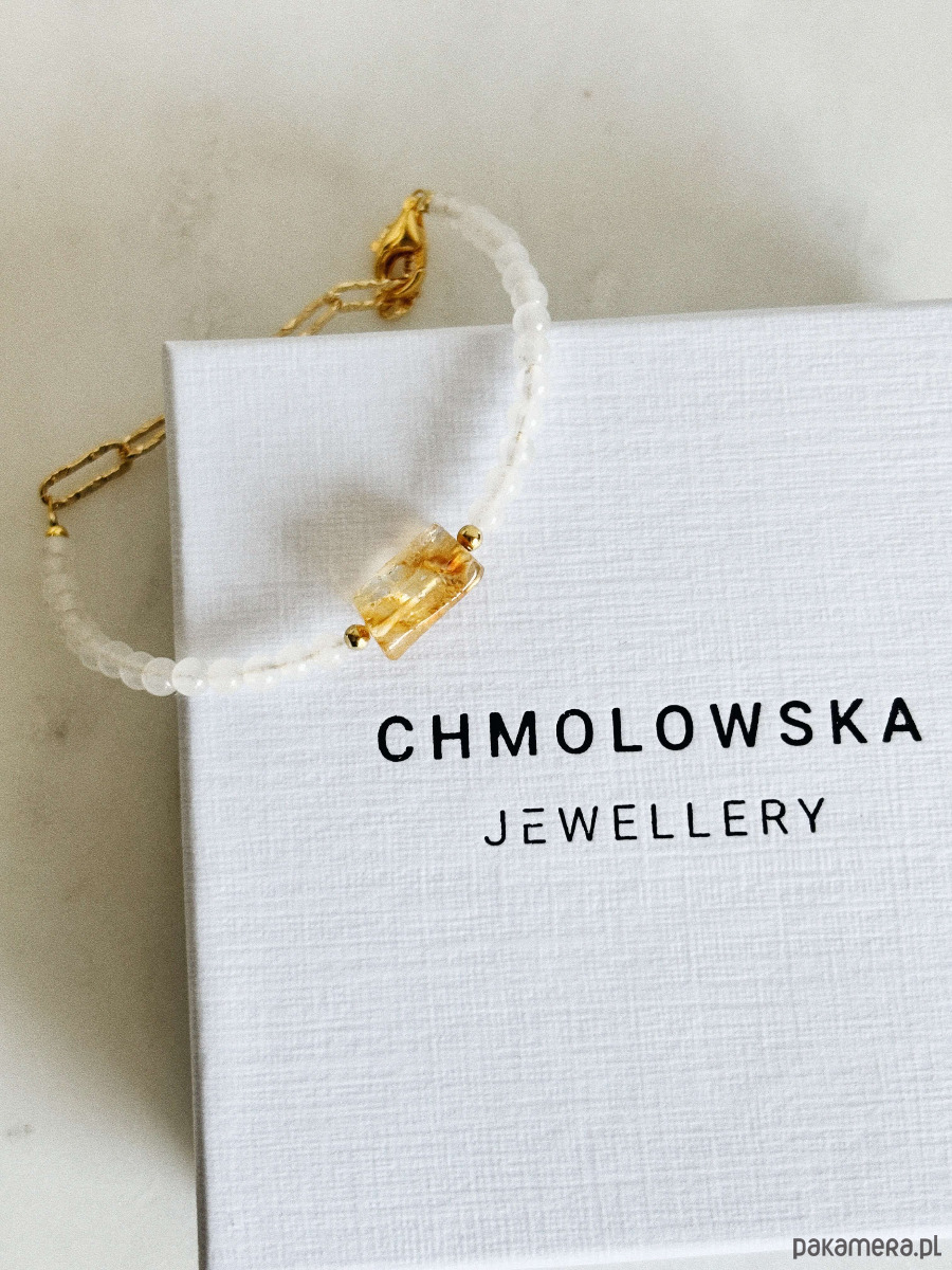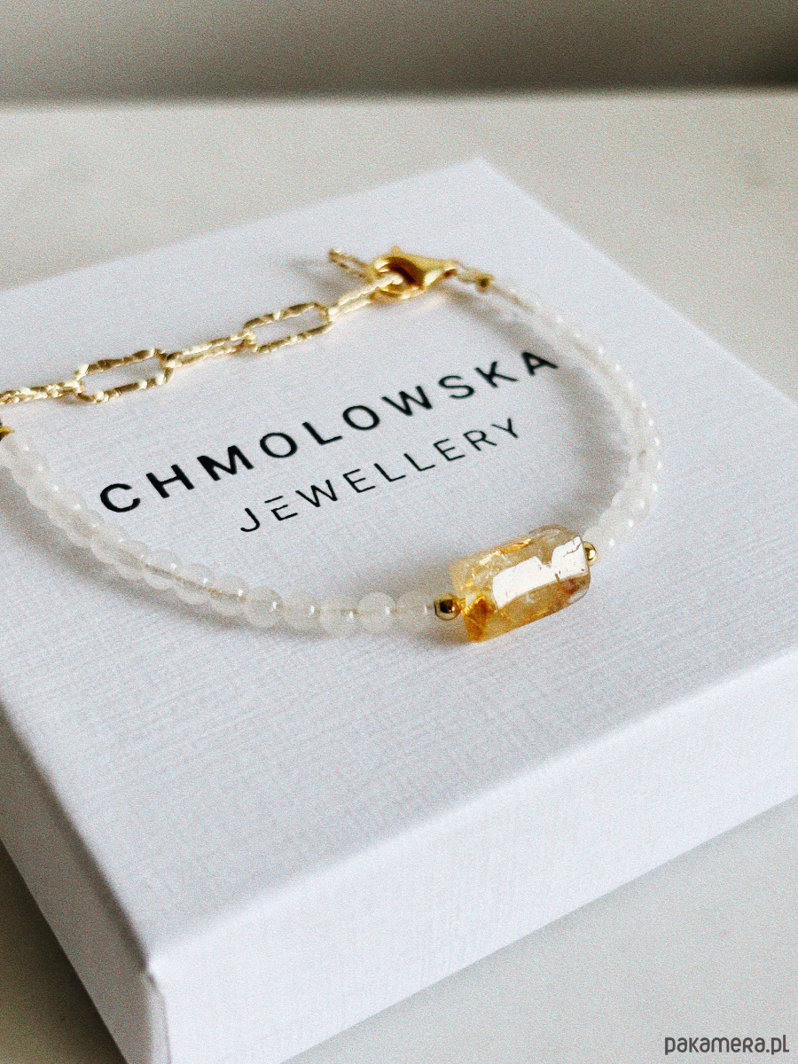 Bransoletka wykonana jest na lince jubilerskiej z użyciem jadeitu i surowego cytrynu, zapięcie i łańcuszek są rodowane złotem.
