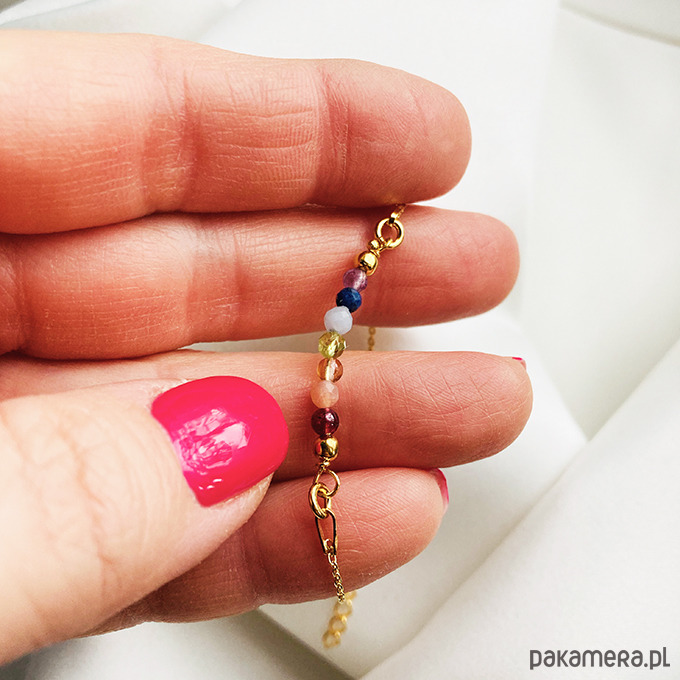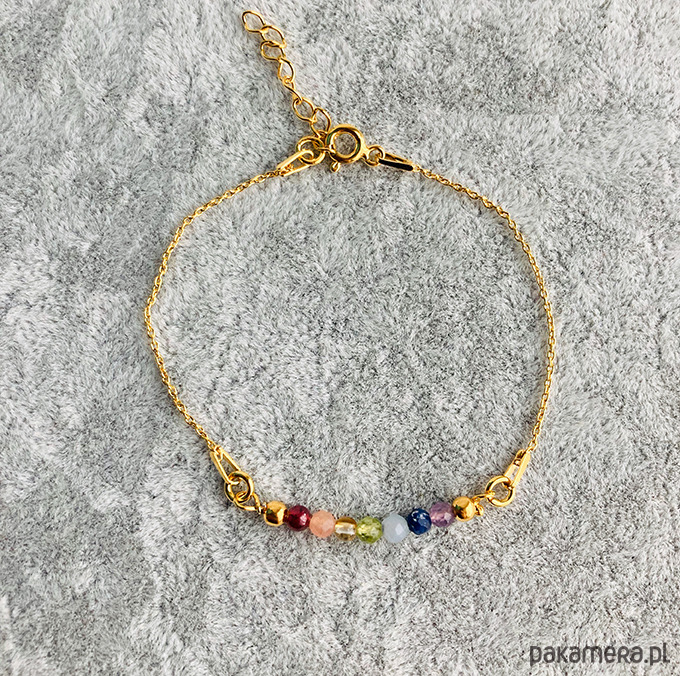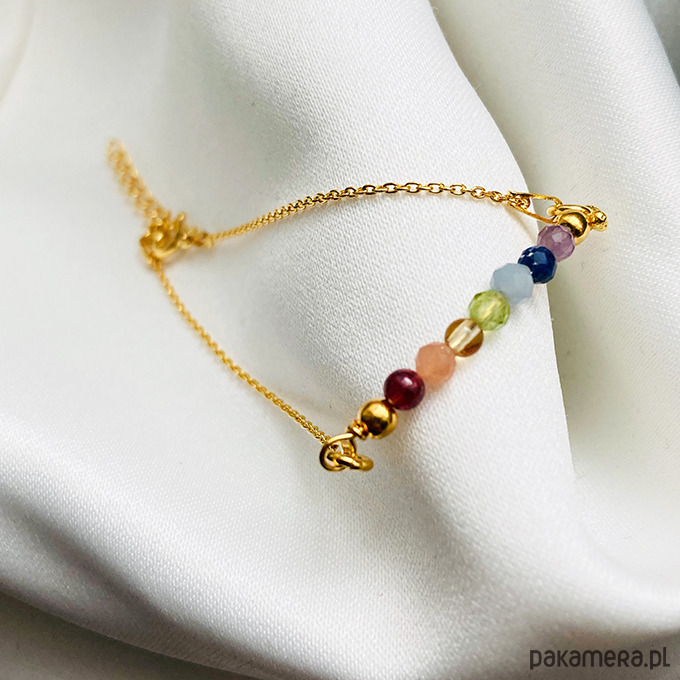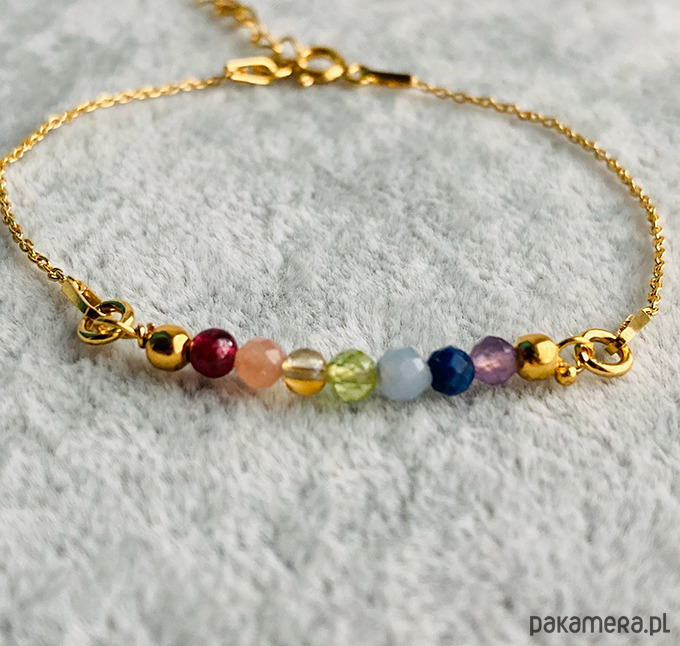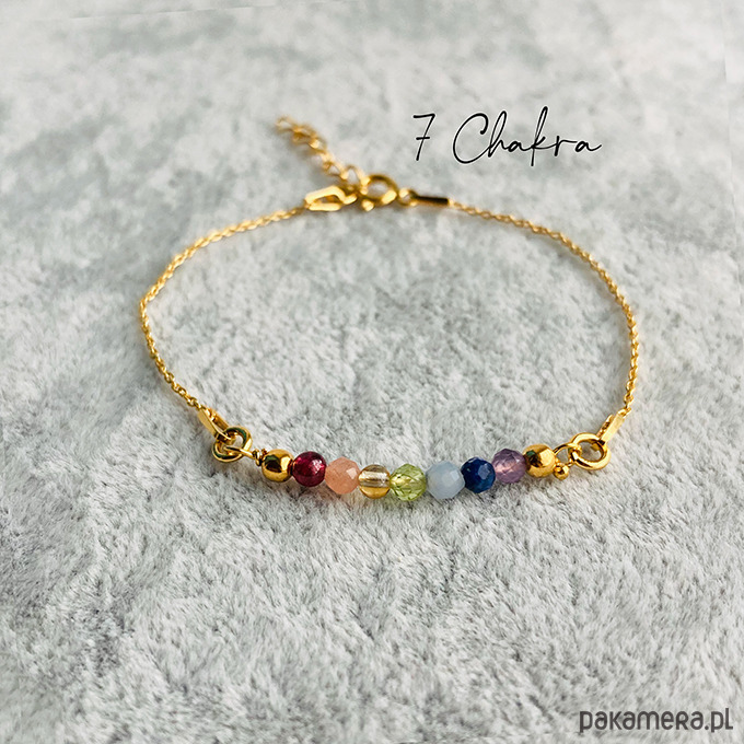 Delikatna bransoletka z kamieni w kolorach reprezentujących wszystkie 7 czakr: ametyst, lapis lazuli, angelit, oliwin, kamień słoneczny i granat. Pięknie wygląda łączona z innymi bransoletkami z kolekcji .